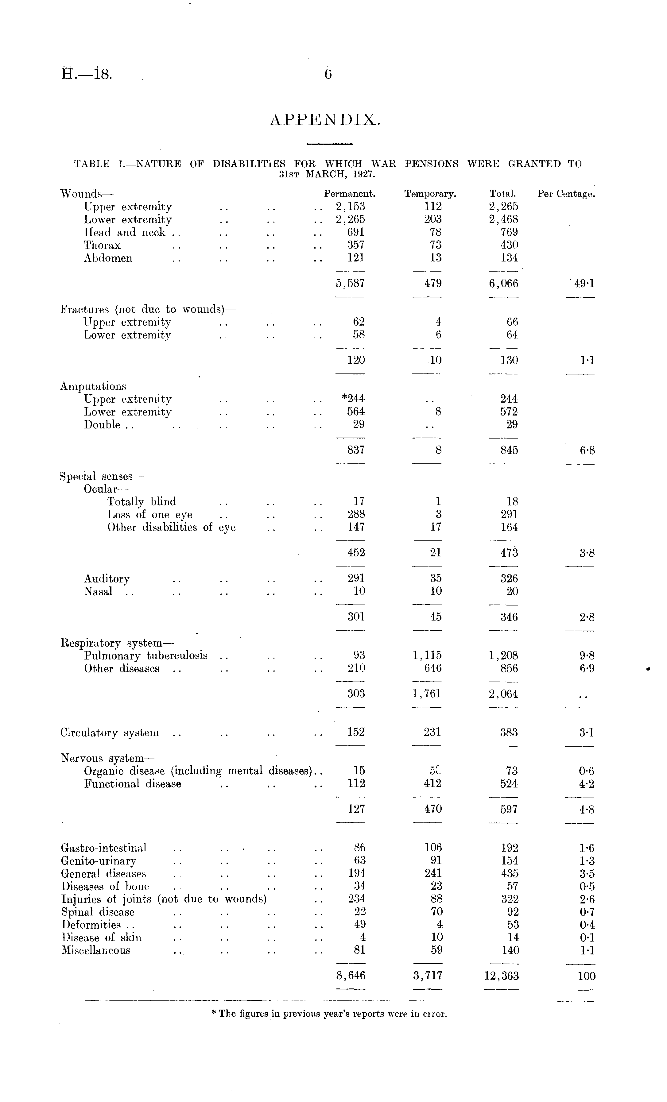 APPENDIX. TABLE X.—NATURE OF DISABILITIES FOB WHICH WAR PENSIONS WERE GRANTED TO 31st MARCH, 1927. Wounds — Permanent. Temporary. Total. Per Centage. Upper extremity .. .. .. 2,153 112 2,265 Lower extremity .. .. 2,265 203 2,468 Head and neck . . .. .. .. 691 78 769 Thorax . . . . .. 357 73 430 Abdomen .. .. .. .. 121 13 134 5,587 479 6,066 "49-1 Fractures (not due to wounds)— Upper extremity .. . . 62 4 66 Lower extremity . . . . .58 6 64 120 10 130 1 1 Amputations — Upper extremity . . . . *244 .. 244 Lower extremity . . . . . . 564- 8 572 Double .. .. . .. . . .. 29 .. 29 837 8 845 6-8 Special senses — Ocular — Totally blind . . .. .. 17 1 18 Loss of one eye .. . . . . 288 3 291 Other disabilities of eye .. . . 147 17 164 452 21 473 3-8 Auditory .. .. .. .. 291 35 326 Nasal .. .. .. .. .. 10 10 20 301 45 346 2-8 Respiratory system — Pulmonary tuberculosis .. .. .. 93 1,115 1,208 9-8 Other diseases .. .. .. . . 210 646 856 6-9 303 1,761 2,064 Circulatory system .. .. .. ~ 152 231 383 3-1 Nervous system — Organic disease (including mental diseases).. 15 5C 73 0-6 Functional disease .. .. .. 112 412 524 4-2 127 470 597 4-8 Gastro-intestinal .. ... .. .. 86 106 192 1-6 Genito-urinary .. .. .. 63 91 154 1-3 General diseases .. .. .. 194 241 435 3-5 Diseases of bone . . .. .. 34 23 57 0-5 Injuries of joints (not due to wounds) .. 234 88 322 2-6 Spinal disease . . . . .. . . 22 70 92 0-7 Deformities .. .. .. .. .. 49 4 53 0-4 Disease of skin .. .. . . . . 4 10 14 0-1 Miscellaneous ... .. .. .. 81 59 140 1-1 8,646 3,717 12,363 100 * The figures in previous year's reports were in error.