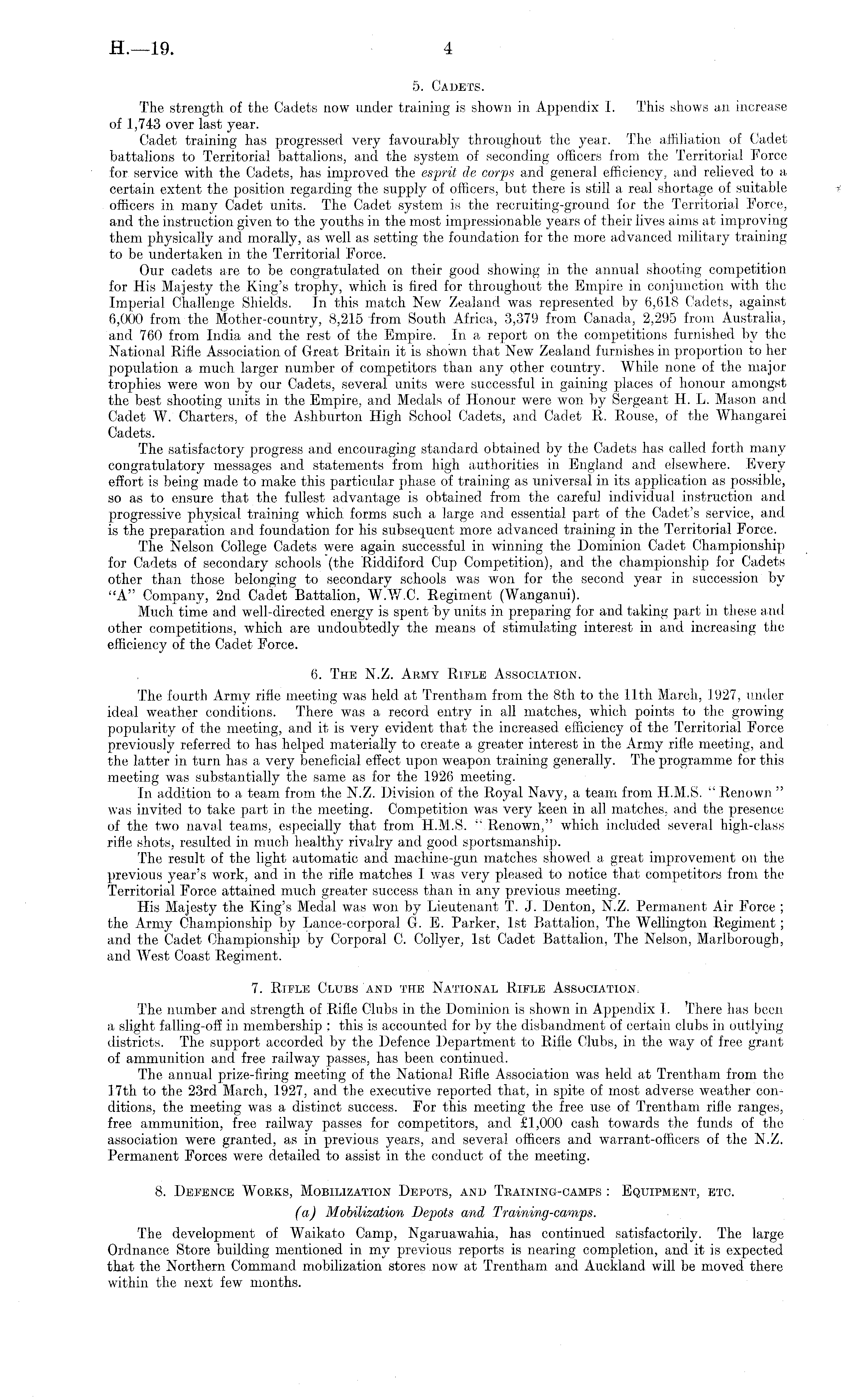 5. Cadets. The strength of the Cadets now under training is shown in Appendix I. This shows an increase of 1,743 over last year. Cadet training has progressed very favourably throughout the year. The affiliation of Cadet battalions to Territorial battalions, and the system of seconding officers from the Territorial Force for service with the Cadets, has improved the esprit de corps and general efficiency, and relieved to a certain extent the position regarding the supply of officers, but there is still a real shortage of suitable officers in many Cadet units. The Cadet system is the recruiting-ground for the Territorial Force, and the instruction given to the youths in the most impressionable years of their lives aims at improving them physically and morally, as well as setting the foundation for the more advanced military training to be undertaken in the Territorial Force. Our cadets are to be congratulated on their good showing in the annual shooting competition for His Majesty the King's trophy, which is fired for throughout the Empire in conjunction with the Imperial Challenge Shields. In this match New Zealand was represented by 6,618 Cadets, against 6,000 from the Mother-country, 8,215 from South Africa, 3,379 from Canada, 2,295 from Australia, and 760 from India and the rest of the Empire. In a report on the competitions furnished by the National Rifle Association of Great Britain it is shown that New Zealand furnishes in proportion to her population a much larger number of competitors than any other country. While none of the major trophies were won by our Cadets, several units were successful in gaining places of honour amongst the best shooting units in the Empire, and Medals of Honour were won by Sergeant H. L. Mason and Cadet W. Charters, of the Ashburton High School Cadets, and Cadet R. Rouse, of the Whangarei Cadets. The satisfactory progress and encouraging standard obtained by the Cadets has called forth many congratulatory messages and statements from high authorities in England and elsewhere. Every effort is being made to make this particular phase of training as universal in its application as possible, so as to ensure that the fullest advantage is obtained from the careful individual instruction and progressive physical training which forms such a large and essential part of the Cadet's service, and is the preparation and foundation for his subsequent more advanced training in the Territorial Force. The Nelson College Cadets were again successful in winning the Dominion Cadet Championship for Cadets of secondary schools (the "Riddiford Cup Competition), and the championship for Cadets other than those belonging to secondary schools was won for the second year in succession by "A" Company, 2nd Cadet Battalion, W.W.C. Regiment (Wanganui). Much time and well-directed energy is spent by units in preparing for and taking part in these and other competitions, which are undoubtedly the means of stimulating interest in and increasing the efficiency of the Cadet Force. 6. The N.Z. Army Rifle Association. The fourth Army rifle meeting was held at Trentham from the Bth to the 11th March, 1927, under ideal weather conditions. There was a record entry in all matches, which points to the growing popularity of the meeting, and it is very evident that the increased efficiency of the Territorial Force previously referred to has helped materially to create a greater interest in the Army rifle meeting, and the latter in turn has a very beneficial effect upon weapon training generally. The programme for this meeting was substantially the same as for the 1926 meeting. In addition to a team from the N.Z. Division of the Royal Navy, a team from H.M.S. " Renown " was invited to take part in the meeting. Competition was very keen in all matches, and the presence of the two naval teams, especially that from H.M.S. " Renown," which included several high-class rifle shots, resulted in much healthy rivalry and good sportsmanship. The result of the light automatic and machine-gun matches showed a great improvement on the previous year's work, and in the rifle matches I was very pleased to notice that competitors from the Territorial Force attained much greater success than in any previous meeting. His Majesty the King's Medal was won by Lieutenant T. J. Denton, N.Z. Permanent Air Force ; the Army Championship by Lance-corporal G. E. Parker, Ist Battalion, The Wellington Regiment; and the Cadet Championship by Corporal C. Collyer, Ist Cadet Battalion, The Nelson, Marlborough, and West Coast Regiment. 7. Rifle Clubs and the National Rifle Association. The number and strength of Rifle Clubs in the Dominion is shown in Appendix I. There has been a slight falling-off in membership : this is accounted for by the disbandment of certain clubs in outlying districts. The support accorded by the Defence Department to Rifle Clubs, in the way of free grant of ammunition and free railway passes, has been continued. The annual prize-firing meeting of the National Rifle Association was held at Trentham from the 17th to the 23rd March, 1927, and the executive reported that, in spite of most adverse weather conditions, the meeting was a distinct success. For this meeting the free use of Trentham rifle ranges, free ammunition, free railway passes for competitors, and £1,000 cash towards the funds of the association were granted, as in previous years, and several officers and warrant-officers of the N.Z. Permanent Forces were detailed to assist in the conduct of the meeting. 8. Defence Works, Mobilization Depots, and Training-camps : Equipment, etc. (a) Mobilization Depots and Training-camps. The development of Waikato Camp, Ngaruawahia, has continued satisfactorily. The large Ordnance Store building mentioned in my previous reports is nearing completion, and it is expected that the Northern Command mobilization stores now at Trentham and Auckland will be moved there within the next few months.