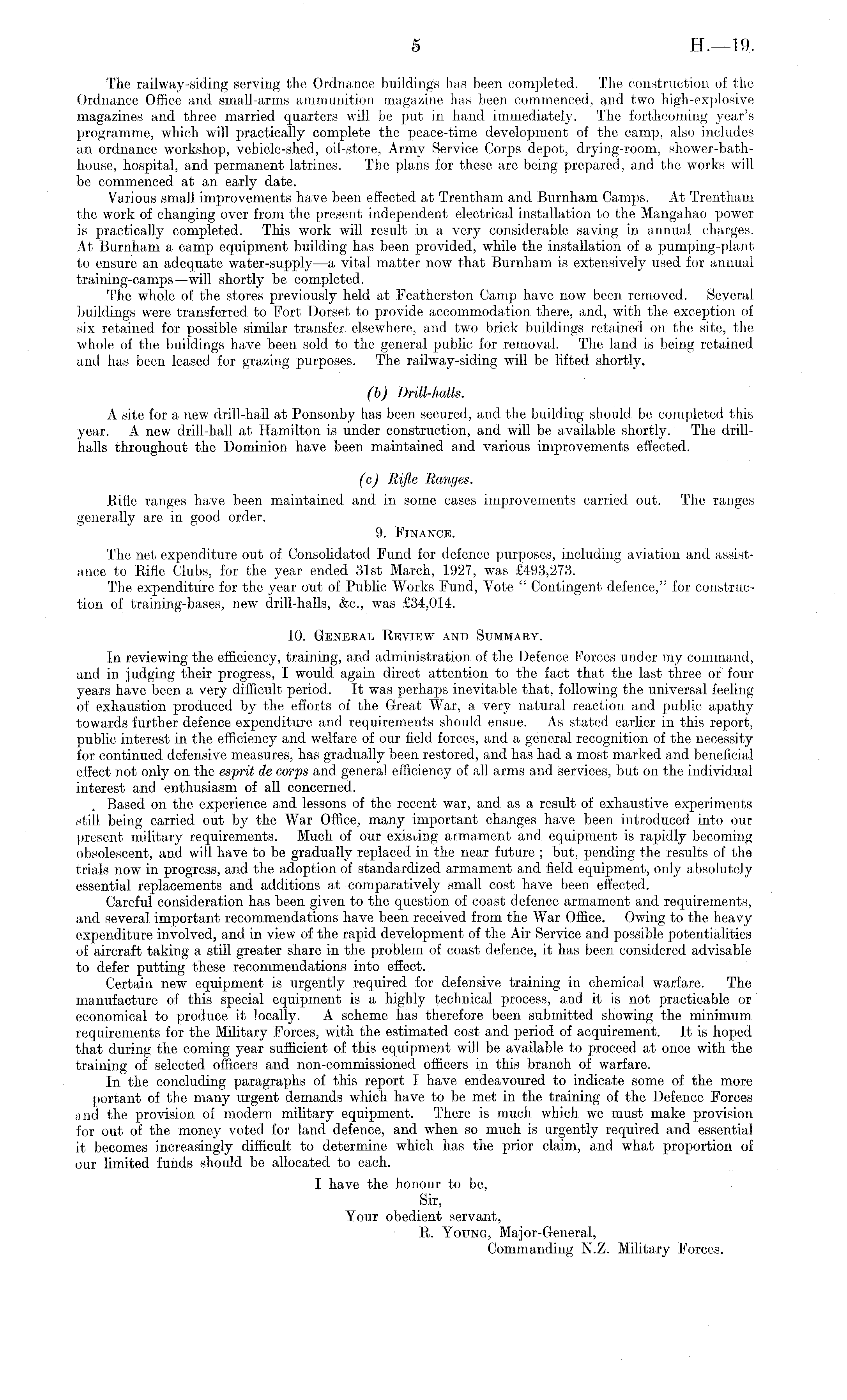 The railway-siding serving the Ordnance buildings has been completed. The construction of the Ordnance Office and small-arms ammunition magazine has been commenced, and two high-explosive magazines and three married quarters will be put in hand immediately. The forthcoming year's programme, which will practically complete the peace-time development of the camp, also includes an ordnance workshop, vehicle-shed, oil-store, Army Service Corps depot, drying-room, shower-bath-house, hospital, and permanent latrines. The plans for these are being prepared, and the works will be commenced at an early date. Various small improvements have been effected at Trentham and Burnham Camps. At Trentham the work of changing over from the present independent electrical installation to the Mangahao power is practically completed. This work will result in a very considerable saving in annual charges. At Burnham a camp equipment building has been provided, while the installation of a pumping-plant to ensure an adequate water-supply —a vital matter now that Burnham is extensively used for annual training-camps —will shortly be completed. The whole of the stores previously held at Feather st on Camp have now been removed. Several buildings were transferred to Fort Dorset to provide accommodation there, and, with the exception of six retained for possible similar transfer, elsewhere, and two brick buildings retained on the site, the whole of the buildings have been sold to the general public for removal. The land is being retained and has been leased for grazing purposes. The railway-siding will be lifted shortly. (b) Drill-halls. A site for a new drill-hall at Ponsonby has been secured, and the building should be completed this year. A new drill-hall at Hamilton is under construction, and will be available shortly. The drillhalls throughout the Dominion have been maintained and various improvements effected. (c) Rifle Ranges. Rifle ranges have been maintained and in some cases improvements carried out. The ranges generally are in good order. 9. Finance. The net expenditure out of Consolidated Fund for defence purposes, including aviation and assistance to Rifle Clubs, for the year ended 31st March, 1927, was £493,273. The expenditure for the year out of Public Works Fund, Vote " Contingent defence," for construction of training-bases, new drill-halls, &c., was £34,014:. 10. General Review and Summary. In reviewing the efficiency, training, and administration of the Defence Forces under my command, and in judging their progress, I would again direct attention to the fact that the last three or four years have been a very difficult period. It was perhaps inevitable that, following the universal feeling of exhaustion produced by the efforts of the Great War, a very natural reaction and public apathy towards further defence expenditure and requirements should ensue. As stated earlier in this report, public interest in the efficiency and welfare of our field forces, and a general recognition of the necessity for continued defensive measures, has gradually been restored, and has had a most marked and beneficial effect not only on the esprit de corps and general efficiency of all arms and services, but on the individual interest and enthusiasm of all concerned. . Based on the experience and lessons of the recent war, and as a result of exhaustive experiments still being carried out by the War Office, many important changes have been introduced into our present military requirements. Much of our existing armament and equipment is rapidly becoming obsolescent, and will have to be gradually replaced in the near future ; but, pending the results of the trials now in progress, and the adoption of standardized armament and field equipment, only absolutely essential replacements and additions at comparatively small cost have been effected. Careful consideration has been given to the question of coast defence armament and requirements, and several important recommendations have been received from the War Office. Owing to the heavy expenditure involved, and in view of the rapid development of the Air Service and possible potentialities of aircraft taking a still greater share in the problem of coast defence, it has been considered advisable to defer putting these recommendations into effect. Certain new equipment is urgently required for defensive training in chemical warfare. The manufacture of this special equipment is a highly technical process, and it is not practicable or economical to produce it locally. A scheme has therefore been submitted showing the minimum requirements for the Military Forces, with the estimated cost and period of acquirement. It is hoped that during the coming year sufficient of this equipment will be available to proceed at once with the training of selected officers and non-commissioned officers in this branch of warfare. In the concluding paragraphs of this report I have endeavoured to indicate some of the more portant of the many urgent demands which have to be met in the training of the Defence Forces and the provision of modern military equipment. There is much which we must make provision for out of the money voted for land defence, and when so much is urgently required and essential it becomes increasingly difficult to determine which has the prior claim, and what proportion of our limited funds should be allocated to each. 1 have the honour to be, Sir, Your obedient servant, R. Young, Major-General, Commanding N.Z. Military Forces.