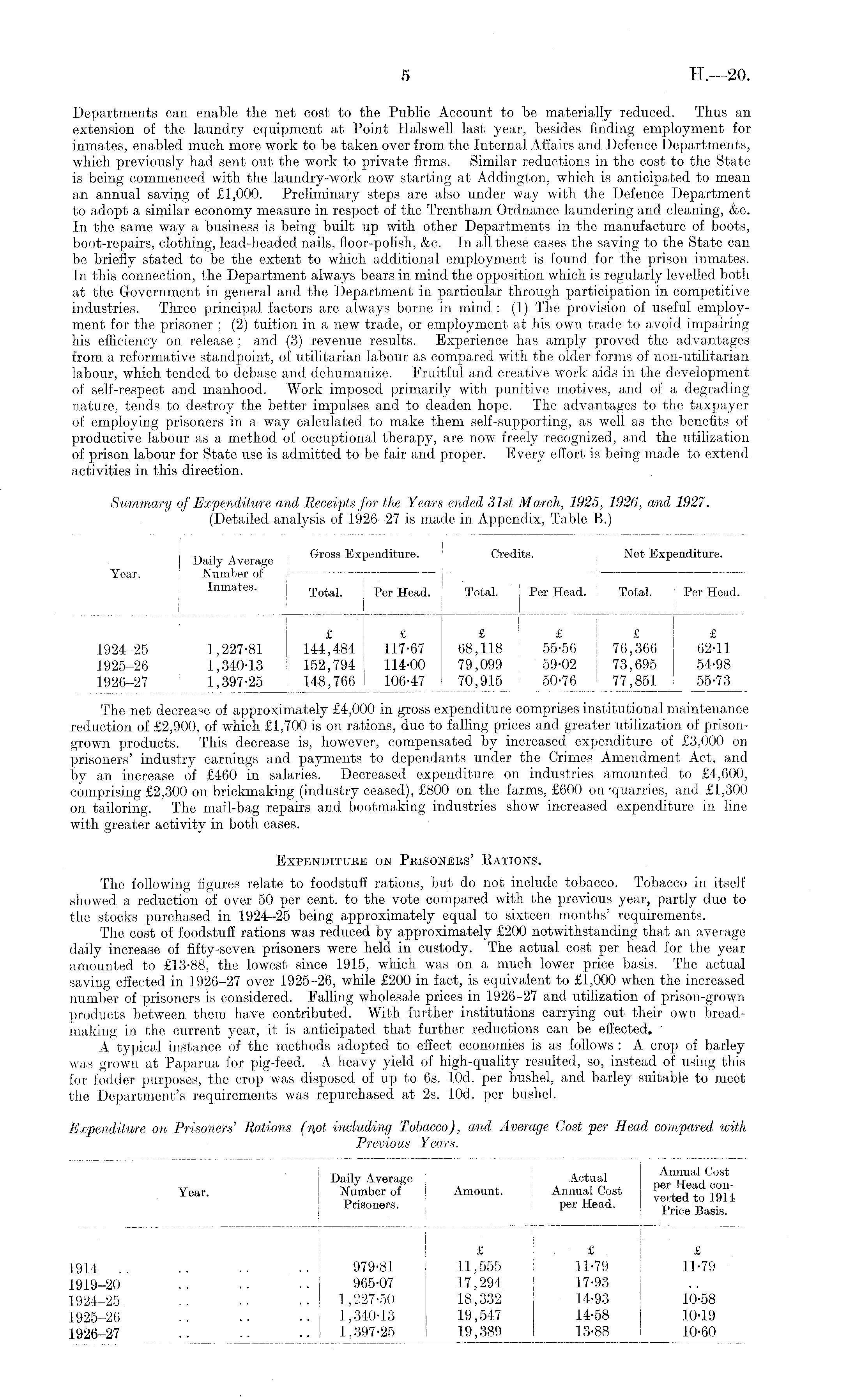 The net decrease of approximately £4,000 in gross expenditure comprises institutional maintenance reduction of £2,900, of which £1,700 is on rations, due to falling prices and greater utilization of prisongrown products. This decrease is, however, compensated by increased expenditure of £3,000 on prisoners' industry earnings and payments to dependants under the Crimes Amendment Act, and by an increase of £460 in salaries. Decreased expenditure on industries amounted to £4,600, comprising £2,300 on brickmaking (industry ceased), £800 on the farms, £600 on'quarries, and £1,300 on tailoring. The mail-bag repairs and bootmaking industries show increased expenditure in line with greater activity in both cases. Expenditure on Prisoners' Rations. The following figures relate to foodstuff rations, but do not include tobacco. Tobacco in itself showed a reduction of over 50 per cent, to the vote compared with the previous year, partly due to the stocks purchased in 1924-25 being approximately equal to sixteen months' requirements. The cost of foodstuff rations was reduced by approximately £200 notwithstanding that an average daily increase of fifty-seven prisoners were held in custody. The actual cost per head for the year amounted to £13-88, the lowest since 1915, which was on a much lower price basis. The actual saving effected in 1926-27 over 1925-26, while £200 in fact, is equivalent to £1,000 when the increased number of prisoners is considered. Falling wholesale prices in 1926-27 and utilization of prison-grown products between them have contributed. With further institutions carrying out their own breadmaking in the current year, it is anticipated that further reductions can be effected, A typical instance of the methods adopted to effect economies is as follows : A crop of barley was grown at Paparua for pig-feed. A heavy yield of high-quality resulted, so, instead of using this for fodder purposes, the crop was disposed of up to 6s. lOd. per bushel, and barley suitable to meet the Department's requirements was repurchased at 2s. lOd. per bushel.