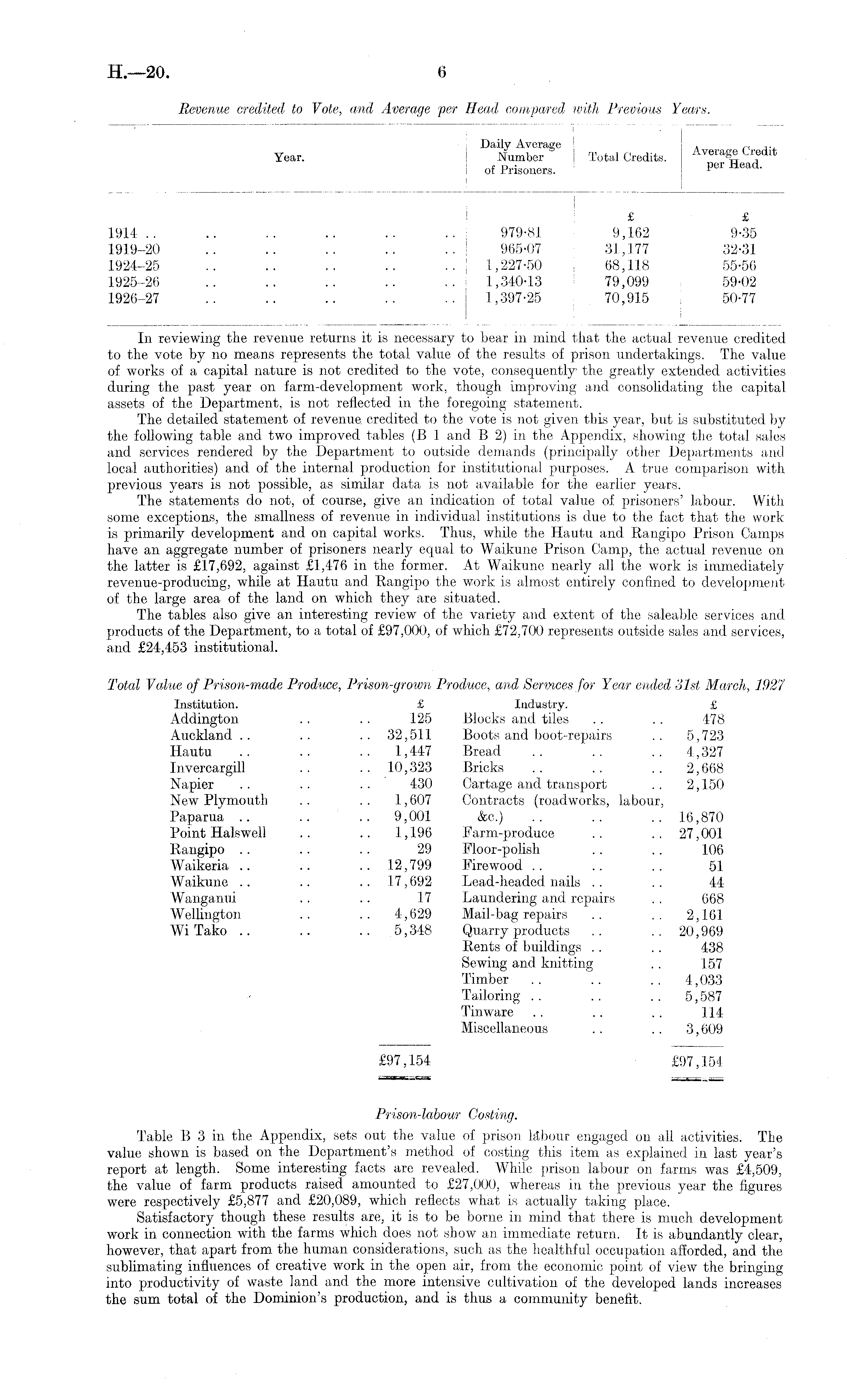 11l reviewing the revenue returns it is necessary to bear in mind that the actual revenue credited to the vote by 110 means represents the total value of the results of prison undertakings. The value of works of a capital nature is not credited to the vote, consequently the greatly extended activities during the past year on farm-development work, though improving and consolidating the capital assets of the Department, is not reflected in the foregoing statement. The detailed statement of revenue credited to the vote is not given this year, but is substituted by the following table and two improved tables (B 1 and B 2) in the Appendix, showing the total sales and services rendered by the Department to outside demands (principally other Departments and local authorities) and of the internal production for institutional purposes. A true comparison with previous years is not possible, as similar data is not available for the earlier years. The statements do not, of course, give an indication of total value of prisoners' labour. With some exceptions, the smallness of revenue in individual institutions is due to the fact that the work is primarily development and on capital works. Thus, while the Hautu and Eaugipo Prison Camps have an aggregate number of prisoners nearly equal to Waikune Prison Camp, the actual revenue on the latter is £17,692, against £1,476 in the former. At Waikune nearly all the work is immediately revenue-producing, while at Hautu and Eangipo the work is almost entirely confined to development of the large area of the land on which they are situated. The tables also give an interesting review of the variety and extent of the saleable services and products of the Department, to a total of £97,000, of which £72,700 represents outside sales and services, and £24,453 institutional. Total Value of Prison-made Produce, Prison-grown Produce, and Services for Year ended 31st March, 1927 Institution. £ Industry. £ Addington . . . . 125 Blocks and tiles . . . . 478 Auckland .. .. .. 32,511 Boots and boot-repairs .. 5,723 Hautu .. .. .. 1,447 Bread .. .. .. 4,327 Invercargill .. .. 10,323 Bricks .. .. .. 2,668 Napier .. .. .. 430 Cartage and transport .. 2,150 New Plymouth .. .. 1,607 Contracts (roadworks, labour, Paparua .. .. .. 9,001 &c.) .. .. .. 16,870 Point Halswell .. .. 1,196 Farm-produce .. .. 27,001 Rangipo .. .. .. 29 Floor-polish . . . . 106 Waikeria .. .. .. 12,799 Firewood .. .. .. 51 Waikune .. .. .. 17,692 Lead-headed nails .. .. 44 Wanganui . . .. 17 Laundering and repairs . . 668 Wellington .. .. 4,629 Mail-bag repairs .. .. 2,161 Wi Tako .. .. .. 5,348 Quarry products .. .. 20,969 Rents of buildings . . .. 438 Sewing and knitting .. 157 Timber .. .. .. 4,033 Tailoring .. .. .. 5,587 Tinware . . .. . . 114 Miscellaneous . . .. 3,609 £97,154 £97,154 ■ to nr;„tsa —— Prison-labour Costing. Table B3 in the Appendix, sets out the value of prison labour engaged on all activities. The value shown is based 011 the Department's method of costing this item as explained in last year's report at length. Some interesting facts are revealed. While prison labour on farms was £4,509, the value of farm products raised amounted to £27,000, whereas in the previous year the figures were respectively £5,877 and £20,089, which reflects what is actually taking place. Satisfactory though these results are, it is to be borne in mind that there is much, development work in connection with the farms which does not show an immediate return. It is abundantly clear, however, that apart from the human considerations, such as the healthful occupation afforded, and the sublimating influences of creative work in the open air, from the economic point of view the bringing into productivity of waste land and the more intensive cultivation of the developed lands increases the sum total of the Dominion's production, and is thus a community benefit.