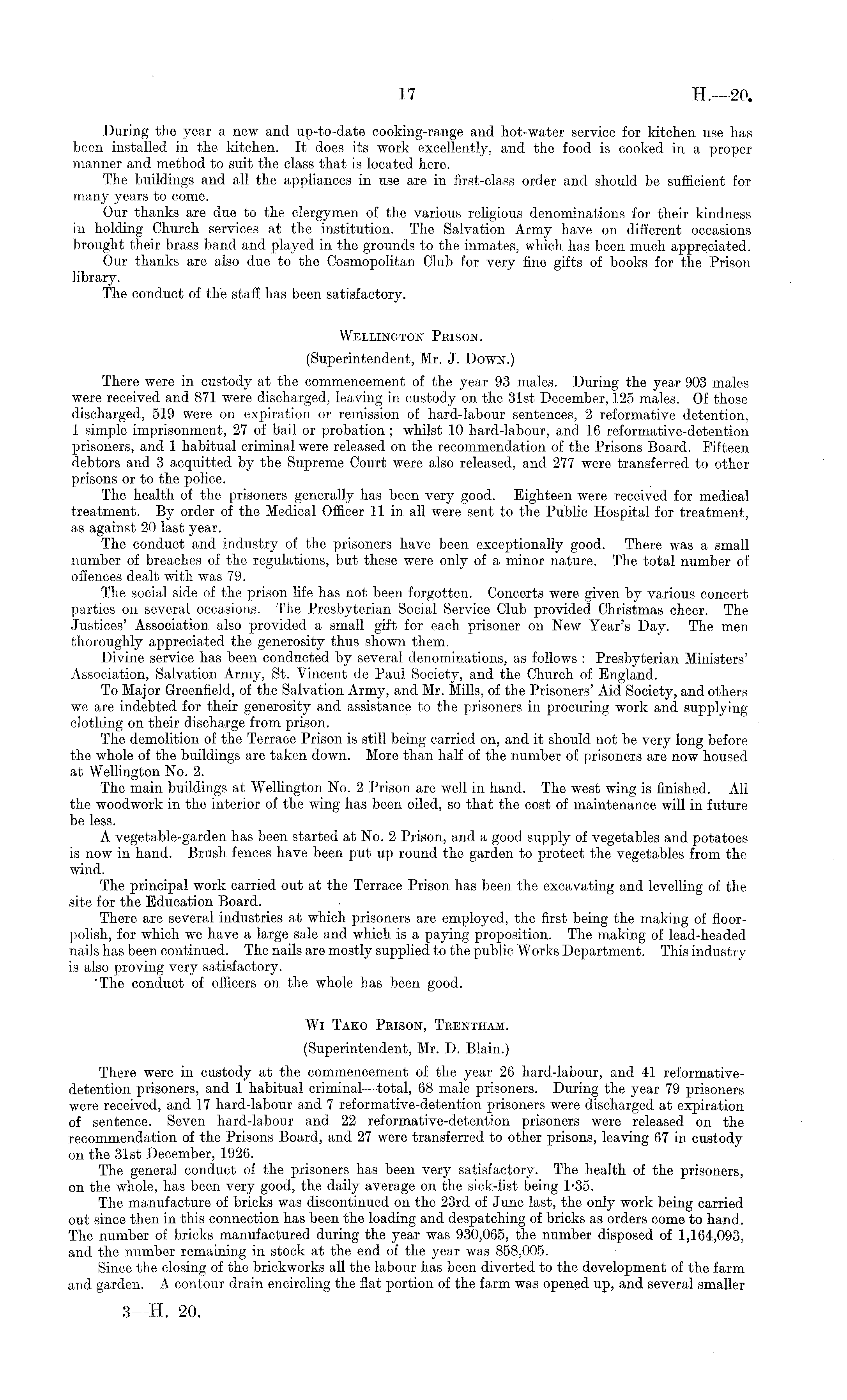 During the year a new and up-to-date cooking-range and hot-water service for kitchen use has been installed in the kitchen. It does its work excellently, and the food is cooked in a proper manner and method to suit the class that is located here. The buildings and all the appliances in use are in first-class order and should be sufficient for many years to come. Our thanks are due to the clergymen of the various religious denominations for their kindness in holding Church services at the institution. The Salvation Army have on different occasions brought their brass band and played in the grounds to the inmates, which has been much appreciated. Our thanks are also due to the Cosmopolitan Club for very fine gifts of books for the Prison library. The conduct of the staff has been satisfactory. Wellington Prison. (Superintendent, Mr. J. Down.) There were in custody at the commencement of the year 93 males. During the year 903 males were received and 871 were discharged, leaving in custody on the 31st December, 125 males. Of those discharged, 519 were on expiration or remission of hard-labour sentences, 2 reformative detention, 1 simple imprisonment, 27 of bail or probation ; whilst 10 hard-labour, and 16 reformative-detention prisoners, and 1 habitual criminal were released on the recommendation of the Prisons Board. Fifteen debtors and 3 acquitted by the Supreme Court were also released, and 277 were transferred to other prisons or to the police. The health of the prisoners generally has been very good. Eighteen were received for medical treatment. By order of the Medical Officer 11 in all were sent to the Public Hospital for treatment, as against 20 last year. The conduct and industry of the prisoners have been exceptionally good. There was a small number of breaches of the regulations, but these were only of a minor nature. The total number of offences dealt with was 79. The social side of the prison life has not been forgotten. Concerts were given by various concert parties on several occasions. The Presbyterian Social Service Club provided Christmas cheer. The Justices' Association also provided a small gift for each prisoner on New Year's Day. The men thoroughly appreciated the generosity thus shown them. Divine service has been conducted by several denominations, as follows : Presbyterian Ministers' Association, Salvation Army, St. Vincent de Paul Society, and the Church of England. To Major Greenfield, of the Salvation Army, and Mr. Mills, of the Prisoners' Aid Society, and others we are indebted for their generosity and assistance to the prisoners in procuring work and supplying clothing on their discharge from prison. The demolition of the Terrace Prison is still being carried on, and it should not be very long before the whole of the buildings are taken down. More than half of the number of prisoners are now housed at Wellington No. 2. The main buildings at Wellington No. 2 Prison are well in hand. The west wing is finished. All the woodwork in the interior of the wing has been oiled, so that the cost of maintenance will in future be less. A vegetable-garden has been started at No. 2 Prison, and a good supply of vegetables and potatoes is now in hand. Brush fences have been put up round the garden to protect the vegetables from the wind. The principal work carried out at the Terrace Prison has been the excavating and levelling of the site for the Education Board. There are several industries at which prisoners are employed, the first being the making of floorpolish, for which we have a large sale and which is a paying proposition. The making of lead-headed nails has been continued. The nails are mostly supplied to the public Works Department. This industry is also proving very satisfactory. 'The conduct of officers on the whole has been good. Wi Tako Prison, Trentham. (Superintendent, Mr. D. Blain.) There were in custody at the commencement of the year 26 hard-labour, and 41 reformativedetention prisoners, and 1 habitual criminal —total, 68 male prisoners. During the year 79 prisoners were received, and 17 hard-labour and 7 reformative-detention prisoners were discharged at expiration of sentence. Seven hard-labour and 22 reformative-detention prisoners were released on the recommendation of the Prisons Board, and 27 were transferred to other prisons, leaving 67 in custody on the 31st December, 1926. The general conduct of the prisoners has been very satisfactory. The health of the prisoners, on the whole, has been very good, the daily average on the sick-list being 1-35. The manufacture of bricks was discontinued on the 23rd of June last, the only work being carried out since then in this connection has been the loading and despatching of bricks as orders come to hand. The number of bricks manufactured during the year was 930,065, the number disposed of 1,164,093, and the number remaining in stock at the end of the year was 858,005. Since the closing of the brickworks all the labour has been diverted to the development of the farm and garden. A contour drain encircling the flat portion of the farm was opened up, and several smaller