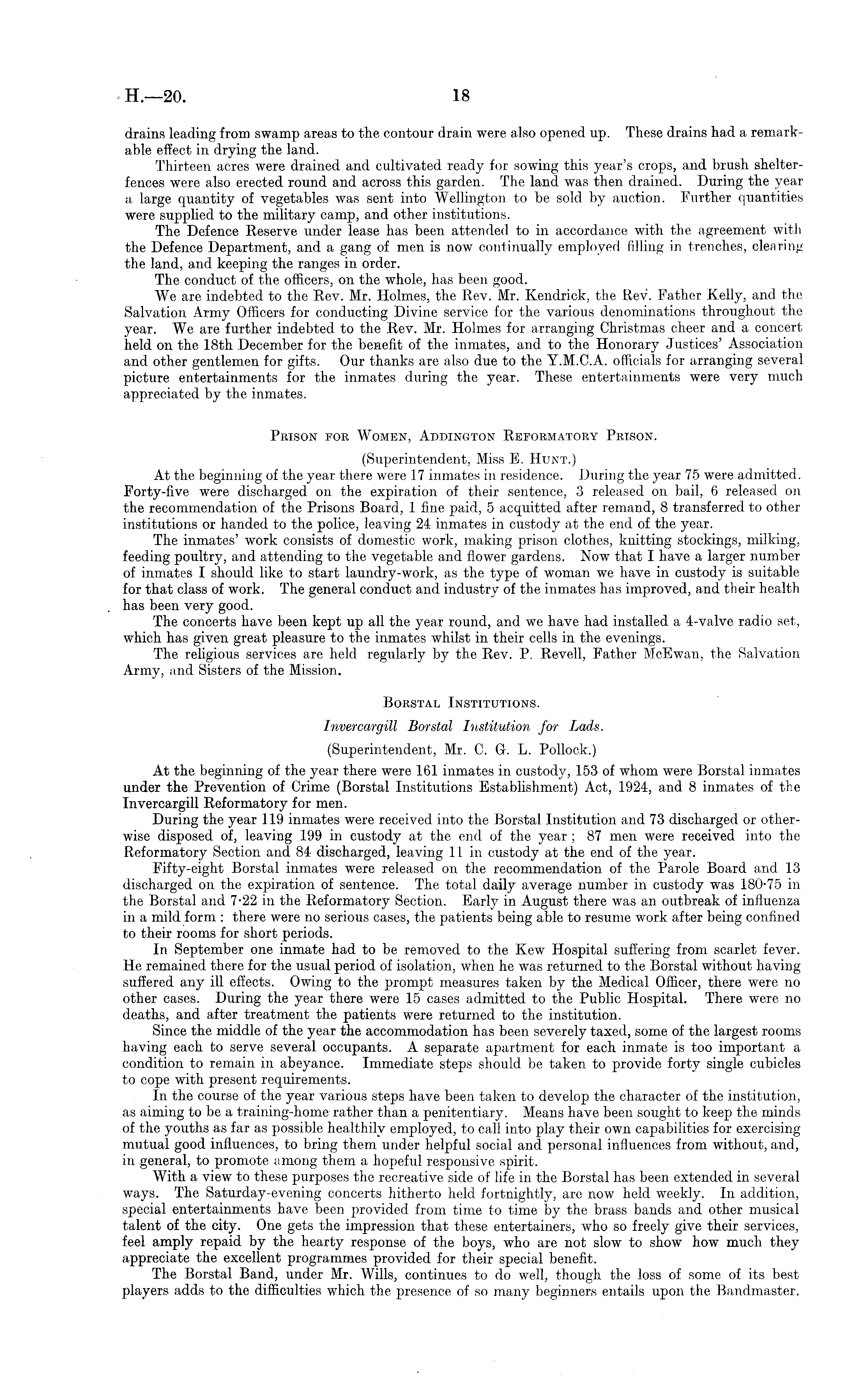 drains leading from swamp areas to the contour drain were also opened up. These drains had a remarkable effect in drying the land. Thirteen acres were drained and cultivated ready for sowing this year's crops, and brush shelterfences were also erected round and across this garden. The land was then drained. During the year a large quantity of vegetables was sent into Wellington to be sold by auction. Further quantities were supplied to the military camp, and other institutions. The Defence Reserve under lease has been attended to in accordance with the agreement with the Defence Department, and a gang of men is now continually employed filling in trenches, clearing the land, and keeping the ranges in order. The conduct of the officers, on the whole, has been good. We are indebted to the Rev. Mr. Holmes, the Rev. Mr. Kendrick, the Rev. Father Kelly, and the Salvation Army Officers for conducting Divine service for the various denominations throughout the year. We are further indebted to the Rev. Mr. Holmes for arranging Christmas cheer and a concert held on the 18th December for the benefit of the inmates, and to the Honorary Justices' Association and other gentlemen for gifts. Our thanks are also due to the Y.M.C.A. officials for arranging several picture entertainments for the inmates during the year. These entertainments were very much appreciated by the inmates. Prison foe Women, Addington Reformatory Prison. (Superintendent, Miss E. Hunt.) At the beginning of the year there were 17 inmates in residence. During the year 75 were admitted. Forty-five were discharged on the expiration of their sentence, 3 released on bail, 6 released on the recommendation of the Prisons Board, 1 fine paid, 5 acquitted after remand, 8 transferred to other institutions or handed to the police, leaving 24 inmates in custody at the end of the year. The inmates' work consists of domestic work, making prison clothes, knitting stockings, milking, feeding poultry, and attending to the vegetable and flower gardens. Now that I have a larger number of inmates I should like to start laundry-work, as the type of woman we have in custody is suitable for that class of work. The general conduct and industry of the inmates has improved, and their health has been very good. The concerts have been kept up all the year round, and we have had installed a 4-valve radio set, which has given great pleasure to the inmates whilst in their cells in the evenings. The religious services are held regularly by the Rev. P. Revell, Father McEwan, the Salvation Army, and Sisters of the Mission. Borstal Institutions. Ivivercargill Borstal Institution for Lads. (Superintendent, Mr. C. G. L. Pollock.) At the beginning of the year there were 161 inmates in custody, 153 of whom were Borstal inmates under the Prevention of Crime (Borstal Institutions Establishment) Act, 1924, and 8 inmates of the Invercargill Reformatory for men. During the year 119 inmates were received into the Borstal Institution and 73 discharged or otherwise disposed of, leaving 199 in custody at the end of the year; 87 men were received into the Reformatory Section and 84 discharged, leaving 11 in custody at the end of the year. Fifty-eight Borstal inmates were released on the recommendation of the Parole Board and 13 discharged on the expiration of sentence. The total daily average number in custody was 180-75 in the Borstal and 7-22 in the Reformatory Section. Early in August there was an outbreak of influenza in a mild form : there were no serious cases, the patients being able to resume work after being confined to their rooms for short periods. In September one inmate had to be removed to the Kew Hospital suffering from scarlet fever. He remained there for the usual period of isolation, when he was returned to the Borstal without having suffered any ill effects. Owing to the prompt measures taken by the Medical Officer, there were no other cases. During the year there were 15 cases admitted to the Public Hospital. There were no deaths, and after treatment the patients were returned to the institution. Since the middle of the year the accommodation has been severely taxed, some of the largest rooms having each to serve several occupants. A separate apartment for each inmate is too important a condition to remain in abeyance. Immediate steps should be taken to provide forty single cubicles to cope with present requirements. In the course of the year various steps have been taken to develop the character of the institution, as aiming to be a training-home rather than a penitentiary. Means have been sought to keep the minds of the youths as far as possible healthily employed, to call into play their own capabilities for exercising mutual good influences, to bring them under helpful social and personal influences from without, and, in general, to promote among them a hopeful responsive spirit. With a view to these purposes the recreative side of life in the Borstal has been extended in several ways. The Saturday-evening concerts hitherto held fortnightly, are now held weekly. In addition, special entertainments have been provided from time to time by the brass bands and other musical talent of the city. One gets the impression that these entertainers, who so freely give their services, feel amply repaid by the hearty response of the boys, who are not slow to show how much they appreciate the excellent programmes provided for their special benefit. The Borstal Band, under Mr. Wills, continues to do well, though the loss of some of its best players adds to the difficulties which the presence of so many beginners entails upon the Bandmaster,