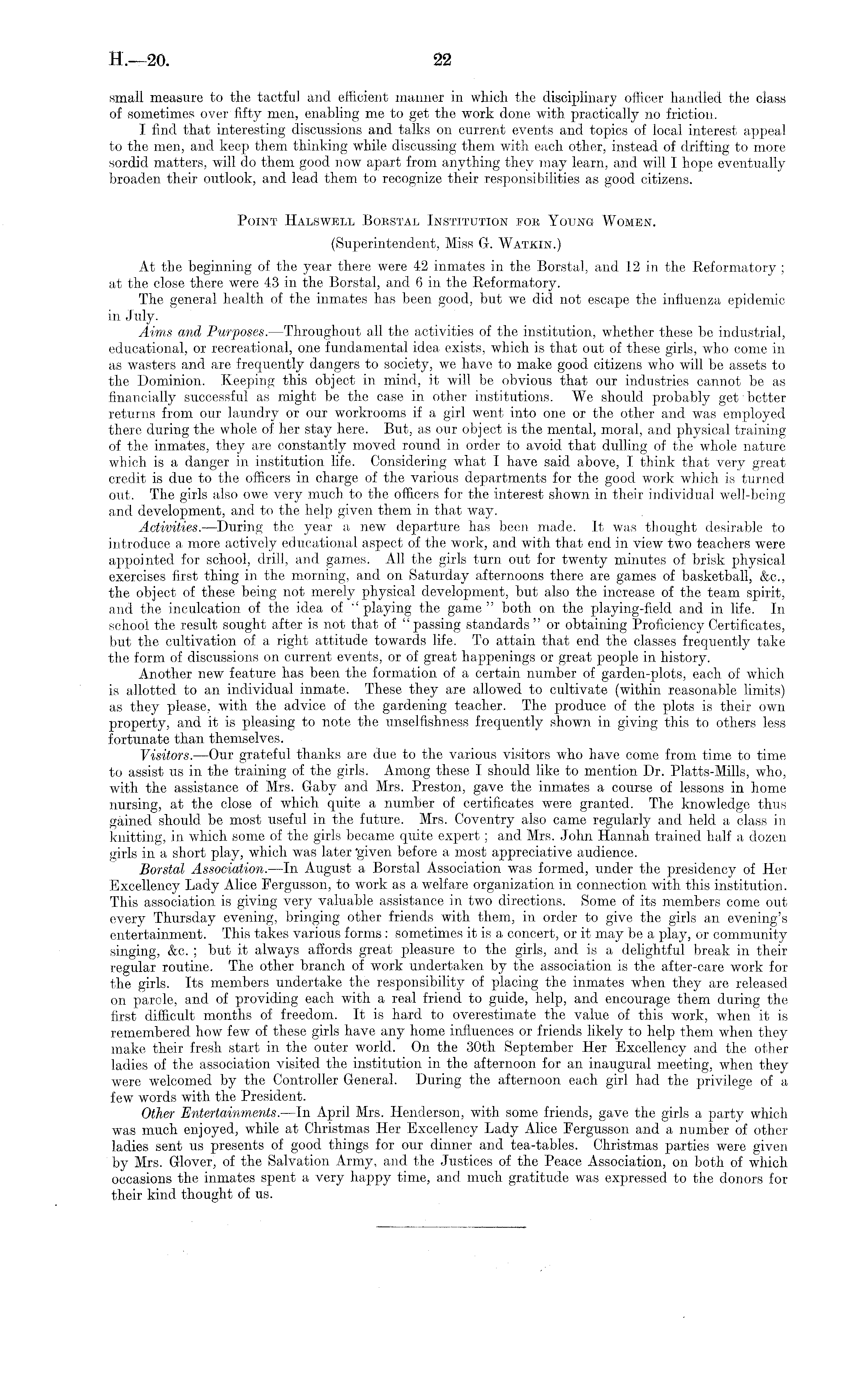 small measure to tlie tactful and efficient manner in which the disciplinary officer handled the class of sometimes over fifty men, enabling me to get the work done with practically no friction. I find that interesting discussions and talks on current events and topics of local interest appeal to the men, and keep them thinking while discussing them with each other, instead of drifting to more sordid matters, will do them good now apart from anything they may learn, and will I hope eventually broaden their outlook, and lead them to recognize their responsibilities as good citizens. Point Hal,swell Borstal Institution fok Young Women. (Superintendent, Miss G. Watkin.) At the beginning of the year there were 42 inmates in the Borstal, and 12 in the Reformatory ; at the close there were 43 in the Borstal, and 6 in the Reformatory. The general health of the inmates has been good, but we did not escape the influenza epidemic in July. Aims and Purposes.—Throughout all the activities of the institution, whether these be industrial, educational, or recreational, one fundamental idea exists, which is that out of these girls, who come in as wasters and are frequently dangers to society, we have to make good citizens who will be assets to the Dominion. Keeping this object in mind, it will be obvious that our industries cannot be as financially successful as might be the case in other institutions. We should probably get "better returns from our laundry or our workrooms if a girl went into one or the other and was employed there during the whole of her stay here. But, as our object is the mental, moral, and physical training of the inmates, they are constantly moved round in order to avoid that dulling of the whole nature which is a danger in institution life. Considering what I have said above, I think that very greatcredit is due to the officers in charge of the various departments for the good work which is turned out. The girls also owe very much to the officers for the interest shown in their individual well-being and development, and to the help given them in that way. Activities. —During the year a new departure has been made. It was thought desirable to introduce a, more actively educational aspect of the work, and with that end in view two teachers were appointed for school, drill, and games. All the girls turn out for twenty minutes of brisk physical exercises first thing in the morning, and on Saturday afternoons there are games of basketball, &c., the object of these being not merely physical development, but also the increase of the team spirit, and the inculcation of the idea of "playing the game" both on the playing-field and in life. In school the result sought after is not that of " passing standards " or obtaining Proficiency Certificates, but the cultivation of a right attitude towards life. To attain that end the classes frequently take the form of discussions on current events, or of great happenings or great people in history. Another new feature has been the formation of a certain number of garden-plots, each of which is allotted to an individual inmate. These they are allowed to cultivate (within reasonable limits) as they please, with the advice of the gardening teacher. The produce of the plots is their own property, and it is pleasing to note the unselfishness frequently shown in giving this to others less fortunate than themselves. Visitors. —Our grateful thanks are due to the various visitors who have come from time to time to assist us in the training of the girls. Among these I should like to mention Dr. Platts-Mills, who, with the assistance of Mrs. Gaby and Mrs. Preston, gave the inmates a course of lessons in home nursing, at the close of which quite a number of certificates were granted. The knowledge thus gained should be most useful in the future. Mrs. Coventry also came regularly and held a class in knitting, in which some of the girls became quite expert; and Mrs. John Hannah trained half a dozen girls in a short play, which was later "given before a most appreciative audience. Borstal Association. —In August a Borstal Association was formed, under the presidency of Her Excellency Lady Alice Fergusson, to work as a welfare organization in connection with this institution. This association is giving very valuable assistance in two directions. Some of its members come out every Thursday evening, bringing other friends with them, in order to give the girls an evening's entertainment. This takes various forms : sometimes it is a concert, or it may be a play, or community singing, &c. ; but it always affords great pleasure to the girls, and is a delightful break in their regidar routine. The other branch of work undertaken by the association is the after-care work for the girls. Its members undertake the responsibility of placing the inmates when they are released on parole, and of providing each with a real friend to guide, help, and encourage them during the first difficult months of freedom. It is hard to overestimate the value of this work, when it is remembered how few of these girls have any home influences or friends likely to help them when they make their fresh start in the outer world. On the 30th September Her Excellency and the other ladies of the association visited the institution in the afternoon for an inaugural meeting, when they were welcomed by the Controller General. During the afternoon each girl had the privilege of a few words with the President. Other Entertainments. —In April Mrs. Henderson, with some friends, gave the girls a party which was much enjoyed, while at Christmas Her Excellency Lady Alice Fergusson and a number of other ladies sent us presents of good things for our dinner and tea-tables. Christmas parties were given by Mrs. Glover, of the Salvation Army, and the Justices of the Peace Association, on both of which occasions the inmates spent a very happy time, and much gratitude was expressed to the donors for their kin