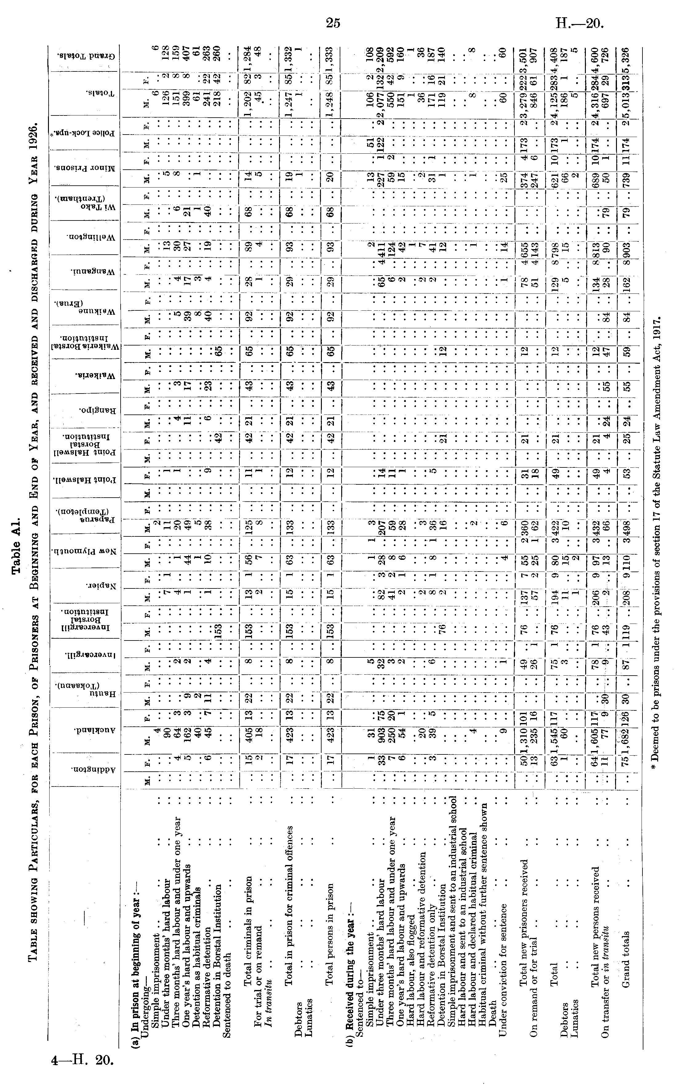 Table A1. Table showing Particulars, for each Prison, of Prisoners at Beginning and End of Year, and received and discharged during Year 1926.