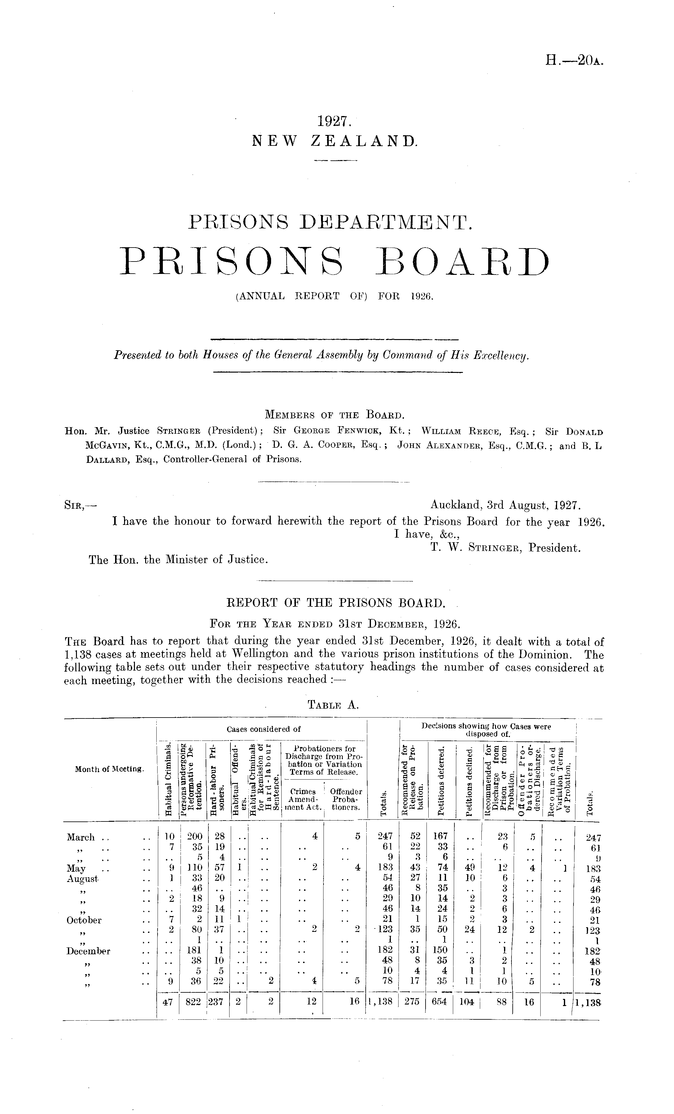 REPORT OF THE PRISONS BOARD. Fob the Year ended 31st December, 1926. The Board has to report that during the year ended 31st December, 1926, it dealt with a total of 1,138 cases at meetings held at Wellington and the various prison institutions of the Dominion. The following table sets out under their respective statutory headings the number of cases considered at each meeting, together with the decisions reached : —