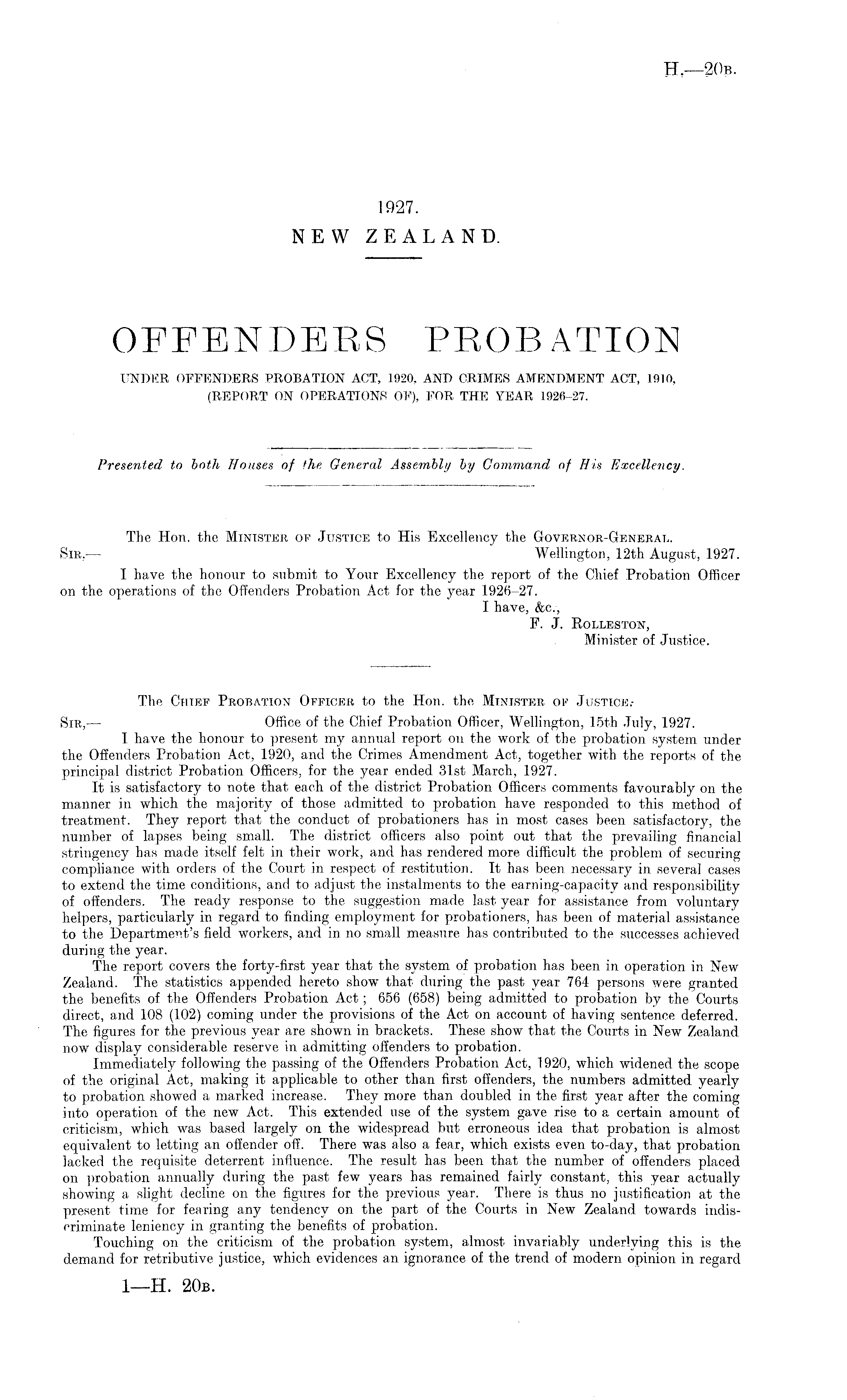 The Hon. the Minister of Justice to His Excellency the Governor-General. Sir. — Wellington, 12th August, 1927. I have the honour to submit to Your Excellency the report of the Chief Probation Officer on the operations of the Offenders Probation Act for the year 1926-27. I have, &c., F. J. Rolleston, Minister of Justice. The Chief Probation Officer to the Hon. the Minister of Justice? Sir, — Office of the Chief Probation Officer, Wellington, 15th July, 1927. 1 have the honour to present my annual report on the work of the probation system under the Offenders Probation Act, 1920, and the Crimes Amendment Act, together with the reports of the principal district Probation Officers, for the year ended 31st March, 1927. It is satisfactory to note that each of the district Probation Officers comments favourably on the manner in which the majority of those admitted to probation have responded to this method of treatment. They report that the conduct of probationers has in most cases been satisfactory, the number of lapses being small. The district officers also point out that the prevailing financial stringency has made itself felt in their work, and has rendered more difficult the problem of securing compliance with orders of the Court in respect of restitution. It has been necessary in several cases to extend the time conditions, and. to adjust the instalments to the earning-capacity and responsibility of offenders. The ready response to the suggestion made last year for assistance from voluntary helpers, particularly in regard to finding employment for probationers, has been of material assistance to the Department's field workers, and in no small measure has contributed to the successes achieved during the year. The report covers the forty-first year that the system of probation has been in operation in New Zealand. The statistics appended hereto show that during the past year 764 persons were granted the benefits of the Offenders Probation Act; 656 (658) being admitted to probation by the Courts direct, and 108 (102) coming under the provisions of the Act on account of having sentence deferred. The figures for the previous year are shown in brackets. These show that the Courts in New Zealand now display considerable reserve in admitting offenders to probation. Immediately following the passing of the Offenders Probation Act, 1920, which widened the scope of the original Act, making it applicable to other than first offenders, the numbers admitted yearly to probation showed a marked increase. They more than doubled in the first year after the coming into operation of the new Act. This extended use of the system gave rise to a certain amount of criticism, which was based largely on the widespread but erroneous idea that probation is almost equivalent to letting an offender off. There was also a fear, which exists even to-day, that probation lacked the requisite deterrent influence. The result has been that the number of offenders placed on probation annually during the past few years has remained fairly constant, this year actually showing a slight decline on the figures for the previous year. There is thus no justification at the present time for fearing any tendency on the part of the Courts in New Zealand towards indiscriminate leniency in granting the benefits of probation. Touching on the criticism of the probation system, almost invariably underlying this is the demand for retributive justice, which evidences an ignorance of the trend of modern opinion in regard