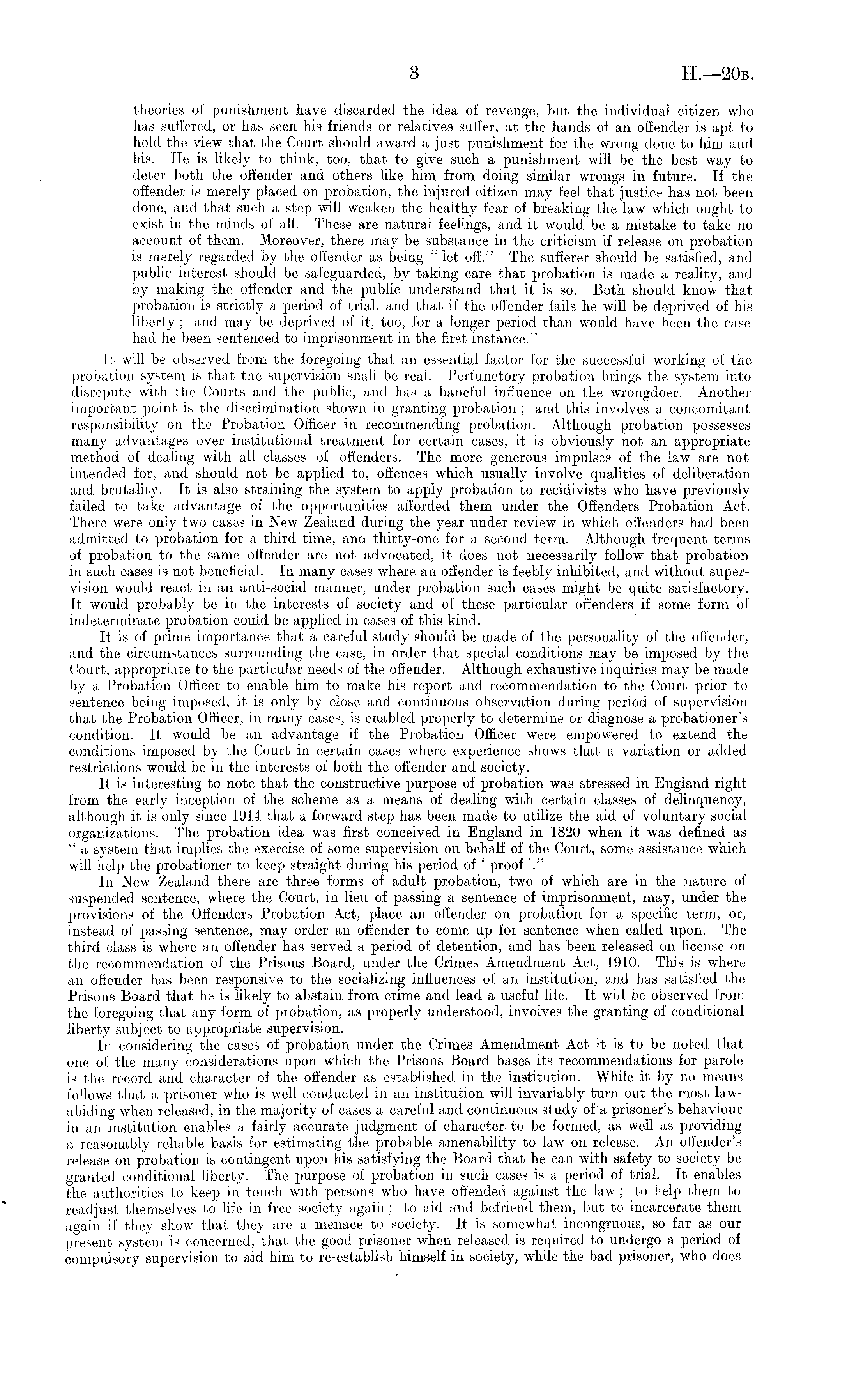 theories of punishment have discarded the idea of revenge, but the individual citizen who lias suffered, or has seen his friends or relatives suffer, at the hands of an offender is apt to hold the view that the Court should award a just punishment for the wrong done to him and his. He is likely to think, too, that to give such a punishment will be the best way to deter both the offender and others like him from doing similar wrongs in future. If the offender is merely placed on probation, the injured citizen may feel that justice has not been done, and that such a step will weaken the healthy fear of breaking the law which ought to exist in the minds of all. These are natural feelings, and it would be a mistake to take 110 account of them. Moreover, there may be substance in the criticism if release on probation is merely regarded by the offender as being " let off." The sufferer should be satisfied, and public interest should be safeguarded, by taking care that probation is made a reality, and by making the offender and the public understand that it is so. Both should know that probation is strictly a period of trial, and that if the offender fails he will be deprived of his liberty ; and may be deprived of it, too, for a longer period than would have been the case had he been sentenced to imprisonment in the first instance." It will be observed from the foregoing that an essential factor for the successful working of the probation system is that the supervision shall be real. Perfunctory probation brings the system into disrepute with the Courts and the public, and has a baneful influence 011 the wrongdoer. Another important point is the discrimination shown in granting probation ; and this involves a concomitant responsibility 011 the Probation Oificer in recommending probation. Although probation possesses many advantages over institutional treatment for certain cases, it is obviously not an appropriate method of dealing with all classes of offenders. The more generous impulses of the law are not intended for, and should not be applied to, offences which usually involve qualities of deliberation and brutality. It is also straining the system to apply probation to recidivists who have previously failed to take advantage of the opportunities afforded them under the Offenders Probation Act. There were only two cases in New Zealand during the year under review in which offenders had been admitted to probation for a third time, and thirty-one for a second term. Although frequent terms of probation to the same offender are not advocated, it does not necessarily follow that probation in such cases is not beneficial. In many cases where an offender is feebly inhibited, and without supervision would react in an anti-social manner, under probation such cases might be quite satisfactory. It would probably be in the interests of society and of these particular offenders if some form of indeterminate probation could be applied in cases of this kind. It is of prime importance that a careful study should be made of the personality of the offender, and the circumstances surrounding the case, in order that special conditions may be imposed by the Court, appropriate to the particular needs of the offender. Although exhaustive inquiries may be made by a Probation Officer to enable him to make his report and recommendation to the Court prior to sentence being imposed, it is only by close and continuous observation during period of supervision that the Probation Officer, in many cases, is enabled properly to determine or diagnose a probationer's condition. It would be an advantage if the Probation Officer were empowered to extend the conditions imposed by the Court in certain cases where experience shows that a variation or added restrictions would be in the interests of both the offender and society. It is interesting to note that the constructive purpose of probation was stressed in England right from the early inception of the scheme as a means of dealing with certain classes of delinquency, although it is only since 1914 that a forward step has been made to utilize the aid of voluntary social organizations. The probation idea was first conceived in England in 1820 when it was defined as " a system that implies the exercise of some supervision on behalf of the Court, some assistance which will help the probationer to keep straight during his period of ' proof In New Zealand there are three forms of adult probation, two of which are in the nature of suspended sentence, where the Court, in lieu of passing a sentence of imprisonment, may, under the provisions of the Offenders Probation Act, place an offender 011 probation for a specific term, or, instead of passing sentence, may order an offender to come up for sentence when called upon. The third class is where an offender has served a period of detention, and has been released 011 license on the recommendation of the Prisons Board, under the Crimes Amendment Act, 1910. This is where an offender has been responsive to the socializing influences of an institution, and has satisfied the Prisons Board that he is likely to abstain from crime and lead a useful life. It will be observed from the foregoing that any form of probation, as properly understood, involves the granting of conditional liberty subject to appropriate supervision. 111 considering the cases of probation under the Crimes Amendment Act it is to be noted that one of the many considerations upon which the Prisons Board bases its recommendations for parole is the record and character of the offender as established in the institution. While it by 110 means follows that a prisoner who is well, conducted in an institution will invariably turn out the most lawabiding when released, in the majority of cases a careful and continuous study of a prisoner's behaviour in an institution enables a fairly accurate judgment of character to be formed, as well as providing a reasonably reliable basis for esti