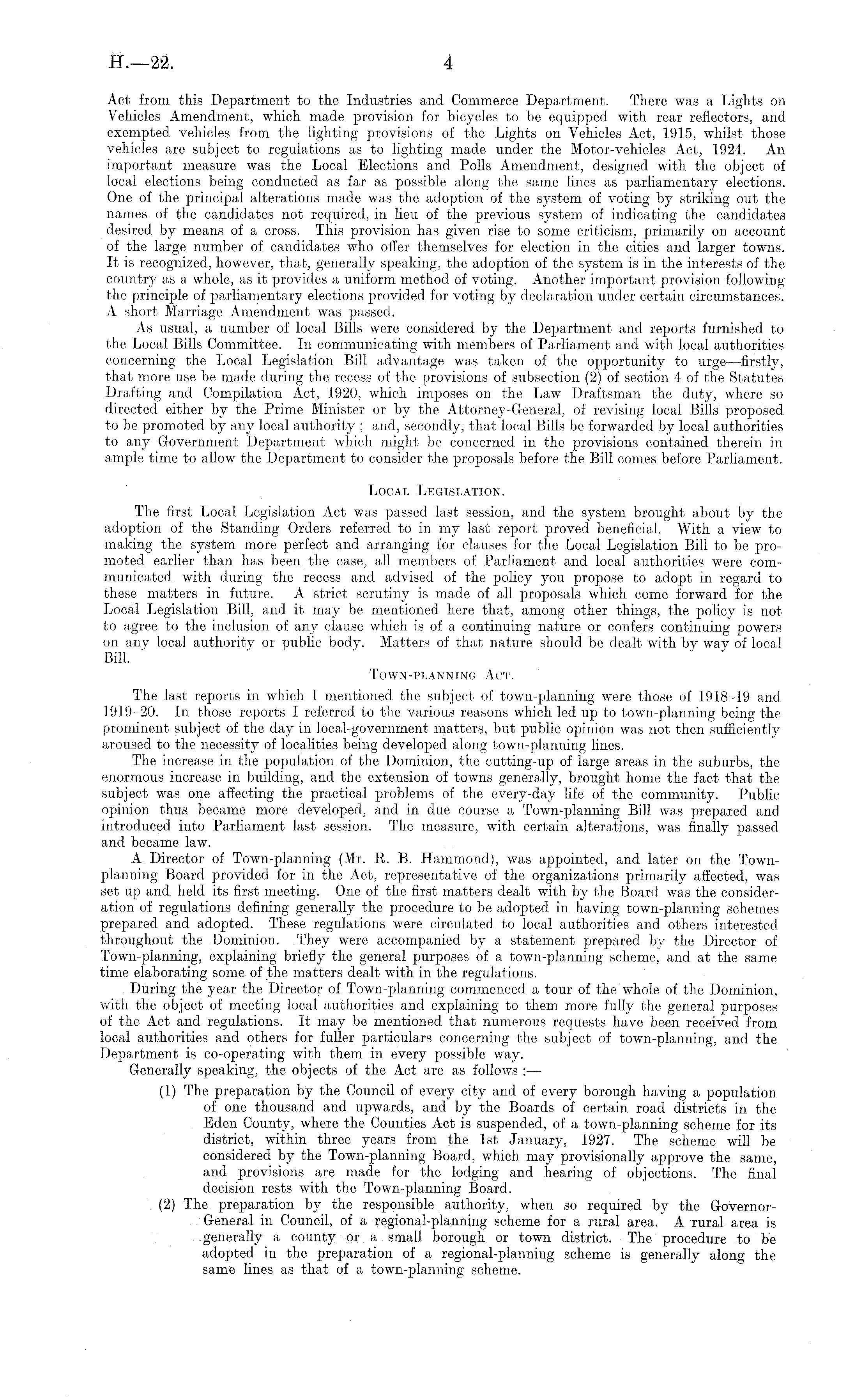 Act from this Department to the Industries and Commerce Department. There was a Lights on Vehicles Amendment, which made provision for bicycles to be equipped with rear reflectors, and exempted vehicles from the lighting provisions of the Lights on Vehicles Act, 1915, whilst those vehicles are subject to regulations as to lighting made under the Motor-vehicles Act, 1924. An important measure was the Local Elections and Polls Amendment, designed with the object of local elections being conducted as far as possible along the same lines as parliamentary elections. One of the principal alterations made was the adoption of the system of voting by striking out the names of the candidates not required, in lieu of the previous system of indicating the candidates desired by means of a cross. This provision has given rise to some criticism, primarily on account of the large number of candidates who offer themselves for election in the cities and larger towns. It is recognized, however, that, generally speaking, the adoption of the system is in the interests of the country as a whole, as it provides a uniform method of voting. Another important provision following the principle of parliamentary elections provided for voting by declaration under certain circumstances. A short Marriage Amendment was passed. As usual, a number of local Bills were considered by the Department and reports furnished to the Local Bills Committee. In communicating with members of Parliament and with local authorities concerning the Local Legislation Bill advantage was taken of the opportunity to urge—firstly, that more use be made during the recess of the provisions of subsection (2) of section 4 of the Statutes Drafting and Compilation Act, 1920, which imposes on the Law Draftsman the duty, where so directed either by the Prime Minister or by the Attorney-General, of revising local Bills proposed to be promoted by any local authority ; and, secondly, that local Bills be forwarded by local authorities to any Government Department which might be concerned in the provisions contained therein in ample time to allow the Department to consider the proposals before the Bill comes before Parliament. Local Legislation. The first Local Legislation Act was passed last session, and the system brought about by the adoption of the Standing Orders referred to in my last report proved beneficial. With a view to making the system more perfect and arranging for clauses for the Local Legislation Bill to be promoted earlier than has been the case, all members of Parliament and local authorities were communicated with during the recess and advised of the policy you propose to adopt in regard to these matters in future. A strict scrutiny is made of all proposals which come forward for the Local Legislation Bill, and it may be mentioned here that, among other things, the policy is not to agree to the inclusion of any clause which is of a continuing nature or confers continuing powers on any local authority or public body. Matters of that nature should be dealt with by way of local Bill. Town-planning Act. The last reports in which I mentioned the subject of town-planning were those of 1918-19 and 1919-20. In those reports I referred to the various reasons which led up to town-planning being the prominent subject of the day in local-government matters, but public opinion was not then sufficiently aroused to the necessity of localities being developed along town-planning lines. The increase in the population of the Dominion, the cutting-up of large areas in the suburbs, the enormous increase in building, and the extension of towns generally, brought home the fact that the subject was one affecting the practical problems of the everv-day life of the community. Public opinion thus became more developed, and in due course a Town-planning Bill was prepared and introduced into Parliament last session. The measure, with certain alterations, was finally passed and became law. A Director of Town-planning (Mr. 11. B. Hammond), was appointed, and later on the Townplanning Board provided for in the Act, representative of the organizations primarily affected, was set up and held its first meeting. One of the first matters dealt with by the Board was the consideration of regulations defining generally the procedure to be adopted in having town-planning schemes prepared and adopted. These regulations were circulated to local authorities and others interested throughout the Dominion. They were accompanied by a statement prepared by the Director of Town-planning, explaining briefly the general purposes of a town-planning scheme, and at the same time elaborating some of the matters dealt with in the regulations. During the year the Director of Town-planning commenced a tour of the whole of the Dominion, with the object of meeting local authorities and explaining to them more fully the general purposes of the Act and regulations. It may be mentioned that numerous requests have been received from local authorities and others for fuller particulars concerning the subject of town-planning, and the Department is co-operating with them in every possible way. Generally speaking, the objects of the Act are as follows (1) The preparation by the Council of every city and of every borough having a population of one thousand and upwards, and by the Boards of certain road districts in the Eden County, where the Counties Act is suspended, of a town-planning scheme for its district, within three years from the Ist January, 1927. The scheme will be considered by the Town-planning Board, which may provisionally approve the same, and provisions are made for the lodging and hearing of objections. The final decision rests with the Town-planning Board. (2) The preparation by the responsible authority, when so required by the GovernorGeneral in Council, of a regional-planning scheme for a rural area. A rural area is generally a county or a small borough or town district. The procedu