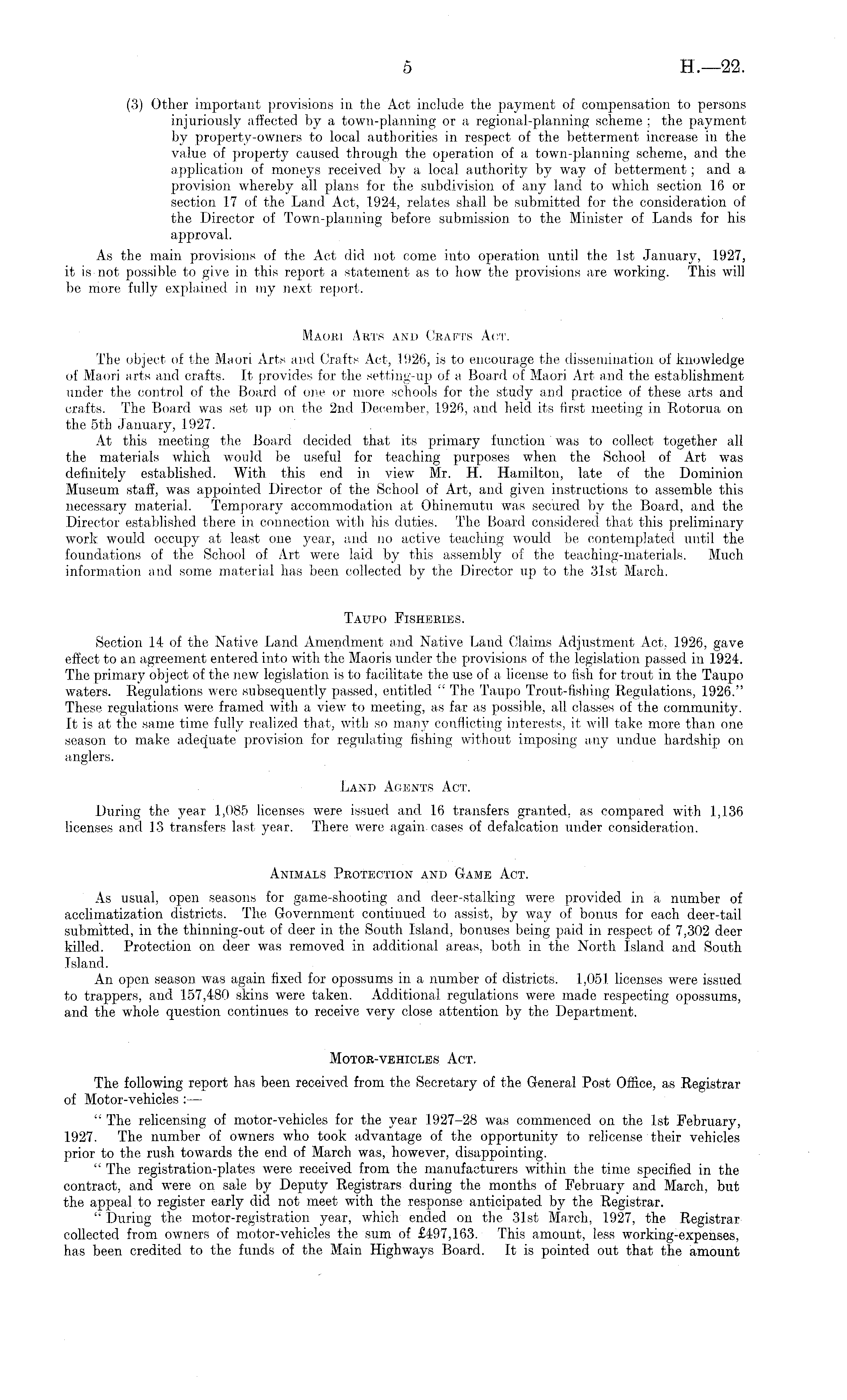 (3) Other important provisions in the Act include the payment of compensation to persons injuriously affected by a town-planning or a regional-planning scheme ; the payment by property-owners to local authorities in respect of the betterment increase in the value of property caused through the operation of a town-planning scheme, and the application of moneys received by a local authority by way of betterment; and a provision whereby all plans for the subdivision of any land to which section 16 or section 17 of the Land Act, 1924, relates shall be submitted for the consideration of the Director of Town-planning before submission to the Minister of Lands for his approval. As the main provisions of the Act did not come into operation until the Ist January, 1927, it is not possible to give in this report a statement as to how the provisions are working. This will be more fully explained in my next report. Maori Arts and Crafts Act. The object of the Maori Arts and Crafts Act, 1926, is to encourage the dissemination of knowledge of Maori arts and crafts. It provides for the setting-up of a Board of Maori Art and the establishment under the control of the Board of one or more schools for the study and practice of these arts and crafts. The Board was set up on the 2nd December, 1926, and held its first meeting in Rotorua on the sth January, 1927. At this meeting the Board decided that its primary function was to collect together all the materials which would be useful for teaching purposes when the School of Art was definitely established. With this end in view T Mr. H. Hamilton, late of the Dominion Museum staff, was appointed Director of the School of Art, and given instructions to assemble this necessary material. Temporary accommodation at Ohinemutu was secured by the Board, and the Director established there in connection with his duties. The Board considered that this preliminary work would occupy at least one year, and no active teaching would be contemplated until the foundations of the School of Art were laid by this assembly of the teaching-materials. Much information and some material has been collected by the Director up to the 31st March. Taupo Fisheries. Section 14 of the Native Land Amendment and Native Land Claims Adjustment Act, 1926, gave effect to an. agreement entered into with the Maoris under the provisions of the legislation passed in 1924. The primary object of the new legislation is to facilitate the use of a license to fish for trout in the Taupo waters. Regulations were subsequently passed, entitled " The Taupo Trout-fishing Regulations, 1926." These regulations were framed with a view to meeting, as far as possible, all classes of the community. It is at the same time fully realized that, with so many conflicting interests, it will take more than one season to make adequate provision for regulating fishing without imposing any undue hardship on anglers. Land Agents Act. During the year 1,085 licenses were issued and 16 transfers granted, as compared with 1,136 licenses and 13 transfers last year. There were again, cases of defalcation under consideration. Animals Protection and Game Act. As usual, open seasons for game-shooting and deer-stalking were provided in a number of acclimatization districts. The Government continued to assist, by way of bonus for each deer-tail submitted, in the thinning-out of deer in the South Island, bonuses being paid in respect of 7,302 deer killed. Protection on deer was removed in additional areas, both in the North Island and South Island. An open season was again fixed for opossums in a number of districts. 1,051 licenses were issued to trappers, and 157,480 skins were taken. Additional regulations were made respecting opossums, and the whole question continues to receive very close attention by the Department. Motor-vehicles Act. The following report has been received from the Secretary of the General Post Office, as Registrar of Motor-vehicles : — " The relicensing of motor-vehicles for the year 1927-28 was commenced on the Ist February, 1927. The number of owners who took advantage of the opportunity to relicense their vehicles prior to the rush towards the end of March was, however, disappointing. " The registration-plates were received from the manufacturers within the time specified in the contract, and were on sale by Deputy Registrars during the months of February and March, but the appeal to register early did not meet with the response anticipated by the Registrar. During the motor-registration year, which ended on the 31st March, 1927, the Registrar collected from owners of motor-vehicles the sum of £497,163. This amount, less working-expenses, has been credited to the funds of the Main Highways Board. It is pointed out that the amount
