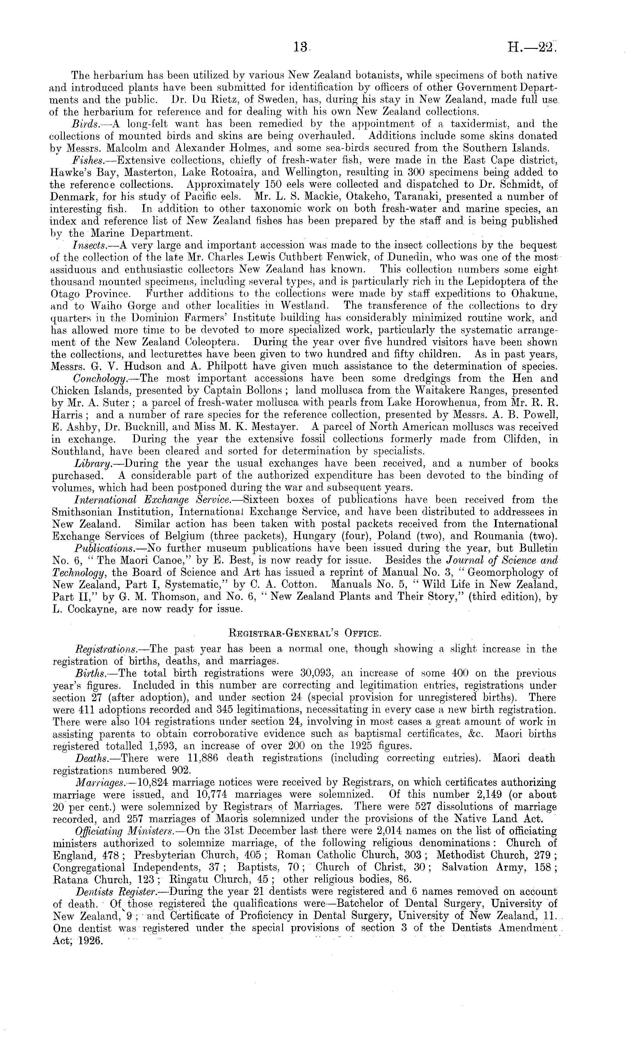 The herbarium has been utilized by various New Zealand botanists, while specimens of both native and introduced plants have been submitted for identification by officers of other Government Departments and the public. Dr. Du Rietz, of Sweden, has, during his stay in New Zealand, made full use_ of the herbarium for reference and for dealing with his own New Zealand collections. Birds. —A long-felt want has been remedied by the appointment of a taxidermist, and the collections of mounted birds and skins are being overhauled. Additions include some skins donated by Messrs. Malcolm and Alexander Holmes, and some sea-birds secured from the Southern Islands. Fishes. —Extensive collections, chiefly of fresh-water fish, were made in the East Cape district, Hawke's Bay, Masterton, Lake Rotoaira, and Wellington, resulting in 300 specimens being added to the reference collections. Approximately 150 eels were collected and dispatched to Dr. Schmidt, of Denmark, for his study of Pacific eels. Mr. L. S. Mackie, Otakeho, Taranaki, presented a number of interesting fish. In addition to other taxonomic work on both fresh-water and marine species, an index and reference list of New Zealand fishes has been prepared by the staff and is being published by the Marine Department. Insects. —-A very large and important accession was made to the insect collections by the bequest of the collection of the late Mr. Charles Lewis Cuthbert Fenwick, of Dunedin, who was one of the most assiduous and enthusiastic collectors New Zealand has known. This collection numbers some eight thousand mounted specimens, including several types, and is particularly rich in the Lepidoptera of the Otago Province. Further additions to the collections were made by staff expeditions to Ohakune, and to Waiho Gorge and other localities in Westland. The transference of the collections to dry quarters in the Dominion Farmers' Institute building has considerably minimized routine work, and has allowed more time to be devoted to more specialized work, particularly the systematic arrangement of the New Zealand Coleoptera. During the year over five hundred visitors have been shown the collections, and lecturettes have been given to two hundred and fifty children. As in past years, Messrs. G. V. Hudson and A. Philpott have given much assistance to the determination of species. Conchology. —The most important accessions have been some dredgings from the Hen and Chicken Islands, presented by Captain Bollons ; land mollusca from the Waitakere Ranges, presented by Mr. A. Suter; a parcel of fresh-water mollusca with pearls from Lake Horowhenua, from Mr. R. R. Harris ; and a number of rare species for the reference collection, presented by Messrs. A. B. Powell, E. Ashby, Dr. Bucknill, and Miss M. K. Mestayer. A parcel of North American molluscs was received in exchange. During the year the extensive fossil collections formerly made from Clifden, in Southland, have been cleared and sorted for determination by specialists. Library. —During the year the usual exchanges have been received, and a number of books purchased. A considerable part of the authorized expenditure has been devoted to the binding of volumes, which had been postponed during the war and subsequent years. International Exchange Service.—Sixteen boxes of publications have been received from the Smithsonian Institution, International Exchange Service, and have been distributed to addressees in New Zealand. Similar action has been taken with postal packets received from the International Exchange Services of Belgium (three packets), Hungary (four), Poland (two), and Roumania (two). Publications.—No further museum publications have been issued during the year, but Bulletin No. 6, " The Maori Canoe," by E. Best, is now ready for issue. Besides the Journal of Science and Technology, the Board of Science and Art has issued a reprint of Manual No. 3, " Geomorphology of New Zealand, Part I, Systematic," by C. A. Cotton. Manuals No. 5, " Wild Life in New Zealand, Part II," by G. M. Thomson, and No. 6, " New Zealand Plants and Their Story," (third edition), by L. Cockayne, are now ready for issue. Registrar-General's Office. Registrations.—The past year has been a normal one, though showing a slight increase in the registration of births, deaths, and marriages. Births. —The total birth registrations were 30,093, an increase of some 400 on the previous year's figures. Included in this number are correcting and legitimation entries, registrations under section 27 (after adoption), and under section 24 (special provision for unregistered births). There were 411 adoptions recorded and 345 legitimations, necessitating in every case a new birth registration. There were also 104 registrations under section 24, involving in most cases a great amount of work in assisting parents to obtain corroborative evidence such as baptismal certificates, &c. Maori births registered totalled 1,593, an increase of over 200 on the 1925 figures. Deaths.—There were 11,886 death registrations (including correcting entries). Maori death registrations numbered 902. Marriages. —10,824 marriage notices were received by Registrars, on which certificates authorizing marriage were issued, and 10,774 marriages were solemnized. Of this number 2,149 (or about 20 per cent.) were solemnized by Registrars of Marriages. There were 527 dissolutions of marriage recorded, and 257 marriages of Maoris solemnized under the provisions of the Native Land Act. Officiating Ministers. —On the 31st December last there were 2,014 names on the list of officiating ministers authorized to solemnize marriage, of the following religious denominations : Church of England, 478 ; Presbyterian Church, 405 ; Roman Catholic Church, 303 ; Methodist Church, 279 ; Congregational Independents, 37 ; Baptists, 70; Church of Christ, 30; Salvation Army, 158; Ratana Church, 123; Ringatu Church, 45; other religious bodies, 86. Dentists Register. 