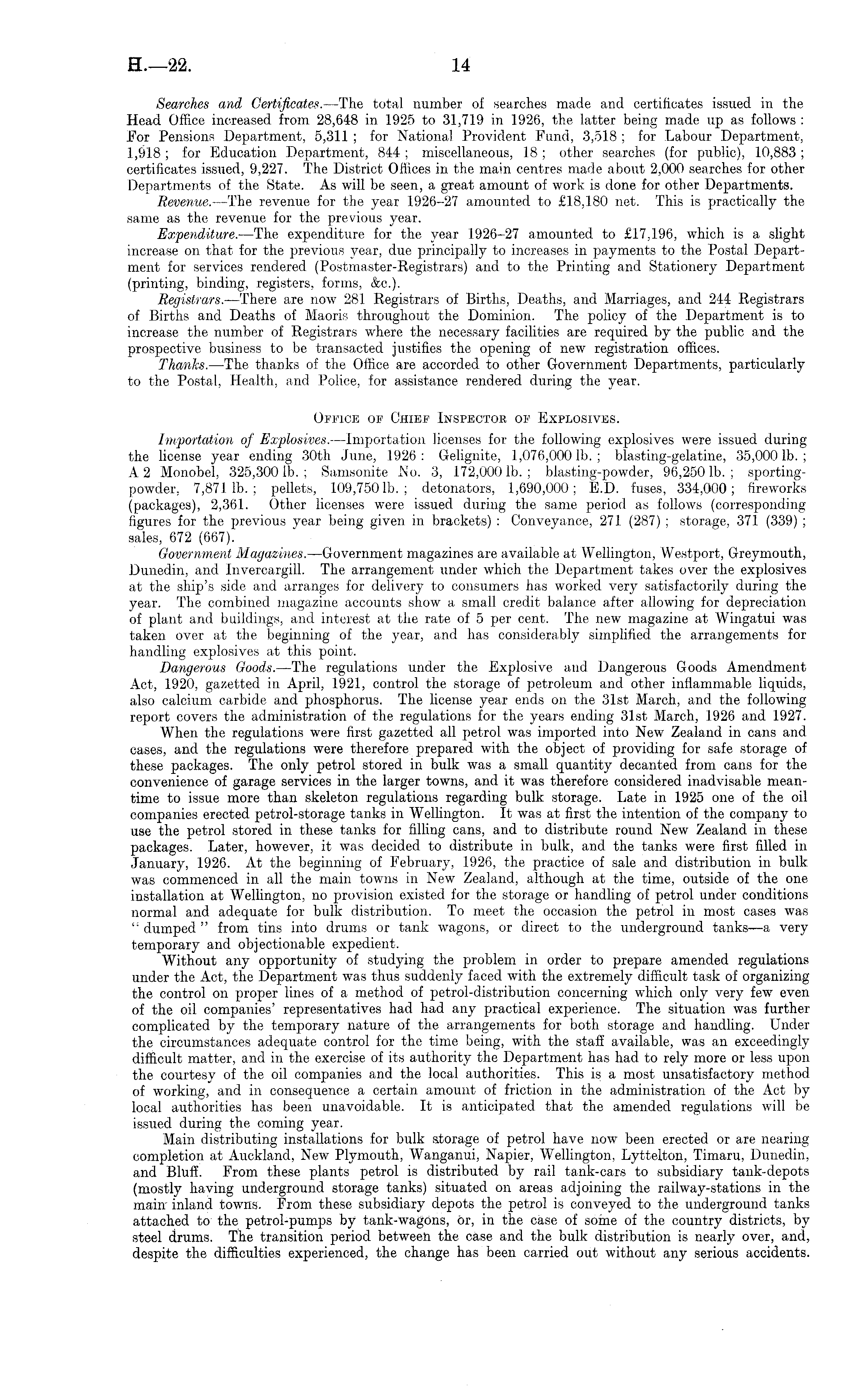 Searches and Certificates. —The total number of searches made and certificates issued in the Head Office increased from 28,64-8 in 1925 to 31,719 in 1926, the latter being made up as follows : For Pensions Department, 5,311 ; for National Provident Fund, 3,518 ; for Labour Department, 1,918; for Education Department, 844; miscellaneous, 18; other searches (for public), 10,883 ; certificates issued, 9,227. The District Offices in the main centres made about 2,000 searches for other Departments of the State. As will be seen, a great amount of work is done for other Departments. Revenue.—The revenue for the year 1926-27 amounted to £18,180 net. This is practically the same as the revenue for the previous year. Expenditure. —The expenditure for the year 1926-27 amounted to £17,196, which is a slight increase on that for the previous year, due principally to increases in payments to the Postal Department for services rendered (Postmaster-Registrars) and to the Printing and Stationery Department (printing, binding, registers, forms, &c.). Registrars. —There are now 281 Registrars of Births, Deaths, and Marriages, and 244 Registrars of Births and Deaths of Maoris throughout the Dominion. The policy of the Department is to increase the number of Registrars where the necessary facilities are required by the public and the prospective business to be transacted justifies the opening of new registration offices. Thanks. —The thanks of the Office are accorded to other Government Departments, particularly to the Postal, Health, and Police, for assistance rendered during the year. Office of Chief Inspector of Explosives. Importation of Explosives. —Importation licenses for the following explosives were issued during the license year ending 30th June, 1926 : Gelignite, 1,076,000 lb. ; blasting-gelatine, 35,000 lb. ; A 2 Monobel, 325,3001b.; Samsonite No. 3, 172,0001b.; blasting-powder, 96,2501b.; sportingpowder, 7,8711b.; pellets, 109,7501b.; detonators, 1,690,000; E.D. fuses, 334,000; fireworks (packages), 2,361. Other licenses were issued during the same period as follows (corresponding figures for the previous year being given in brackets) : Conveyance, 271 (287) ; storage, 371 (339) ; sales, 672 (667). Government Magazines. —Government magazines are available at Wellington, Westport, Greymouth, Dunedin, and Invercargill. The arrangement under which the Department takes over the explosives at the ship's side and arranges for delivery to consumers has worked very satisfactorily during the year. The combined magazine accounts show a small credit balance after allowing for depreciation of plant and buildings, and interest at the rate of 5 per cent. The new magazine at Wingatui was taken over at the beginning of the year, and has considerably simplified the arrangements for handling explosives at this point. Dangerous Goods. —The regulations under the Explosive and Dangerous Goods Amendment Act, 1920, gazetted in April, 1921, control the storage of petroleum and other inflammable liquids, also calcium carbide and phosphorus. The license year ends on the 31st March, and the following report covers the administration of the regulations for the years ending 31st March, 1926 and 1927. When the regulations were first gazetted all petrol was imported into New Zealand in cans and cases, and the regulations were therefore prepared with the object of providing for safe storage of these packages. The only petrol stored in bulk was a small quantity decanted from cans for the convenience of garage services in the larger towns, and it was therefore considered inadvisable meantime to issue more than skeleton regulations regarding bulk storage. Late in 1925 one of the oil companies erected petrol-storage tanks in Wellington. It was at first the intention of the company to use the petrol stored in these tanks for filling cans, and to distribute round New Zealand in these packages. Later, however, it was decided to distribute in bulk, and the tanks were first filled in January, 1926. At the beginning of February, 1926, the practice of sale and distribution in bulk was commenced in all the main towns in New Zealand, although at the time, outside of the one installation at Wellington, no provision existed for the storage or handling of petrol under conditions normal and adequate for bulk distribution. To meet the occasion the petrol in most cases was " dumped " from tins into drums or tank wagons, or direct to the underground tanks—a very temporary and objectionable expedient. Without any opportunity of studying the problem in order to prepare amended regulations under the Act, the Department was thus suddenly faced with the extremely difficult task of organizing the control on proper lines of a method of petrol-distribution concerning which only very few even of the oil companies' representatives had had any practical experience. The situation was further complicated by the temporary nature of the arrangements for both storage and handling. Under the circumstances adequate control for the time being, with the staff available, was an exceedingly difficult matter, and in the exercise of its authority the Department has had to rely more or less upon the courtesy of the oil companies and the local authorities. This is a most unsatisfactory method of working, and in consequence a certain amount of friction in the administration of the Act by local authorities has been unavoidable. It is anticipated that the amended regulations will be issued during the coming year. Main distributing installations for bulk storage of petrol have now been erected or are nearing completion at Auckland, New Plymouth, Wanganui, Napier, Wellington, Lyttelton, Timaru, Dunedin, and Bluff. From these plants petrol is distributed by rail tank-cars to subsidiary tank-depots (mostly having underground storage tanks) situated on areas adjoining the railway-stations in the main inland towns. From these subsidiary depots the petrol is con