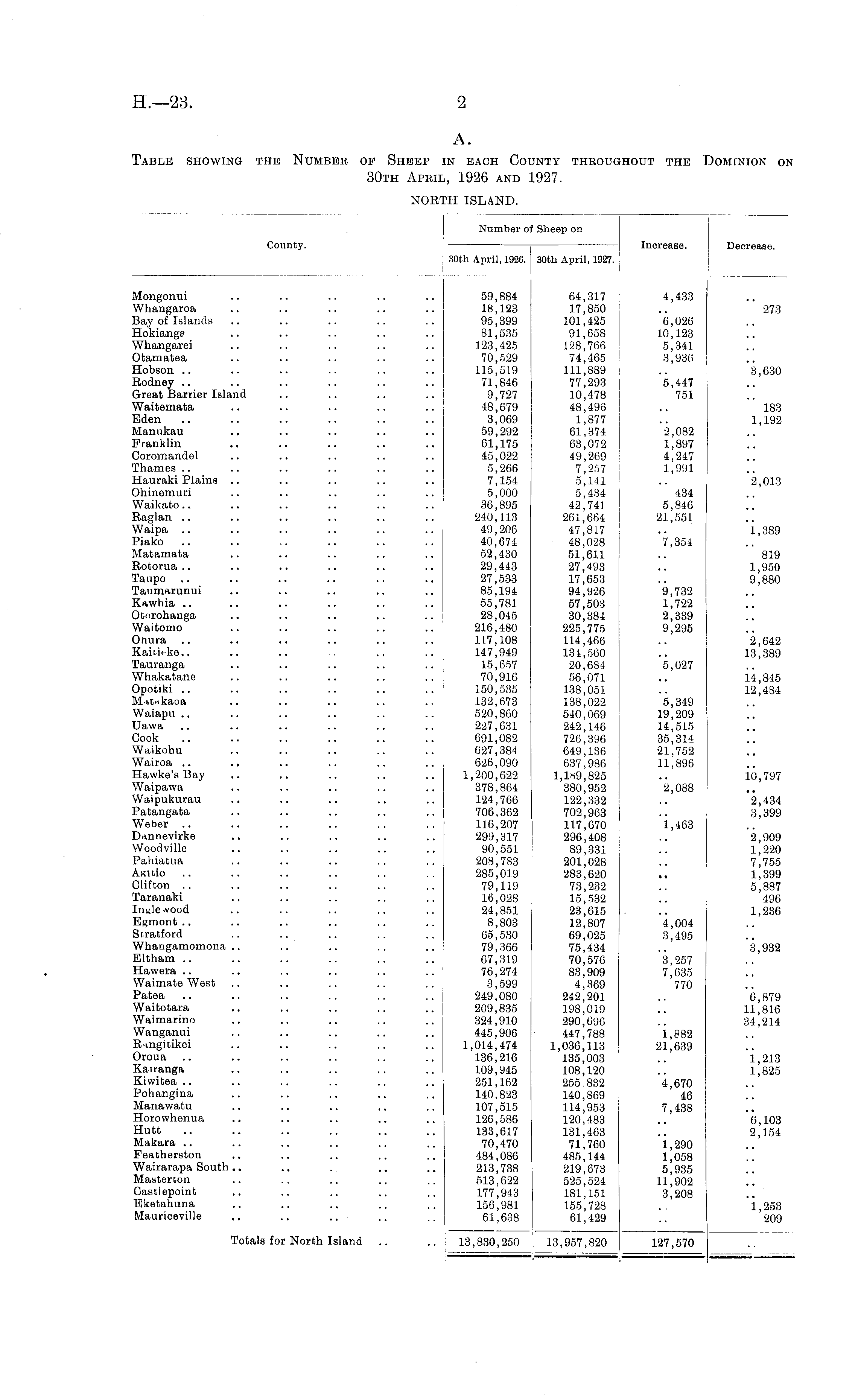 Number of Sheep on County. Increase. ! Decrease. 30th April, 1926. 30th April, 1927. Mongonui .. .. .. .. .. 59,884 64,317 4,433 Whangaroa .. .. .. .. .. 18,123 17,850 .. 273 Bay of Islands .. .. .. .. .. 95,399 101,425 6,026 Hokiange .. .. .. .. .. 81,535 91,658 10,123 Whangarei .. .. .. .. .. 123,425 128,766 5,341 Otamatea .. .. .. .. .. 70,529 74,465 3,936 Hobson .. .. .. .. .. .. 115,519 111,889 .. 3,630 Rodney .. .. .. .. .. .. 71,846 77,293 5,447 Great Barrier Island .. .. .. .. 9,727 10,478 751 Waitemata .. .. .. .. .. 48,679 48,496 .. 183 Eden .. .. .. .. .. .. 3,069 1,877 .. 1,192 Manukau .. .. .. .. .. 59,292 61,374 2,082 Franklin .. .. .. .. .. 61,175 63,072 1,897 Coromandel .. .. .. .. .. 45,022 49,269 4,247 Thames.. .. .. .. .. .. 5,266 7,257 1,991 Hauraki Plains .. .. .. .. .. 7,154 5,141 .. 2,013 Ohinemuri .. .. .. .. .. 5,000 5,434 434 Waikato.. .. .. .. .. .. 36,895 42,741 5,846 Raglan .. .. .. .. .. .. 240,113 261,664 21,551 Waipa .. .. .. .. .. .. 49,206 47,817 .. 1,389 Piako .. .. .. .. .. .. 40,674 48,028 7,354 Matamata .. .. .. .. .. 52,430 51,611 .. 819 Rotorua.. .. .. .. .. .. 29,443 27,493 .. 1,950 Taupo .. .. .. .. .. .. 27,533 17,653 .. 9,880 Taumarunui .. .. .. .. .. 85,194 94,926 9,732 Kawhia .. .. .. .. .. .. 55,781 57,503 1,722 Otorohanga .. .. .. .. .. 28,045 30,384 2,339 Waitomo .. .. .. .. .. 216,480 225,775 9,295 Ohura .. .. .. .. .. .. 117,108 114,466 .. 2,642 Kair,ieke.. .. .. .. .. .. 147,949 134,560 .. 13,389 Tauranga .. .. .. .. .. 15,657 20,684 5,027 Whakatane .. .. .. .. .. 70,916 56,071 .. 14,845 Opotiki .. .. .. .. .. .. 150,535 138,051 .. 12,484 M-ttukaoa .. .. .. .. 132,673 138,022 5,349 Waiapu.. .. .. .. .. .. 520,860 540,069 19,209 Uawa .. .. .. .. .. .. 227,631 242,146 14,515 Cook .. .. .. .. .. .. 691,082 726,396 35,314 Waikohu .. .. .. .. .. 627,384 649,136 21,752 Wairoa .. .. .. .. .. .. 626,090 637,986 11,896 Hawke's Bay .. .. .. .. .. 1,200,622 1,1*9,825 .. 10,797 Waipawa .. .. .. .. .. 378,864 380,952 2,088 Waipukurau .. .. .. .. .. 124,766 122,332 .. 2,434 Patangata .. .. .. .. .. 706,362 702,963 .. 3,399 Weber .. .. .. .. .. .. 116,207 117,670 1,463 Dannevirke .. .. .. .. .. 299,317 296,408 .. 2,909 Woodville .. .. .. .. .. 90,551 89,331 .. 1,220 Pahiatua .. .. .. .. .. 208,783 201,028 .. 7,755 Amtio .. .. .. .. .. .. 285,019 283,620 .. 1,399 Clifton .. .. .. .. .. .. 79,119 73,232 .. 5,887 Taranaki .. .. .. .. .. 16,028 15,532 .. 496 InyleArood .. .. .. .. .. 24,851 23,615 .. 1,236 Egmont .. .. .. .. .. .. 8,803 12,807 4,004 Stratford .. .. .. .. .. 65,530 69,025 3,495 Whaugamomona .. .. .. .. .. 79,366 75,434 .. 3,932 Eltham .. .. .. .. .. .. 67,319 70,576 3,257 Hawera .. .. .. .. .. .. 76,274 83,909 7,635 Waimate West .. .. .. .. .. 3,599 4,369 770 Patea .. .. .. .. .. .. 249,080 242,201 .. 6,879 Waitotara .. .. .. .. .. 209,835 198,019 .. 11,816 Waimarino .. .. .. .. .. 324,910 290,696 .. 34,214 Wanganui .. .. .. .. .. 445,906 447,788 1,882 Ringitikei .. .. .. .. .. 1,014,474 1,036,113 21,639 Oroua .. .. .. .. .. .. 136,216 135,003 .. 1,213 Kairanga .. .. .. .. .. 109,945 108,120 .. 1,825 Kiwitea .. .. .. .. .. .. 251,162 255.832 4,670 Pohangina .. .. .. .. .. 140,823 140,869 46 Manawatu .. .. .. .. .. 107,515 114,953 7,438 Horowhenua .. .. .. .. .. 126,586 120,483 .. 6,103 Hutt .. .. .. .. .. .. 133,617 131,463 .. 2,154 Makara .. .. .. .. .. .. 70,470 71,760 1,290 Peatherston .. .. .. .. .. 484,086 485,144 1,058 Wairarapa South.. .. . .. .. 213,738 219,673 5,935 Masterton .. .. .. .. .. 513,622 525,524 11,902 Oastlepoint .. .. .. .. .. 177,943 181,151 3,208 Eketahuna .. .. .. .. .. 156,981 155,728 ., 1,253 Mauriceville .. .. .. .. .. 61,638 61,429 .. 209 Totals for North Island .. .. 13,830,250 13,957,820 127,570