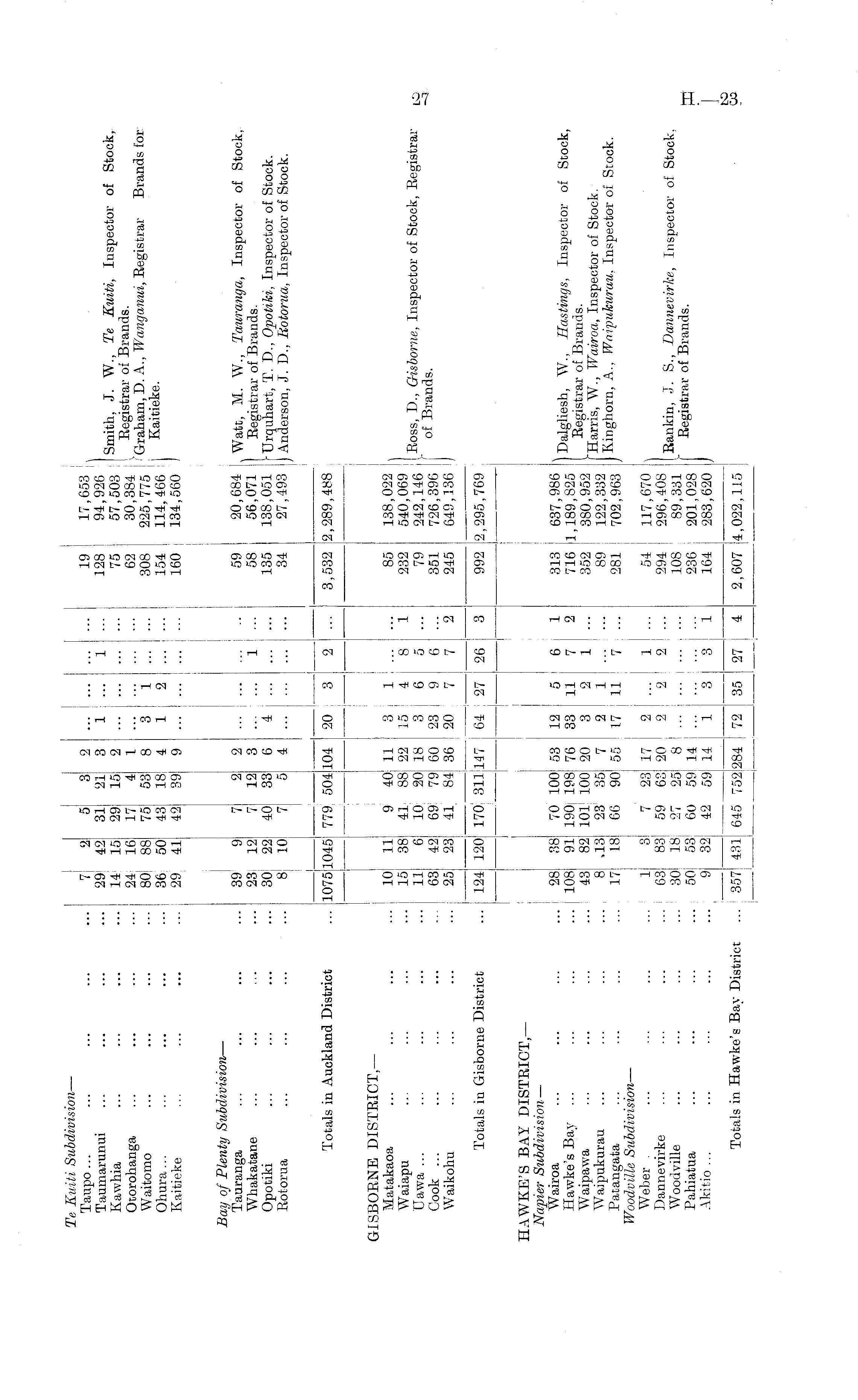 Te Kuiti Subdivision — Taupo... ... ... ... ••• 7 2 5 3 2 19 17,653 L Taumarunui ... ... ... ... 29 42 31 21 3 1 ... 1 j ■■■ 128 94,926 i , Q , , Kawhia 14 15 29 15 2 i 75 57,503 Smith J. W. Te Zmfo, Inspector of Stock, Otorohanga 24 16 17 4 1 ... 62 30,384 Registrar oi Brands. Waitomo 80 88 75 53 8 3 1 ' 308 225,775 ; Graham, D. A., Wanganui, Registrar Brands tor Ohura... ... ... ... ... 36 50 43 18 4 1 2 ! 154 114,466 I Kaltleke - Kaitieke ... ... ... ... 29 41 42 39 9 ... 160 134,560 I . I Bay of Plenty Subdivision — Tauranga ... ... ... ... 39 9 7 2 2 i 59 20,684 Watt, M. W., Tauranga, Inspector of Stock, Whakatane ... ... ... ... 23 12 7 12 3 1 ... 58 56,071 ) Registrar of Brands. Opotiki ... ... ... ... 30 22 40 33 6 4 135 138,051 i r Urquhart, T. T).,Opotiki, Inspector of Stock. Rotorua ... ... ... ... 8 10 7 5 4 34 27,493 j Anderson, J. D., Botorua, Inspector of Stock. Totals in Auckland District ... 10751045 779 504104 20 3 2 ... 3,532 2,289,488 GISBOBNE DISTBICT, — Matakaoa ... ... ... ... 10 11 9 40 11 3 1 85 138,022 , Waiapu ... ... ... ... 15 38 41 88 22 15 4 8 1 232 540,069 L x A Uawa 11 6 10 20 18 3 6 5 ... 79 242,146 D., Gtsborne, Inspector of Stock, Registrar Cook ... ... ... ... ... 63 42 69 79 60 23 9 6 ... 351 726,396 I Brands. Waikohu ... ... ... ... 25 23 41 84 36 20 7 7 2 245 649,136 j Totals in Gisborne District ... j 124 120 170 311147 64 27 26 3 992 2,295,769 HAWKE'S BAY DISTRICT,— Napier Subdivision — Wairoa ... ... ... ... 28 38 70 100 53 12 5 6 1 313 637,986 \ ~ , r , w „ ,. T , , „ . Hawke'sBay ... ... ... ... 108 91 190' 198 76 33 11 7 2 716 1,189,825 ) Dalghesh, W Hastings, Inspector of Stock, Waipawa ... ... ... ... 43 82 101 1 100 20 3 2 1 ... 352 380,952 of Brands. Waipukurau 8 13 23 35 7 2 1 ... 89 122 332 (Hams, W. TF™, Inspector of Stock. Patangata 17 18 66 90 55 17 11 7 ... 281 j Kl "g horn > A " Wm V ulmrau, Inspector or Stock. Woodville Subdivision — Weber . ... ... ... ... 1 3 7 23 17 2 ... 1 ... 54 117,670 \ Dannevirke ... ... ... ... 63 83! 59 63 20 2 2 2 ... 294 296,408 L, , - T e n -it » , cu , Woodville 30 18 27 25 8 108 89,331 J. $ Dannevirke, Inspector of Stock, Pahiatua ... ... ... ... 50 53 60 59 14 236 201,028 [ Re S lstlar o£ Bi ands. Akitio... ... ... ... ... 9 32 42 59 14 1 3 3 1 164 283,620 j Totals in Hawke's Bay District ... 357 431 645 752284 72 35 27 4 2,607 4,022,115 j