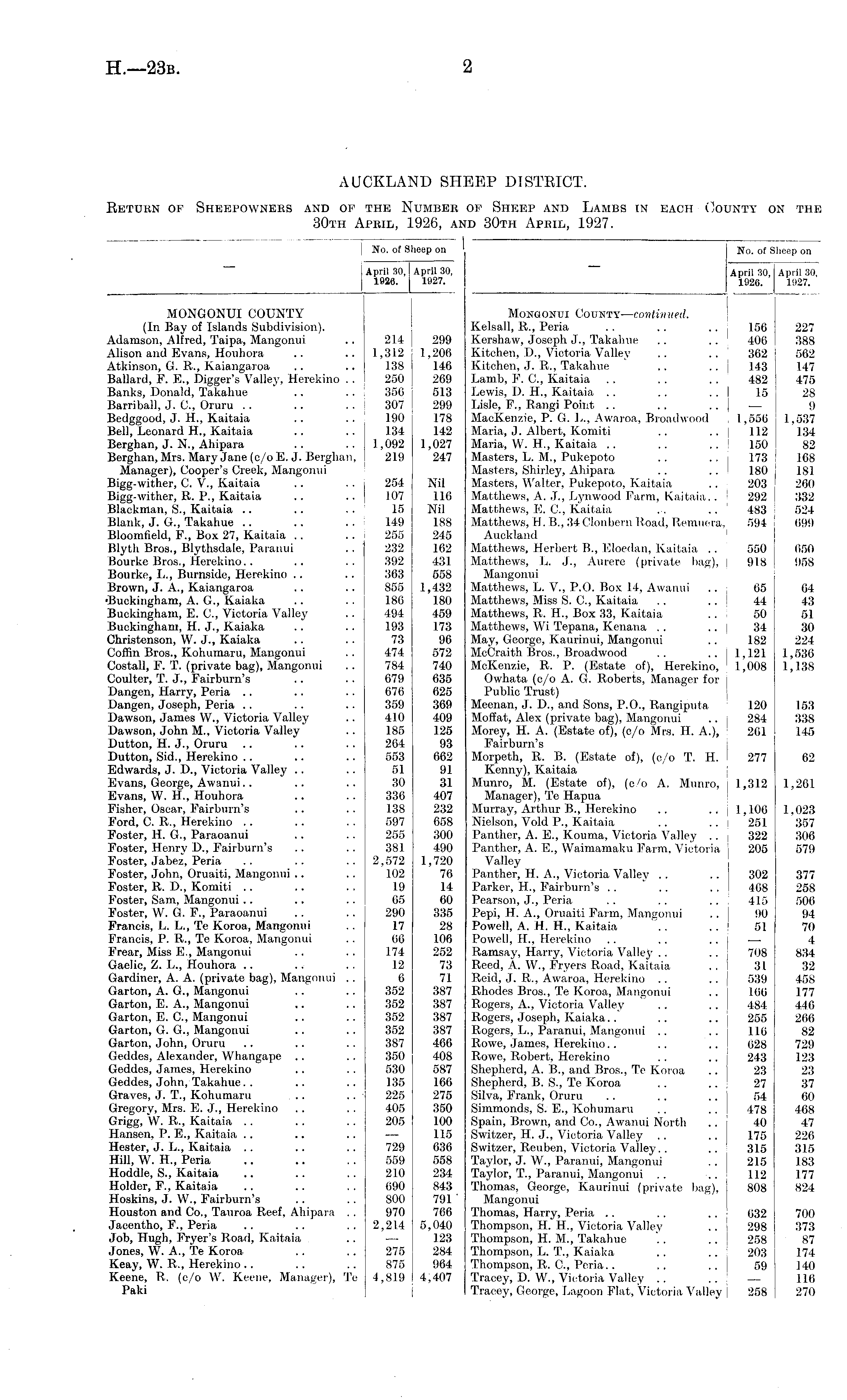 | No. of Sheep on April 30, April 30, 1920. 1827. MONGONUI COUNTY (In Bay of Islands Subdivision). Adamson, Alfred, Taipa, Mangonui .. 214 299 Alison and Evans, Houhora .. .. 1,312 1,206 Atkinson, G. R., Kaiangaroa . . .. 138 146 Ballard, F. E., Digger's Valley, Herekino .. 250 269 Banks, Donald, Takahue .. .. 356 513 Barriball, J. C., Oruru .. .. .. 307 299 Bedggood, J. H., Kaitaia .. .. 190 178 Bell, Leonard H., Kaitaia .. .. 134 142 Berghan, J. N., Ahipara .. .. 1,092 1,027 Berghan, Mrs. Mary Jane (c/oE. J. Berghan, 219 247 Manager), Cooper's Creek, Mangonui Bigg-wither, C. V., Kaitaia .. .. 254 Nil Bigg-wither, R. P., Kaitaia .. .. 107 116 Blackmail, S., Kaitaia .. .. .. 15 Nil Blank, J. G., Takahue .. .. .. : 149 188 Bloomfield, F., Box 27, Kaitaia .. .. 255 245 Blyth Bros., Blythsdale, Paranui .. 232 162 Bourke Bros., Herekino.. .. .. 392 431 Bourke, L., Burnside, Herekino .. .. 363 558 Brown, J. A., Kaiangaroa .. .. 855 1,432 ■Buckingham, A. G., Kaiaka .. .. 186 180 Buckingham, E. C., Victoria Valley .. 494 459 Buckingham, H. J., Kaiaka .. .. 193 173 Christenson, W. J., Kaiaka .. .. 73 96 Coffin Bros., Kohumaru, Mangonui .. 474 572 Costall, F. T. (private bag), Mangonui .. 784 740 Coulter, T. J., Fairburn's .. .. 679 635 Dangen, Harry, Peria .. .. .. 676 625 Dangen, Joseph, Peria .. .. .. 359 369 Dawson, James W., Victoria Valley .. 410 409 Dawson, John M., Victoria Valley . . 185 125 Dutton, H. J., Oruru .. .. . . 264 93 Dutton, Sid., Herekino .. .. .. 553 662 Edwards, J. D., Victoria Valley .. .. 51 91 Evans, George, Awanui.. .. .. 30 31 Evans, W. H., Houhora .. .. 336 407 Fisher, Oscar, Fairburn's .. .. 138 232 Ford, C. R., Herekino .. .. .. 597 658 Foster, H. G., Paraoanui .. .. 255 300 Foster, Henry D., Fairburn's .. .. 381 490 Foster, Jabez, Peria .. .. .. 2,572 1,720 Foster, John, Oruaiti, Mangonui .. .. 102 76 Foster, R. D., Komiti .. .. .. 19 14 Foster, Sam, Mangonui.. .. .. 65 60 Foster, W. G. F., Paraoanui .. .. 290 335 Francis, L. L., Te Koroa, Mangonui .. 17 28 Francis, P. R., Te Koroa, Mangonui .. 66 106 Frear, Miss E., Mangonui .. . . 174 252 Gaelic, Z. L., Houhora .. .. .. 12 73 Gardiner, A. A. (private bag), Mangonui .. 6 71 Garton, A. G., Mangonui .. .. 352 387 Garton, E. A., Mangonui .. .. 352 387 Garton, E. C., Mangonui .. .. 352 387 Garton, G. G., Mangonui .. .. 352 387 Garton, John, Oruru .. .. .. 387 466 Geddes, Alexander, Whangape .. .. 350 408 Geddes, James, Herekino .. .. 530 587 Geddes, John, Takahue. . .. .. 135 166 Graves, J. T., Kohumaru .. .. 225 275 Gregory, Mrs. E. J., Herekino .. . . 405 350 Grigg, W. R., Kaitaia .. .. .. 205 100 Hansen, P. E., Kaitaia .. .. .. — 115 Hester, J. L., Kaitaia .. .. .. 729 636 Hill, W. H., Peria .. .. . . 559 558 Hoddle, S., Kaitaia .. .. .. 210 234 Holder, F., Kaitaia .. .. . . 690 843 Hoskins, J. W., Fairburn's .. .. 800 791 Houston and Co., Tauroa Reef, Ahipara .. 970 766 Jacentho, F., Peria .. .. .. 2,214 5,040 Job, Hugh, Fryer's Road, Kaitaia .. — 123 Jones, W. A., Te Koroa .. .. 275 284 Keay, W. R., Herekino.. .. .. 875 964 Keene, R. (c/o W. Keene, Manager), Te 4,819 4,407 Paki