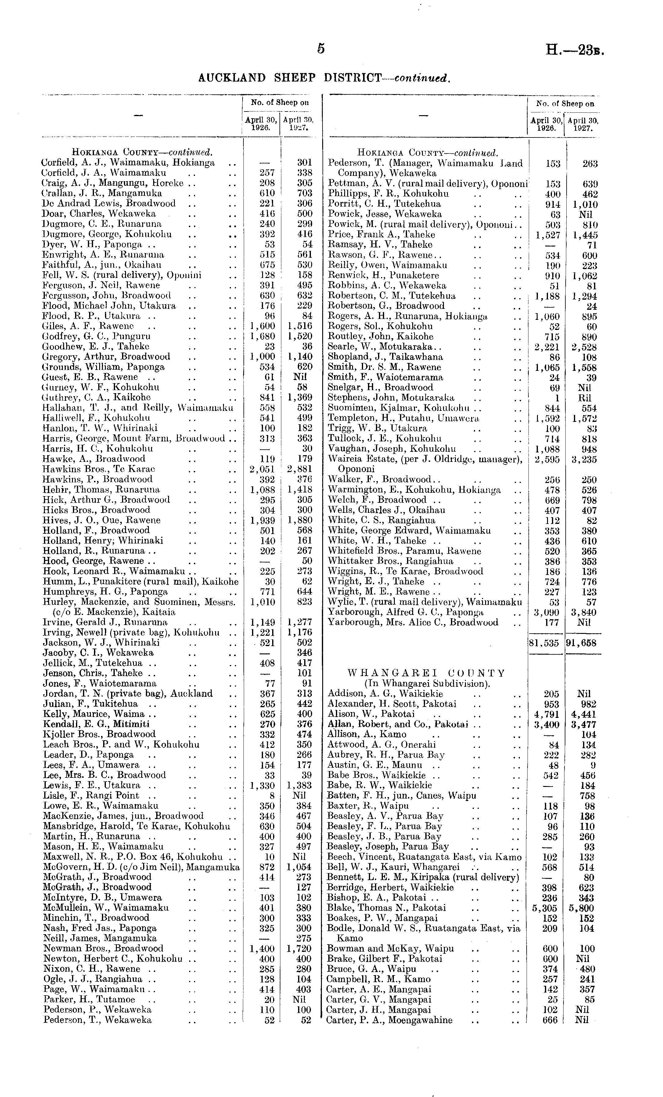 [ No. of Sheep on April 30, April 30, : 1926. 1927. Hokiakga County—continued. Corfield, A. J., Waimamaku, Hokianga .. —• 301 Corfield, J. A., Waimamaku . . .. 257 338 Craig, A. J., Mangungu, Horeke .. .. 208 305 Crallan, J. R, Mangamuka .. .. 610 703 De Andrad Lewis, Broadwood .. .. 221 306 Boar, Charles, Wekaweka .. .. 416 500 Dugmore, C. E., Runaruna .. .. 240 299 Dugmore, George, Kohukohu .. .. 392 416 Dyer, W. H., Paponga .. .. .. 53 54 Enwright, A. E., Runaruna .. .. 515 561 Faithful, A., jun., Okaihau .. .. 675 530 Fell, W. S. (rural delivery), Oponini .. 128 158 Ferguson, J. Neil, Rawene .. .. 391 495 Fergusson, John, Broadwood .. .. 630 632 Flood, Michael John, Utakura .. .. 176 229 Flood, R. P., Utakura .. .. .. 96 84 Giles, A. F., Rawene .. .. .. 1,600 1,516 Godfrey, G. C., Punguru .. .. 1,680 1,520 Goodhew, E. J., Taheke ;. .. 23 36 Gregory, Arthur, Broadwood .. .. 1,000 1,140 Grounds, William, Paponga .. .. 534 620 Guest, E. B., Rawene .. .. .. 61 Nil Gurney, W. F., Kohukohu .. .. 54 58 Guthrey, C. A., Kaikohe .. .. 841 1,369 Hallahan, T. J., and Reilly, Waimamaku 558 532 Halliwell, F., Kohukohu .. .. 541 499 Hanlon, T. W., Whirinaki .. .. 100 182 Harris, George, Mount Farm, Broadwood .. 313 363 Harris, H. C., Kohukohu .. .. — 30 Hawke, A., Broadwood .. .. 119 179 Hawkins Bros., Te Karae .. .. 2,051 2,881 Hawkins, P., Broadwood .. .. 392 376 Hehir, Thomas, Runaruna .. .. 1,088 1,418 Hick, Arthur G., Broadwood .. .. 295 305 Hicks Bros., Broadwood .. .. 304 300 Hives, J. 0., Oue, Rawene .. .. 1,939 1,880 Holland, F., Broadwood .. .. 501 568 Holland, Henry; Whirinaki .. .. 140 161 Holland, R., Runaruna .. .. .. 202 267 Hood, George, Rawene .. .. .. — 50 Hook, Leonard R., Waimamaku .. .. 225 273 Humm, L., Punakitere (rural mail), Kaikohe 30 62 Humphreys, H. G., Paponga .. .. 771 644 Hurley, Mackenzie, and Suominen, Messrs. 1,010 823 (e/o E. Mackenzie), Kaitaia Irvine, Gerald J., Runaruna .. .. 1,149 1,277 Irving, Newell (private bag), Kohukohu .. 1,221 1,176 Jackson, W. J., Whirinaki .. .. . 521 502 Jacoby, C. I., Wekaweka .. .. — 346 Jellick, M., Tutekehua .. .. .. 408 417 Jenson, Chris., Taheke .. .. .. — 101 Jones, F., Waiotemarama .. .. 77 91 Jordan, T. N. (private bag), Auckland .. 367 313 Julian, F., Tukitehua .. .. .. 265 442 Kelly, Maurice, Waima .. .. .. 625 400 Kendall, E. G., Mitimiti .. .. 270 376 Kjoller Bros., Broadwood .. .. 332 474 Leach Bros., P. and W., Kohukohu .. 412 350 Leader, D., Paponga .. .. .. 180 266 Lees, F. A., Umawera .. .. .. 154 177 Lee, Mrs. B. C., Broadwood .. .. 33 39 Lewis, F. E., Utakura .. .. .. 1,330 1,383 Lisle, F., Rangi Point .. .. .. 8 Nil Lowe, E. R., Waimamaku .. .. 350 384 MacKenzie, James, jun., Broadwood .. 346 467 Mansbridge, Harold, Te Karae, Kohukohu 630 504 Martin, H., Runaruna .. .. .. 400 400 Mason, H. E., Waimamaku .. .. 327 497 Maxwell, N. R., P.O. Box 46, Kohukohu .. 10 Nil McGovern, H. D. (c/o Jim Neil), Mangamuka 872 1,054 McGrath, J., Broadwood .. .. 414 273 McGrath, J., Broadwood .. .. — 127 Mclntyre, D. B., Umawera .. .. 103 102 McMullein, W., Waimamaku . . .. 401 380 Minchin, T., Broadwood .. .. 300 333 Nash, Fred Jas., Paponga .. . . 325 300 Neill, James, Mangamuka .. .. — 275 Newman Bros., Broadwood .. .. 1,400 1,720 Newton, Herbert C., Kohukohu .. .. 400 400 Nixon, C. H., Rawene .. .. .. 285 280 Ogle, J. J., Rangiahua .. .. . . 128 104 Page, W., Waimamaku .. .. . . 414 403 Parker, H., Tutamoe .. .. .. 20 Nil Pederson, P., Wekaweka . . . . 110 100 Pederson, T., Wekaweka ... .. 52 52