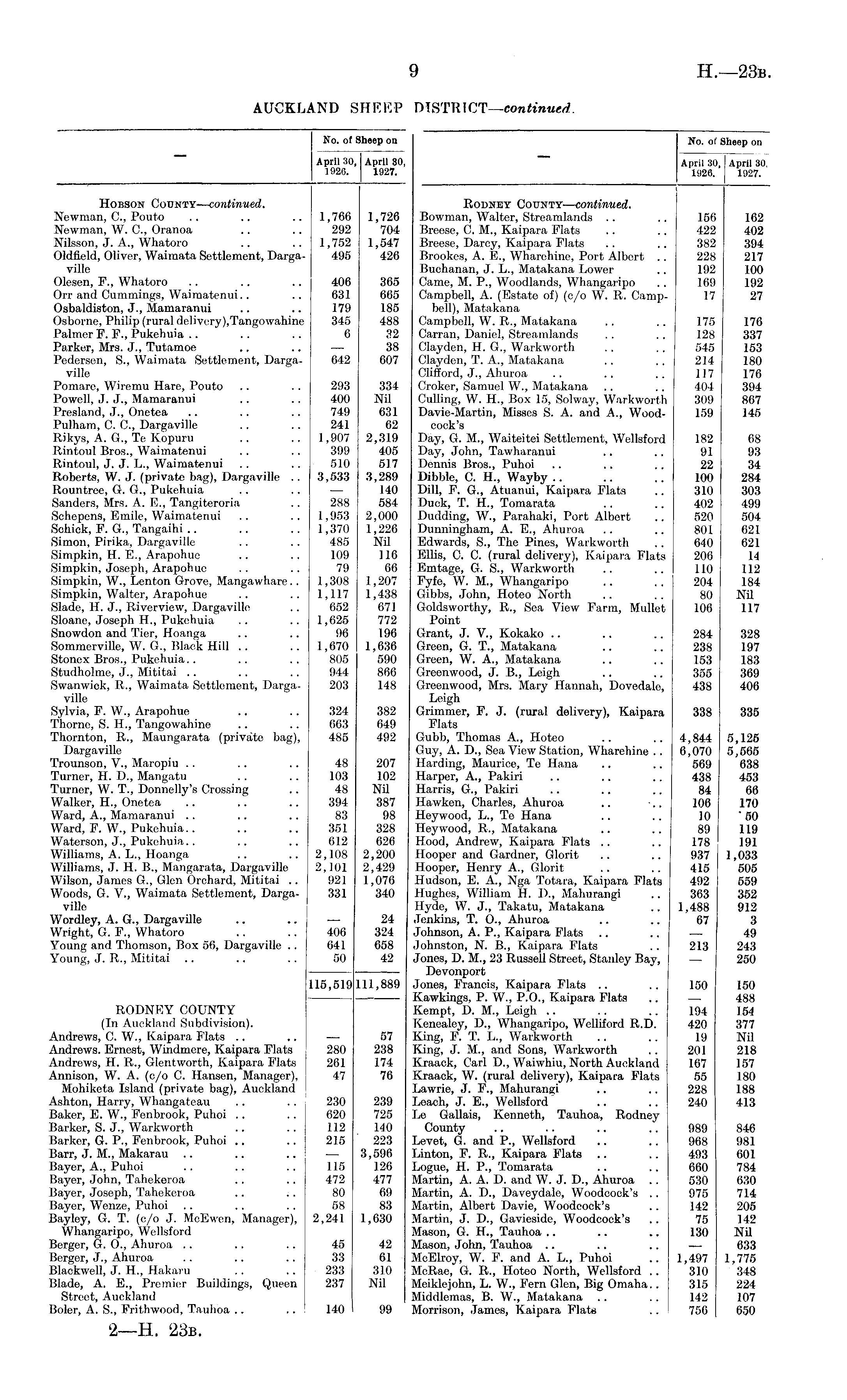 No. of Sheep on April 30, April 30. 1926. 1927. Rodney County—continued. Bowman, Walter, Strearalands .. .. 156 162 Breese, C. M., Kaipara Plata .. .. 422 402 Breese, Darcy, Kaipara Flats .. .. 382 394 Brookes, A. E., Wharehine, Port Albert .. 228 217 Buchanan, J. L., Matakana Lower .. 192 100 Came, M. P., Woodlands, Whangaripo .. 169 192 Campbell, A. (Estate of) (o/o W. R. Camp- 17 27 bell), Matakana Campbell, W. R., Matakana .. .. 175 176 Carran, Daniel, Streamlands .. .. 128 337 Clayden, H. G., Warkworth .. .. 545 153 Clayden, T. A., Matakana .. .. 214 180 Clifford, J., Ahuroa .. .. .. 117 176 Croker, Samuel W., Matakana .. .. 404 394 Culling, W. H., Box 15, Solway, Warkworth 309 867 Davie-Martin, Misses S. A. and A., Wood- 159 145 cock's Day, G. M., Waiteitei Settlement, Wellsford 182 68 Day, John, Tawharanui .. .. 91 93 Dennis Bros., Puhoi .. .. .. 22 34 Dibble, C. H., Wayby .. .. .. 100 284 Dill, F. G., Atuanui, Kaipara Flats .. 310 303 Duck, T. H„ Tomarata .. .. 402 499 Dudding, W., Parahaki, Port Albert .. 520 504 Dunningham, A. E., Ahuroa .. .. 801 621 Edwards, S., The Pines, Warkworth .. 640 621 Ellis, C. C. (rural delivery), Kaipara Flats 206 14 Emtage, G. S., Warkworth .. .. 110 112 Fyfe, W. M., Whangaripo .. .. 204 184 Gibbs, John, Hoteo North .. .. 80 Nil Goldsworthy, R., Sea View Farm, Mullet 106 117 Point Grant, J. V., Kokako .. .. .. 284 328 Green, G. T., Matakana .. .. 238 197 Green, W. A., Matakana .. .. 153 183 Greenwood, J. B., Leigh .. .. 355 369 Greenwood, Mrs. Mary Hannah, Dovedale, 438 406 Leigh Grimmer, F. J. (rural delivery), Kaipara 338 335 Flats Gubb, Thomas A., Hoteo .. .. 4,844 5,125 Guy, A. D., Sea View Station, Wharehine .. 6,070 5,565 Harding, Maurice, Te Hana .. .. 569 638 Harper, A., Pakiri .. .. .. 438 453 Harris, G., Pakiri .. .. .. 84 66 Hawken, Charles, Ahuroa .. .. 106 170 Hey wood, L., Te Hana .. .. 10 "50 Heywood, R., Matakana .. .. 89 119 Hood, Andrew, Kaipara Flats .. .. 178 191 Hooper and Gardner, Glorit .. .. 937 1,033 Hooper, Henry A., Glorit .. .. 415 505 Hudson, E. A., Nga Totara, Kaipara Flats 492 659 Hughes, William H. D., Mahurangi .. 363 352 Hyde, W. J., Takatu, Matakana .. 1,488 912 Jenkins, T. O., Ahuroa .. .. 67 3 Johnson, A. P., Kaipara Flats .. .. — 49 Johnston, N. B., Kaipara Flats .. 213 243 Jones, D. M., 23 Russell Street, Stanley Bay, — 250 Devonport Jones, Francis, Kaipara Flats .. .. 150 150 Kawkings, P. W., P.O., Kaipara Flats .. — 488 Kempt, D. M., Leigh .. .. .. 194 154 Kenealey, D., Whangaripo, Welliford R.D. 420 377 King, F. T. L., Warkworth .. .. 19 Nil King, J. M., and Sons, Warkworth .. 201 218 Kraack, Carl D., Waiwhiu, North Auckland 167 157 Kraack, W. (rural delivery), Kaipara Flats 55 180 Lawrie, J. F., Mahurangi .. .. 228 188 Leach, J. E., Wellsford .. .. 240 413 Le Gallais, Kenneth, Tauhoa, Rodney County .. .. .. .. 989 846 Levet, G. and P., Wellsford .. .. 968 981 Linton, F. R., Kaipara Flats .. .. 493 601 Logue, H. P., Tomarata .. .. 660 784 Martin, A. A. D. and W. J. D., Ahuroa .. 530 630 Martin, A. D., Daveydale, Woodcock's .. 975 714 Martin, Albert Davie, Woodcock's .. 142 205 Martin, J. D., Gavieside, Woodcock's .. 75 142 Mason, G. H., Tauhoa .. .. .. 130 Nil Mason, John, Tauhoa .. .. .. — 633 McElroy, W. F. and A. L., Puhoi .. 1,497 1,775 McRae, G. R., Hoteo North, Wellsford .. 310 348 Meiklejohn, L. W., Fern Glen, Big Omaha.. 315 224 Middlemas, B. W., Matakana .. .. 142 107 Morrison, James, Kaipara Flats .. 756 650
