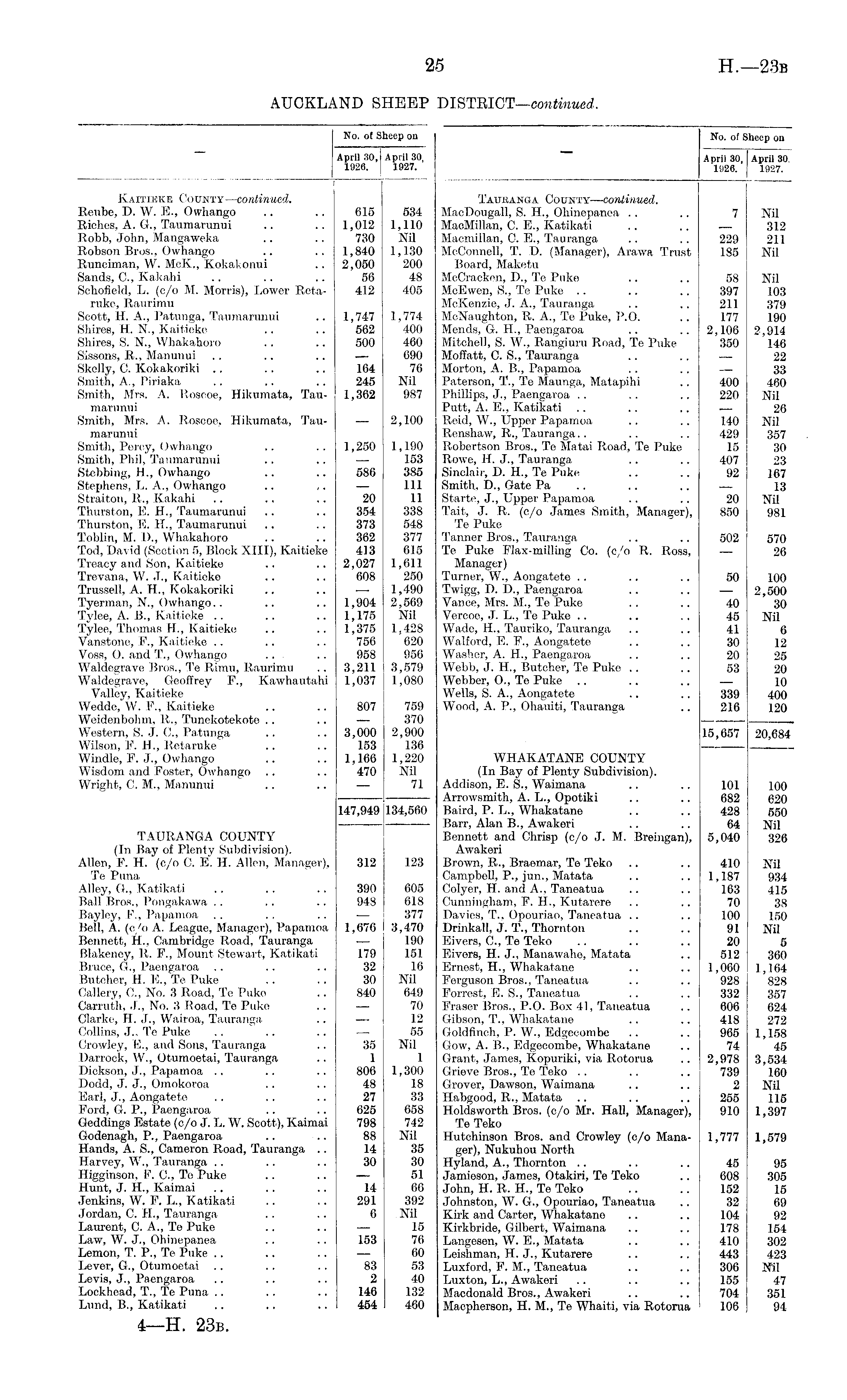 No. of Sheep on April 30, I April 30. 1926. | 1927. Tauranga County —continued. MacBougall, 8. H., Ohinepanea . . .. 7 Nil MaoMillan, C. E., Katikati .. .. — 312 Macmillan, G. E., Tauranga .. .. 229 211 McConnell, T. I). (Manager), Arawa Trust 185 Nil Board, Maketu McCracken, 1)., Te Puke .. .. 58 Nil McEwen, S., Te Puke .. .. .. 397 103 MeKenzie, J. A., Tauranga .. .. 211 379 McNaughton, R. A., Te Puke, P.O. .. 177 190 Mends, 6. H., Paengaroa .. .. 2,106 2,914 Mitchell, S. W., Rangiuru Road, Te Puke 350 146 Moffatt, C. S., Tauranga .. .. — 22 Morton, A. B., Papamoa .. .. — 33 Paterson, T., Te Maunga, Matapihi .. 400 460 Phillips, J., Paengaroa . . .. .. 220 Nil Putt, A. E., Katikati .. .. .. — 26 Reid, W., Upper Papamoa .. .. 140 Nil Renshaw, R., Tauranga.. .. .. 429 357 Robertson Bros., Te Matai Road, Te Puke 15 30 Rowe, H. J., Tauranga .. .. 407 23 Sinclair, D. H., Te Puke .. .. 92 167 Smith, 1)., Gate Pa .. .. — 13 Starte, J., Upper Papamoa .. .. 20 Nil Tait, J. R. (c/o James Smith, Manager), 850 981 Te Puke Tanner Bros., Tauranga .. .. 502 570 Te Puke Flax-milling Co. (o/o R. Ross, — 26 Manager) Turner, W., Aongatete .. .. .. 50 100 Twigg, D. D., Paengaroa .. .. — 2,500 Vance, Mrs. M., Te Puke .. .. 40 30 Vercoe, J. L., Te Puke .. .. . . 45 Nil Wade, H., Tauriko, Tauranga .. .. 41 6 Walford, E. F., Aongatete .. .. 30 12 Washer, A. H., Paengaroa .. .. 20 25 Webb, J. H., Butcher, Te Puke .. .. 53 20 Webber, O., Te Puke .. .. .. — 10 Wells, S. A., Aongatete .. .. 339 400 Wood, A. P., Ohauiti, Tauranga .. 216 120 15,657 20,684 WHAKATANE COUNTY (In Bay of Plenty Subdivision). Addison, E. S., Waimana .. .. 101 100 Arrowsmith, A. L., Opotiki .. .. 682 620 Baird, P. L., Whakatane .. .. 428 550 Barr, Alan B., Awakeri .. .. 64 Nil Bennett and Chrisp (c/o J. M. Breingan), 5,040 326 Awakeri Brown, R., Braemar, Te Teko .. .. 410 Nil Campbell, P., jun., Matata .. .. 1,187 934 Colyer, H. and A., Taneatua .. .. 163 415 Cunningham, F. H., Kutarere .. .. 70 38 Davies, T., Opouriao, Taneatua .. .. 100 150 Drinkall, J. T., Thornton .. .. 91 Nil Eivers, C., Te Teko .. .. .. 20 5 Eivers, H. J., Manawahe, Matata .. 512 360 Ernest, H., Whakatane .. .. 1,060 1,164 Ferguson Bros., Taneatua .. .. 928 828 Forrest, E. S., Taneatua .. .. 332 357 Fraser Bros., P.O. Box 41, Taneatua .. 606 624 Gibson, T., Whakatane .. .. 418 272 Goldfinch, P. W., Edgecombe .. .. 965 1,158 Gow, A. B., Edgecombe, Whakatane .. 74 45 Grant, James, Kopuriki, via Rotorua .. 2,978 3,534 Grieve Bros., Te Teko .. .. .. 739 160 Grover, Dawson, Waimana .. .. 2 Nil Habgood, R., Matata .. .. .. 255 118 Holdsworth Bros, (c/o Mr. Hall, Manager), 910 1,397 Te Teko Hutchinson Bros, and Crowley (c/o Mana- 1,777 1,579 ger), Nukuhou North Hyland, A., Thornton .. .. .. 45 95 Jamieson, James, Otakiri, Te Teko .. 608 305 John, H. R. H., Te Teko .. .. 152 15 Johnston, W. G., Opouriao, Taneatua .. 32 69 Kirk and Carter, Whakatane .. .. 104 92 Kirkbride, Gilbert, Waimana .. .. 178 154 Langesen, W. E., Matata .. .. 410 302 Leishman, H. J., Kutarere .. .. 443 423 Luxford, F. M., Taneatua .. .. 306 Nil Luxton, L., Awakeri .. .. .. 155 47 Macdonald Bros., Awakeri .. .. 704 351 Macpherson, H. M., Te Whaiti, via Rotorua 106 94