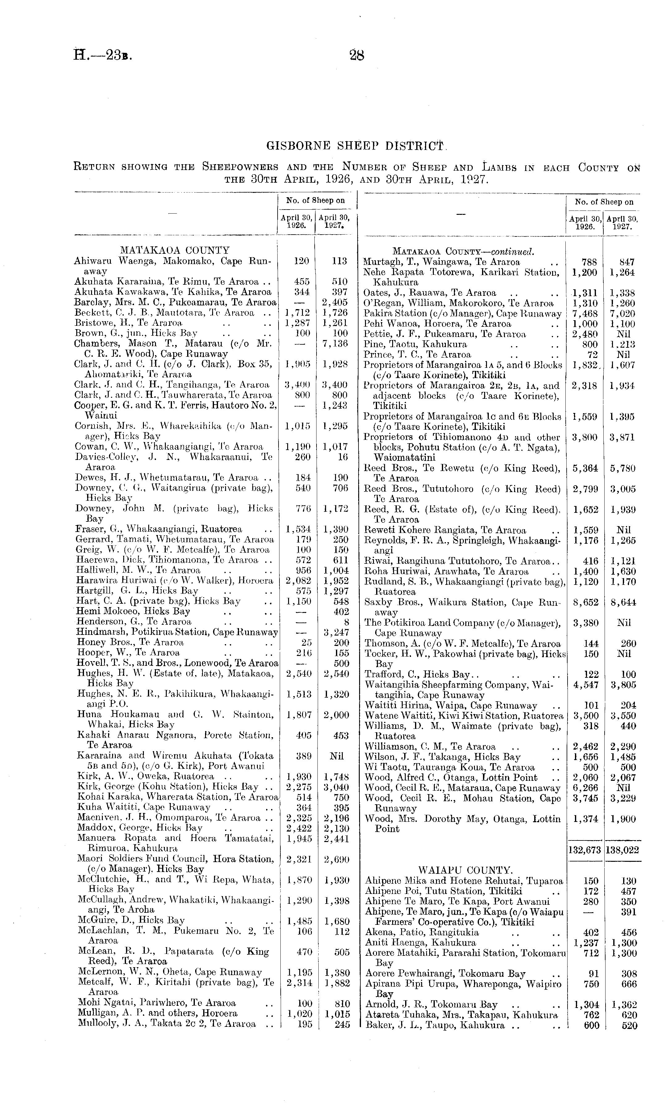 GISBORNE SHEEP DISTRICT. Return showing the Sheepowners and the Number of Sheep and Lambs in each County on the 30th April, 1926, and 30th April, 1927.
