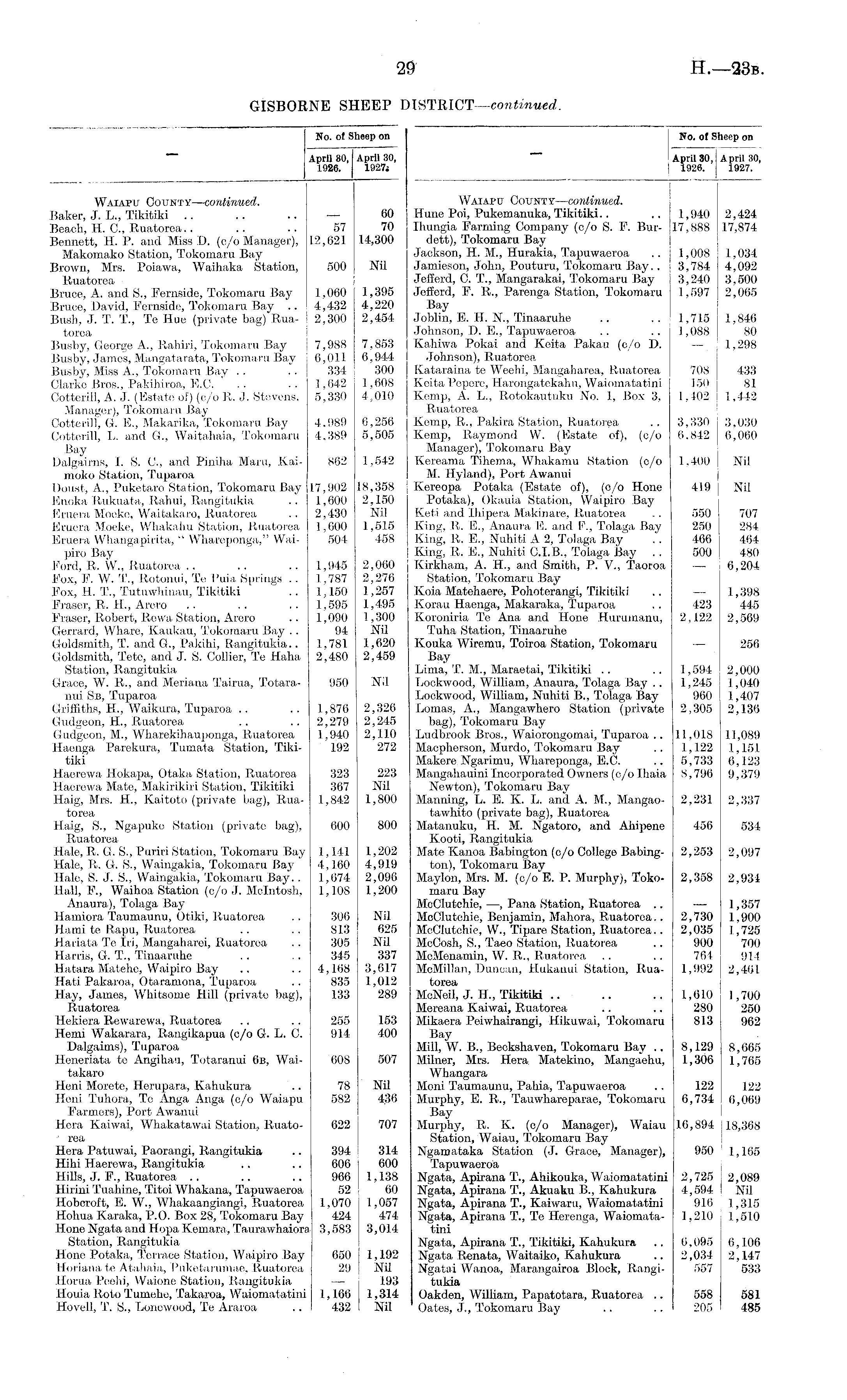 No. of Sheep on — April 80, April 30, 1926. 1927i Waiaplt County—continued. Baker, J. L., Tikitiki .. .. .. — 60 Beach, H. C., Ruatorea.. .. •. 57 70 Bennett, H. P. and Miss D. (o/o Manager), 12,621 14,300 Makomako Station, Tokomaru Bay Brown, Mrs. Poiawa, Waihaka Station, 500 Nil Ruatorea ! Bruce, A. and S., Fernside, Tokomaru Bay 1,060 1,395 Bruce, David, Fernside, Tokomaru Bay .. 4,432 4,220 Bush, J. T. T., Te Hue (private bag) Rua- 2,300 2,454 torea Busby, George A., Rahiri, Tokomaru Bay 7,988 7,853 Busby, James, Mangatarata, Tokomaru Bay 6,011 6,944 Busby, Miss A., Tokomaru Bay .. .. 334 300 Clarke Bros., Pakihiroa, E.C. . . 1,642 1,608 Cotterill, A. J. (Estate of) (c/o R. J. Stevens, 5,330 4,010 Manager), Tokomaru Bay Cotterill, G. E., Makarika, Tokomaru Bay 4,989 6,256 Cotterill, ].. and G., Waitahaia, Tokomaru 4,389 5,505 Bay Dalgairns, I. S. C., and Piniha Maru, Kai- 862 1,542 moko Station, Tuparoa Doust, A., Puketaro Station, Tokomaru Bay 17,902 18,358 Enoka Rukuata, Rahui, Rangitukia .. 1,600 2,150 Eruera Moeke, Waitakaro, Ruatorea .. 2,430 Nil Eruera Moeke, Whakahu Station, Ruatorea 1,600 1,515 Eruera Whangapirita, " Whareponga," Wai- 504 458 piro Bay Ford, R. W., Ruatorea .. .. .. 1,945 2,060 Fox, F. W. T., Rotonui, Te Puia Springs .. 1,787 2,276 Fox, H. T., Tutuwhinau, Tikitiki .. 1,150 1,257 Eraser, R. H., Arero .. .. .. 1,595 1,495 Fraser, Robert, Rewa Station, Arero .. 1,090 1,300 Gerrard, Whare, Kaukau, Tokomaru Bay .. 94 Nil Goldsmith, T. and G., Pakihi, Rangitukia.. 1,781 1,620 Goldsmith, Tete, and J. S. Collier, Te Haha 2,480 2,459 Station, Rangitukia Grace, W. R., and Meriana Tairua, Totara- 950 Nil nui Sb, Tuparoa Griffiths, H., Waikura, Tuparoa .. .. 1,876 2,326 Gudgeon, H., Ruatorea .. .. 2,279 2,245 Gudgeon, M., Wharekihauponga, Ruatorea 1,940 2,110 Haenga Parekura, Tumata Station, Tiki- 192 272 tiki Haerewa. Hokapa, Otaka Station, Ruatorea 323 223 Haerewa Mate, Makirikiri Station, Tikitiki 367 Nil Haig, Mrs. H., Kaitoto (private bag), Rua- 1,842 1,800 torea Haig, S., Ngapuke Station (private bag), 600 800 Hale, R. G. S., Puriri Station, Tokomaru Bay 1,141 1,202 Hale, R. G. S., Waingakia, Tokomaru Bay 4,160 4,919 Hale, S. J. S., Waingakia, Tokomaru Bay.. 1,674 2,096 Hall, F., Waihoa Station (c/o <T. Mcintosh, 1,108 1,200 Anaura), Tolaga Bay Hamiora Taumaunu, Otiki, Ruatorea . . 306 Nil Hami te Rapu, Ruatorea .. .. 813 625 Hariata Te Iri, Mangaharei, Ruatoroa .. 305 Nil Harris, G. T., Tinaaruhe .. .. 345 337 Hatara Matehe, Waipiro Bay .. .. 4,168 3,617 Hati Pakaroa, Otaramona, Tuparoa .. 835 1,012 Hay, James, Whitsome Hill (private bag), 133 289 Ruatorea Hekiera Rewarewa, Ruatorea .. .. 255 153 Hemi Wakarara, Rangikapua (c/o G. L. C. 914 400 Dalgaims), Tuparoa Heneriata to Angihau, Totaranui 6b, Wai- 608 507 takaro Heni Morete, Herupara, Kahukura .. 78 Nil Heni Tuhora, Te Anga Anga (c/o Waiapu 582 436 Farmers), Port Awanui Hera Kaiwai, Whakatawai Station,, Ruato- 622 707 * rea Hera Patuwai, Paorangi, Rangitukia .. 394 314 Hihi Haerewa, Rangitukia .. .. 606 600 Hills, J. F., Ruatorea .. .. .. 966 1,138 Hirini Tuahine, Titoi Whakana, Tapuwaeroa 52 60 Hobcroft, E. W., Whakaangiangi, Ruatorea 1,070 1,057 Hohua Karaka, P.O. Box 28, Tokomaru Bay 424 474 Hone Ngata and Hopa Kemara, Taurawhaiora 3,583 3,014 Station, Rangitukia Hone Potaka, Terrace Station, Waipiro Bay 650 1,192 Horianate Atahaia, Puketarumae, Ruatorea 29 Nil Horua Peehi, Waione Station, Rangitukia — 193 Houia Roto Tumehe, Takaroa, Waiomatatini 1,166 1,314 Hovell, T. S., Lonewood, Te Araroa .. 432 Nil
