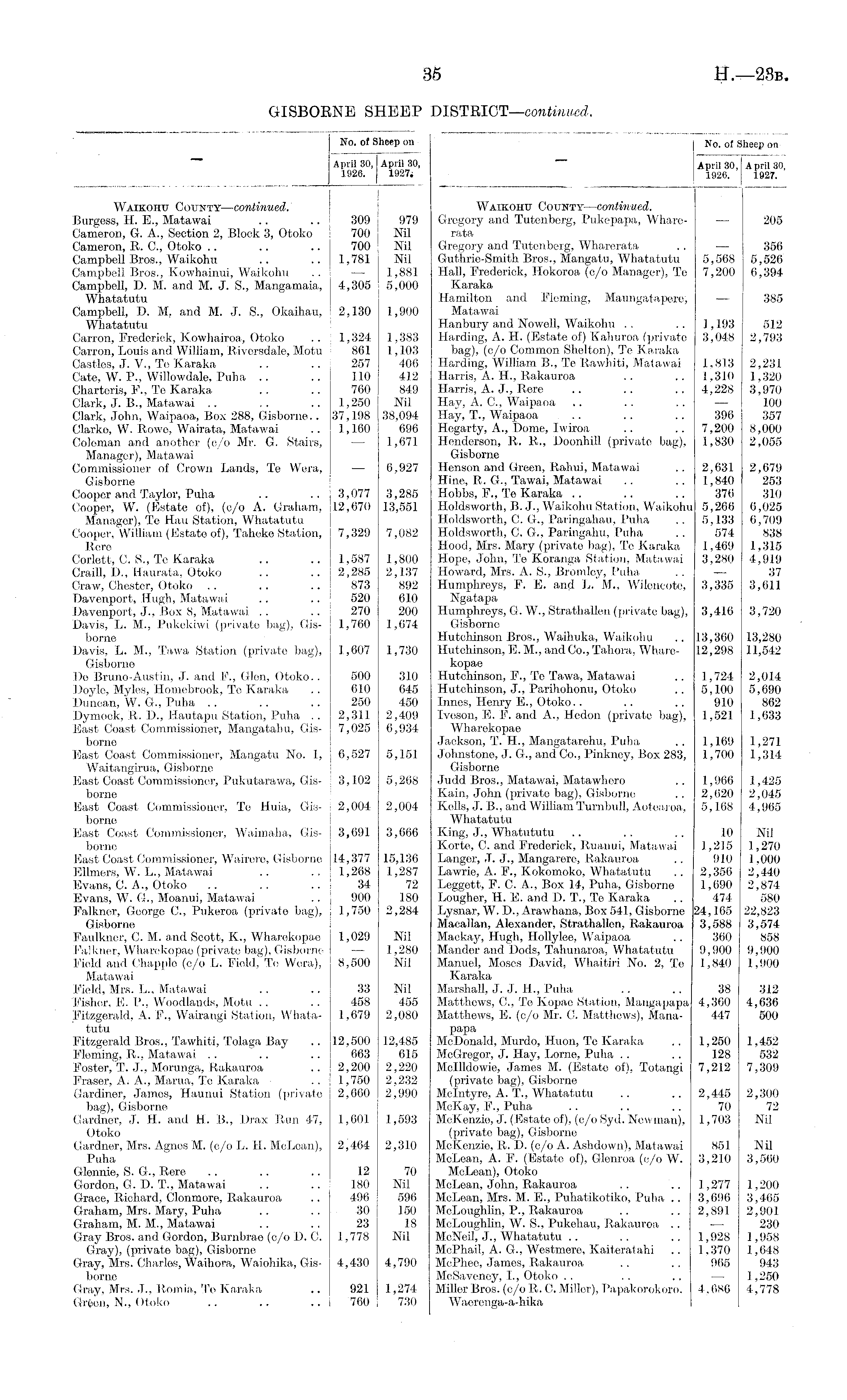 No. of Sheep on April 30, April 30, 1926. 1927; Waikohu County—continued. Burgess, H. E., Matawai .. .. 309 979 Cameron, G. A., Section 2, Block 3, Otoko 700 Nil Cameron, R. C., Otoko .. .. .. 700 Nil Campbell Bros., Waikohu .. .. 1,781 Nil Campbell Bros., Kowhainui, Waikohu .. — 1,881 Campbell, D. M. and M. J. S., Mangamaia, 4,305 5,000 Whatatutu Campbell, D. M. and M. J. S., Okaihau, 2,130 1,900 Whatatutu Carron, Frederick, Kowhairoa, Otoko .. 1,324 1,383 Carron, Louis and William, Riversdale, Motu 861 1,103 Castles, J. V., Te Karaka .. .. 257 406 Cate, W. P., Willowdale, Puha .. .. 110 412 Charteris, F., Te Karaka .. .. 760 849 Clark, J. B., Matawai .. . . . . 1,250 Nil Clark, John, Waipaoa, Box 288, Gisborne.. 37,198 38,094 Clarke, W. Rowe, Wairata, Matawai .. 1,160 696 Coleman and another (c/o Mr. G. Stairs, — 1,671 Manager), Matawai Commissioner of Crown Lands, Te Wera, — 6,927 Gisborne Cooper and Taylor, Puha .. .. 3,077 3,285 Cooper, W. (Estate of), (c/o A. Graham, 12,670 13,551 Manager), To Hau Station, Whatatutu Cooper, William (Estate of), Taheke Station, 7,329 7,082 Rere Corlett, C. S., Te Karaka .. .. 1,587 1,800 Craill, D., Haurata, Otoko .. .. 2,285 2,137 Craw, Chester, Otoko .. .. .. 873 892 Davenport, Hugh, Matawai .. .. 520 610 Davenport, J., Box 8, Matawai .. . . 270 200 Davis, L. M., Pukekiwi (private bag), Gis- 1,760 1,674 borne Davis, L. M., Tawa Station (private bag), 1,607 1,730 Gisborne Do Bruno-Austin, J. and F., Glen, Otoko.. 500 310 Doyle, Myles, Homebrook, Te Karaka .. 610 645 Duncan, W. G., Puha .. . . .. 250 450 Dymock, R. D., Hautapu Station, Puha . . 2,311 2,409 East Coast Commissioner, Mangatabu, Gis- 7,025 6,934 borne East Coast Commissioner, Mangatu No. 1, 6,527 5,151 Waitangirua, Gisborne East Coast Commissioner, Pukutarawa, Gis- 3,102 5,268 borne East Coast Commissioner, Te Huia, Gis- 2,004 2,004 borne East Coast Commissioner, Waimaha, Gis- 3,691 3,666 borne East Coast Commissioner, Waircre, Gisborne 14,377 15,136 Ellmers, W. L., Matawai .. . . 1,268 1,287 Evans, C. A., Otoko .. . . .. 34 72 Evans, W. G., Moanui, Matawai .. 900 180 Falkner, George C., Pukeroa (private bag), 1,750 2,284 Gisborne Faulkner, C. M. and Scott, K., Wharekopae 1,029 Nil Falkner, Wharekopae (private bag), Gisborne — 1,280 Field and Chappie (c/o L. Field, Te Wera), 8,500 Nil Matawai Field, Mrs. L., Matawai .. .. 33 Nil Fisher, E. P., Woodlands, Motu .. .. 458 455 Fitzgerald, A. F., Wairangi Station, Whata- 1,679 2,080 tutu Fitzgerald Bros., Tawhiti, Tolaga Bay .. 12,500 12,485 Fleming, R., Matawai .. .. .. 663 615 Foster, T. J., Morunga, Rakauroa .. 2,200 2,220 Fraser, A. A., Marua, Te Karaka .. 1,750 2,232 Gardiner, James, Haunui Station (private 2,660 2,990 bag), Gisborne Gardner, J. H. and H. B., Drax Run 47, 1,601 1,593 Otoko Gardner, Mrs. Agnes M. (c/o L. H. McLean), 2,464 2,310 Puha Glennie, S. G., Rere .. .. .. 12 70 Gordon, G. D. T., Matawai .. .. 180 Nil Grace, Richard, Clonmore, Rakauroa .. 496 596 Graham, Mrs. Mary, Puha .. . . 30 150 Graham, M. M., Matawai . . . . 23 18 Gray Bros, and Gordon, Burnbrae (c/o D. C. 1,778 Nil Gray), (private bag), Gisborne Gray, Mrs. Charles, Waihora, Waiohika, Gis- 4,430 4,790 borne Gray, Mrs. J., Romia, Te Karaka .. 921 1,274 N., Otoko .. .. .. 760 730