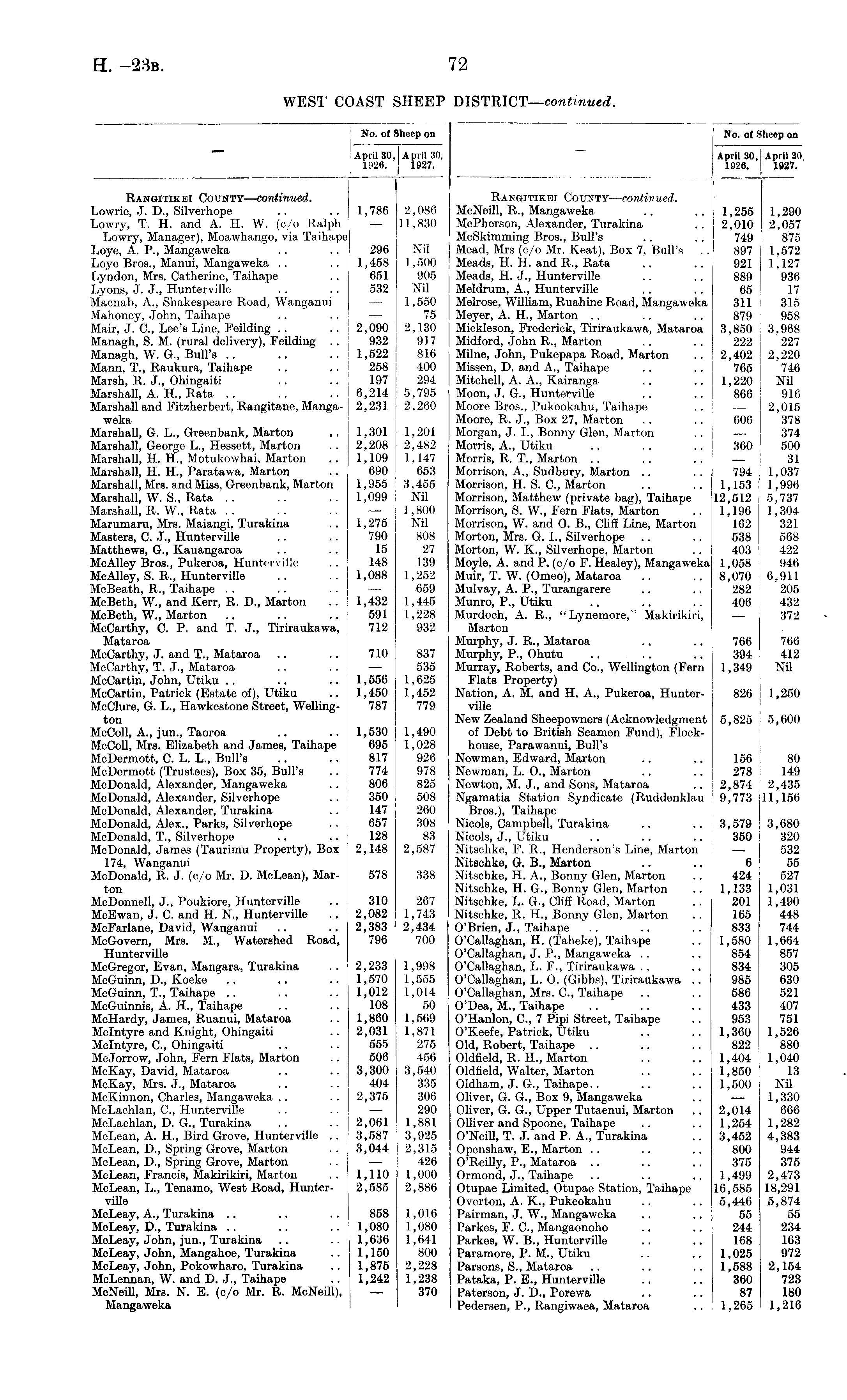 No. of Sheep on April 30, April 30, 1926. 1027. Rangitikei County—continued. McNeill, R., Mangaweka .. .. 1,255 1,290 McPherson, Alexander, Turakina .. 2,010 2,057 McSkimming Bros., Bull's .. .. 749 875 1 Mead, Mrs (e/o Mr. Keat), Box 7, Bull's .. 897 1,572 ! Meads, H. H. and R., Rata .. .. 921 1,127 j Meads, H. J., Hunterville .. .. 889 936 I Meldrum, A., Hunterville .. .. 65 17 I Melrose, William, Ruahine Road, Mangaweka 311 315 I Meyer, A. H., Marton .. .. .. 879 958 I Miekleson, Frederick, Xiriraukawa, Mataroa 3,850 3,968 I Midford, John R., Marton .. .. 222 227 Milne, John, Pukepapa Road, Marton .. 2,402 2,220 Missen, D. and A., Taihape .. .. 765 j 746 Mitchell, A. A., Kairanga .. .. 1,220 | Nil Moon, J. G., Hunterville .. .. 866 j 916 Moore Bros., Pukeokahu, Taihape .. — j 2,015 Moore, R. J., Box 27, Marton .. .. 606 : 378 Morgan, J. I., Bonny Glen, Marton .. — 374 Morris, A., Utiku .. .. .. 360 500 Morris, R. T., Marton .. .. .. — 31 Morrison, A., Sudbury, Marton .. .. 794 i 1,037 Morrison, H. S. C., Marton .. .. 1,153 j 1,996 Morrison, Matthew (private bag), Taihape 12,512 | 5,737 Morrison, S. W., Fern Flats, Marton .. 1,196 1,304 Morrison, W. and O. B., Cliff Line, Marton 162 321 Morton, Mrs. G. I., Silverhope .. .. 538 568 Morton, W. K., Silverhope, Marton .. 403 422 Moyle, A. and P. (e/o F. Healey), Mangaweka 1,058 ; 946 Muir, T. W. (Omeo), Mataroa .. .. 8,070 j 6,911 Mulvay, A. P., Turangarere .. .. 282 j 205 Munro, P., Utiku .. .. .. 406 432 Murdoch, A. R., "Lynemore," Makirikiri, — 372 Marton Murphy, J. R., Mataroa .. .. 766 766 Murphy, P., Ohutu .. .. .. 394 412 Murray, Roberts, and Co., Wellington (Fern 1,349 Nil Flats Property) Nation, A. M. and H. A., Pukeroa, Hunter- 826 1,250 ville New Zealand Sheepowners (Acknowledgment 5,825 5,600 of Debt to British Seamen Fund), Flockhouse, Parawanui, Bull's Newman, Edward, Marton .. .. 156 80 Newman, L. O., Marton .. .. 278 149 Newton, M. J., and Sons, Mataroa .. 2,874 2,435 Ngamatia Station Syndicate (Ruddenklau 9,773 11,156 Bros.), Taihape Nicols, Campbell, Turakina .. .. | 3,579 3,680 Nicols, J., Utiku .. .. .. I 350 320 Nitschke, F. R., Henderson's Line, Marton — 532 Nitschke, G. B., Marton .. .. 6 55 Nitschke, H. A., Bonny Glen, Marton .. 424 527 Nitschke, H. G., Bonny Glen, Marton .. 1,133 1,031 Nitschke, L. G., Cliff Road, Marton .. 201 1,490 Nitschke, R. H., Bonny Glen, Marton .. 165 448 O'Brien, J., Taihape .. .. .. 833 744 O'Callaghan, H. (Taheke), Taihape .. 1,580 1,664 O'Callaghan, J. P., Mangaweka .. .. 854 857 O'Callaghan, L. F., Tiriraukawa .. .. 834 305 O'Callaghan, L. O. (Gibbs), Tiriraukawa .. 985 630 O'Callaghan, Mrs. C., Taihape .. .. 586 521 O'Dea, M., Taihape .. .. .. 433 407 O'Hanlon, C., 7 Pipi Street, Taihape .. 953 751 0'K.eefe, Patrick, Utiku .. .. 1,360 1,526 Old, Robert, Taihape .. .. .. 822 880 Oldfield, R. H., Marton .. .. 1,404 1,040 Oldfield, Walter, Marton .. .. 1,850 13 Oldham, J. G., Taihape.. .. .. 1,500 Nil Oliver, G. G., Box 9, Mangaweka .. — 1,330 Oliver, G. G., Upper Tutaenui, Marton .. 2,014 666 Olliver and Spoone, Taihape .. .. 1,254 1,282 O'Neill, T. J. and P. A., Turakina .. 3,452 4,383 Openshaw, E., Marton .. .. .. 800 944 O'Reilly, P., Mataroa .. .. .. 375 375 Ormond, J., Taihape .. .. .. 1,499 2,473 Otupae Limited, Otupae Station, Taihape 16,585 18,291 Overton, A. K., Pukeokahu .. .. 5,446 5,874 Pairman, J. W., Mangaweka .. .. 55 55 Parkes, F. C., Mangaonolio .. .. 244 234 Parkes, W. B., Hunterville .. .. 168 163 Paramore, P. M., Utiku .. .. 1,025 972 Parsons, S., Mataroa .. .. .. 1,588 2,154 Pataka, P. E., Hunterville .. .. 360 723 Paterson, J. D., Porewa .. .. 87 180 Pedersen, P., Rangiwaea, Mataroa .. 1,265 1,216