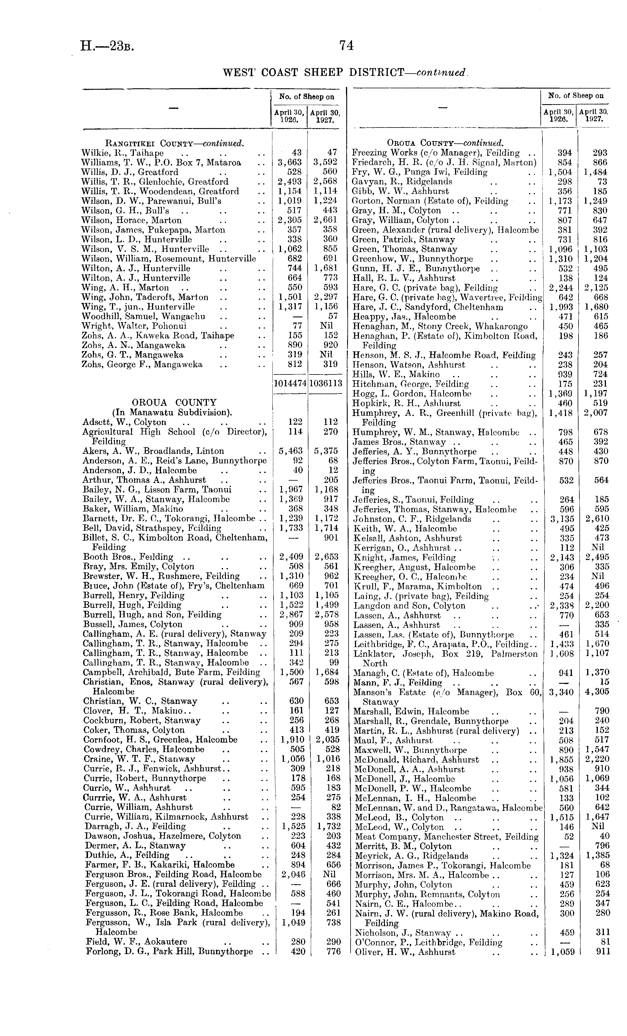 No. of Sheep on April 30, April 30, 1926. 1927. Obotja Cootty—continued. Freezing Works (c/o Manager), Feilding .. 394 293 Friedarch, H. R. (e/o J. H. Signal, Marton) S54 866 Fry, W. G., Punga Iwi, Feilding .. 1,504 1,484 Gavyan, R., Ridgelands .. .. 298 73 Gibb, W. W., Ashhurst .. .. 356 185 Gorton, Norman (Estate of), Feilding .. 1,173 1,249 Gray, H. M., Colyton .. .. .. 771 830 Gray, William, Colyton .. .. .. 807 647 Green, Alexander (rural delivery), Halcombe 381 392 Green, Patrick, Stanway .. .. 731 816 Green, Thomas, Stanway .. .. 1,096 1,103 Greenhow, W., Bunnythorpe .. .. 1,310 1,204 Gunn, H. J. E., Bunnythorpe .. .. 532 495 Hall, R. L. V., Ashhurst .. .. 138 124 Hare, G. C. (private bag), Feilding .. 2,244 2,125 Hare, G. C. (private bag), Wavortree, Feilding 642 668 Hare, .T. C., Sandyford, Cheltenham .. 1,993 1,680 Heappy, Jas., Halcombe .. .. 471 615 Henaghan, M., Stony Creek, Whakarongo 450 465 Henaghan, P. (Estate of), Kimbolton Road, 198 186 Feilding Henson, M. S. J., Halcombe Road, Feilding 243 257 Henson, Watson, Ashhurst .. .. 238 204 Hills, W. E., Makino .. .. .. 939 724 Hitchman, George, Feilding .. .. 175 231 Hogg, L. Gordon, Halcombe .. .. 1,369 1,197 Hopkirk, R. H., Ashhurst .. .. 460 519 Humphrey, A. R., Greenhill (private bag), 1,418 2,007 Feilding Humphrey, W. M., Stanway, Halcombe .. 798 678 James Bros., Stanway .. .. .. 465 392 Jefferies, A. Y., Bunnythorpe .. .. 448 430 Jefferies Bros., Colyton Farm, Taonui, Feild- 870 870 ing Jefferies Bros., Taonui Farm, Taonui, Feild- 532 564 ing Jefferies, S., Taonui, Feilding .. .. 264 185 Jefferies, Thomas, Stanway, Halcombe .. 596 595 Johnston, C. F., Ridgelands .. .. 3,135 2,610 Keith, W. A., Halcombe .. .. 495 425 Kelsall, Ashton, Ashhurst .. .. 335 473 Kerrigan, O., Ashhurst .. .. .. 112 Nil Knight, James, Feilding ;. .. 2,143 2,495 Kreegher, August, Halcombe .. .. 306 335 Kreegher, O. C., Halcombe .. .. 234 Nil Krull, F., Marama, Kimbolton .. .. 474 496 Laing, J. (private bag), Feilding .. 254 254 Langdon and Son, Colyton .. .2,338 2,200 Lassen, A., Ashhurst .. .. .. 770 653 Lassen, A., Ashhurst .. .. .. — 335 Lassen, Las. (Estate of), Bunnythorpe .. 461 514 Leithbridge, F. C., Arapata, P.O., Feilding.. 1,433 1,670 Linklater, Joseph, Box 219, Palmerston 1,608 1,107 North Managh, C. (Estate of), Halcombe .. 941 1,370 Mann, F. J., Feilding .. .. .. — 15 Manson's Estate (c/o Manager), Box 60, 3,340 4,305 Stanway Marshall, Edwin, Halcombe .. .. — 790 Marshall, R., Grendale, Bunnythorpe .. 204 240 Martin, R. L., Ashhurst (rural delivery) .. 213 152 Maul, F., Ashhurst .. .. .. 508 517 Maxwell, W., Bunnythorpe .. .. 890 1,547 McDonald, Richard, Ashhurst .. .. 1,855 2,220 McDonell, A. A., Ashhurst .. .. 938 910 McDonell, J., Halcombe .. .. 1,056 1,069 McDonell, P. W., Halcombe .. .. 581 344 McLennan, I. H., Halcombe .. .. 133 102 McLennan, W. and D., Rangatawa, Halcombe 560 642 McLeod, B., Colyton .. .. .. 1,515 1,647 McLeod, W., Colyton .. .. .. 146 Nil Meat Company, Manchester Street, Feilding 52 40 Merritt, B. M., Colyton .. .. — 796 Meyriek, A. G., Ridgelands .. .. 1,324 1,385 Morrison, James P., Tokorangi, Halcombe 181 68 Morrison, Mrs. M. A., Halcombe .. .. 127 106 Murphy, John, Colyton .. .. 459 623 Murphy, John, Remnants, Colyton .. 256 254 Nairn, C. E., Halcombe.. .. .. 289 347 Nairn, J. W. (rural delivery), Makino Road, 300 280 Feilding Nicholson, J., Stanway .. .. .. 459 311 I O'Connor, P., Leithbridge, Feilding .. — 81 I Oliver, H. W., Ashhurst .. .. 1,059 911