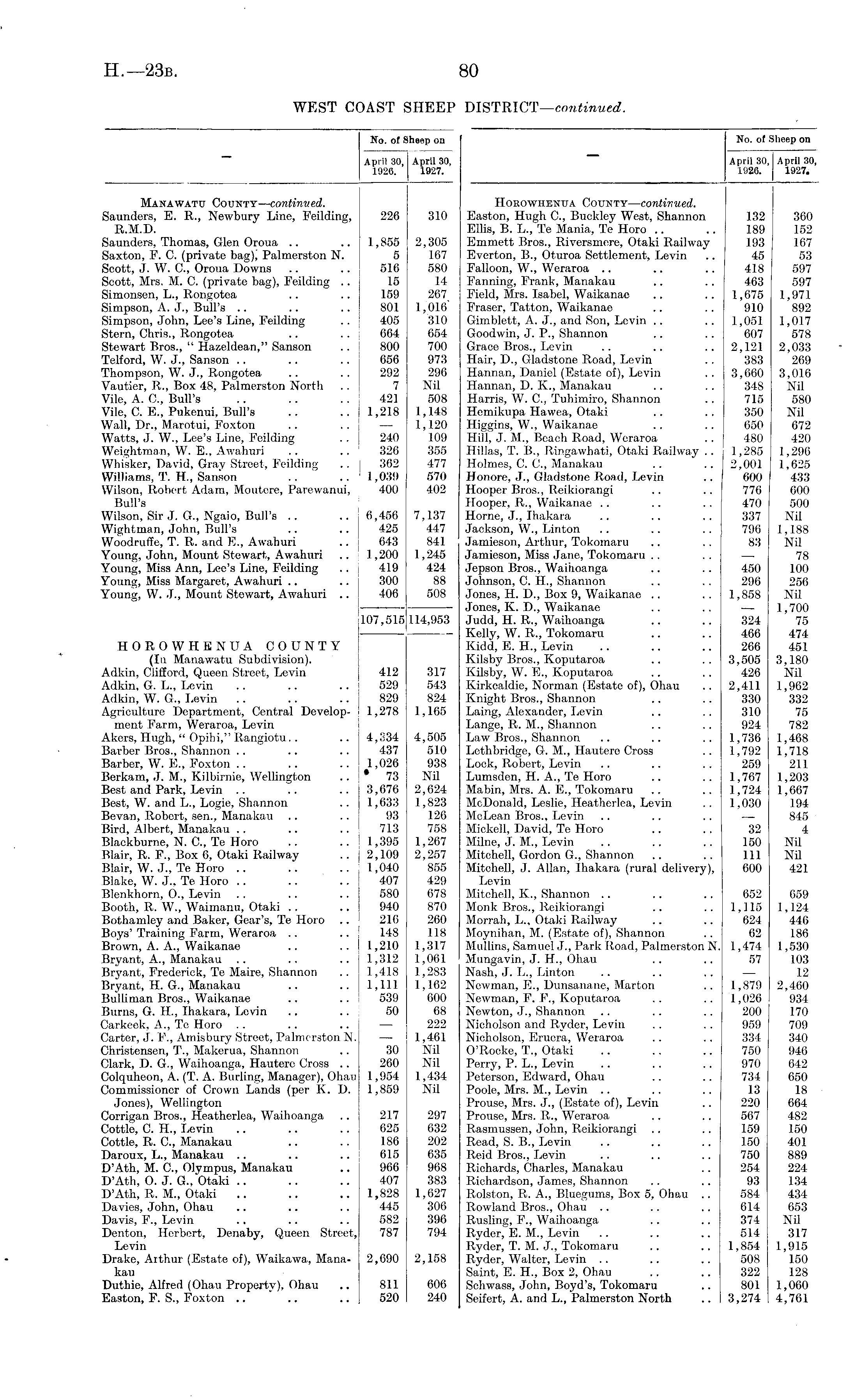 No. of Sheep on April 30, April 30, 1926. 1927. Horowhenua County—continued. Easton, Hugh C., Buckley West, Shannon 132 360 Ellis, B. L., Te Mania, Te Horo .. .. 189 152 Emmett Bros., Riversmere, Otaki Railway 193 167 Everton, B., Oturoa Settlement, Levin .. 45 53 Falloon, W., Weraroa .. .. .. 418 597 Fanning, Frank, Manakau .. .. 463 597 Field, Mrs. Isabel, Waikanae .. .. 1,675 1,971 Fraser, Tatton, Waikanae .. .. 910 892 Gimblett, A. J., and Son, Levin .. .. 1,051 1,017 Goodwin, J. P., Shannon .. .. 607 578 Grace Bros., Levin .. .. .. 2,121 2,033 Hair, D., Gladstone Road, Levin .. 383 269 Hannan, Daniel (Estate of), Levin .. 3,660 3,016 Hannan, D. K., Manakau .. .. 348 Nil Harris, W. C., Tuhimiro, Shannon .. 715 580 Hemikupa Hawea, Otaki .. .. 350 Nil Higgins, W., Waikanae .. .. 650 672 Hill, J. M., Beach Road, Weraroa .. 480 420 Hillas, T. B., Ringawhati, Otaki Railway .. i 1,285 1,296 Holmes, C. C., Manakau .. .. 2,001 1,625 Honore, J., Gladstone Road, Levin .. 600 433 Hooper Bros., Reikiorangi .. .. 776 600 Hooper, R., Waikanae .. .. .. 470 500 Horne, J., Ihakara .. .. .. 337 Nil Jackson, W., Linton .. .. .. 796 1,188 Jamieson, Arthur, Tokomaru .. .. 83 Nil Jamieson, Miss Jane, Tokomaru .. .. — 78 Jepson Bros., Waihoanga .. .. 450 100 Johnson, C. H., Shannon .. .. 296 256 Jones, H. D., Box 9, Waikanae .. .. 1,858 Nil Jones, K. D., Waikanae .. .. — 1,700 Judd, H. R., Waihoanga .. .. 324 75 Kelly, W. R., Tokomaru .. .. 466 474 Kidd, E. H., Levin .. .. .. 266 451 Kilsby Bros., Koputaroa .. . . 3,505 3,180 Kilsby, W. E., Koputaroa .. .. 426 Nil Kirkcaldie, Norman (Estate of), Ohau .. 2,411 1,962 Knight Bros., Shannon .. .. 330 332 Laing, Alexander, Levin .. .. 310 75 Lange, R. M., Shannon .. .. 924 782 Law Bros., Shannon .. .. .. 1,736 1,468 Lethbridge, G. M., Hautere Cross . . 1,792 1,718 Lock, Robert, Levin .. .. .. 259 211 Lumsden, H. A., Te Horo .. .. 1,767 1,203 Mabin, Mrs. A. E., Tokomaru .. .. 1,724 1,667 McDonald, Leslie, Heatherlea, Levin .. 1,030 194 McLean Bros., Levin .. .. .. — 845 Mickell, David, Te Horo .. .. 32 4 Milne, J. M., Levin .. .. .. 150 Nil Mitchell, Gordon G., Shannon .. .. Ill Nil Mitchell, J. Allan, Ihakara (rural delivery), 600 421 Levin Mitchell, K., Shannon .. .. .. 652 659 Monk Bros., Reikiorangi .. .. 1,115 1,124 Morrah, L., Otaki Railway .. .. 624 446 Moynihan, M. (Estate of), Shannon .. 62 186 Mullins, Samuel J., Park Road, Palmerston N. 1,474 1,530 Mungavin, J. H., Ohau .. .. 57 103 Nash, J. L., Linton .. .. .. — 12 Newman, E., Dunsanane, Marton .. 1,879 2,460 Newman, F. F., Koputaroa .. .. 1,026 934 Newton, J., Shannon .. .. .. 200 170 Nicholson and Ryder, Levin .. .. 959 709 Nicholson, Eruera, Weraroa .. .. 334 340 O'Rocke, T., Otaki .. .. .. 750 946 Perry, P. L., Levin .. .. .. 970 642 Peterson, Edward, Ohau .. .. 734 650 Poole, Mrs. M., Levin .. .. .. 13 18 Prouse, Mrs. J., (Estate of), Levin .. 220 664 Prouse, Mrs. R., Weraroa .. .. 567 482 Rasmussen, John, Reikiorangi .. .. 159 150 Read, S. B., Levin .. .. .. 150 401 Reid Bros.. Levin .. .. .. 750 889 Richards, Charles, Manakau .. 254 224 Richardson, James, Shannon .. .. 93 134 Rolston, R. A., Bluegums, Box 5, Ohau .. 584 434 Rowland Bros., Ohau .. .. .. 614 653 Rusling, F., Waihoanga .. .. 374 Nil Ryder, E. M., Levin .. .. .. 514 317 Ryder, T. M. J., Tokomaru .. .. 1,854 1,915 Ryder, Walter, Levin .. .. .. 508 150 Saint, E. H., Box 2, Ohau .. .. 322 128 Schwass, John, Boyd's, Tokomaru .. 801 1,060 Seifert, A. and L., Palmerston North .. 3,274 4,761