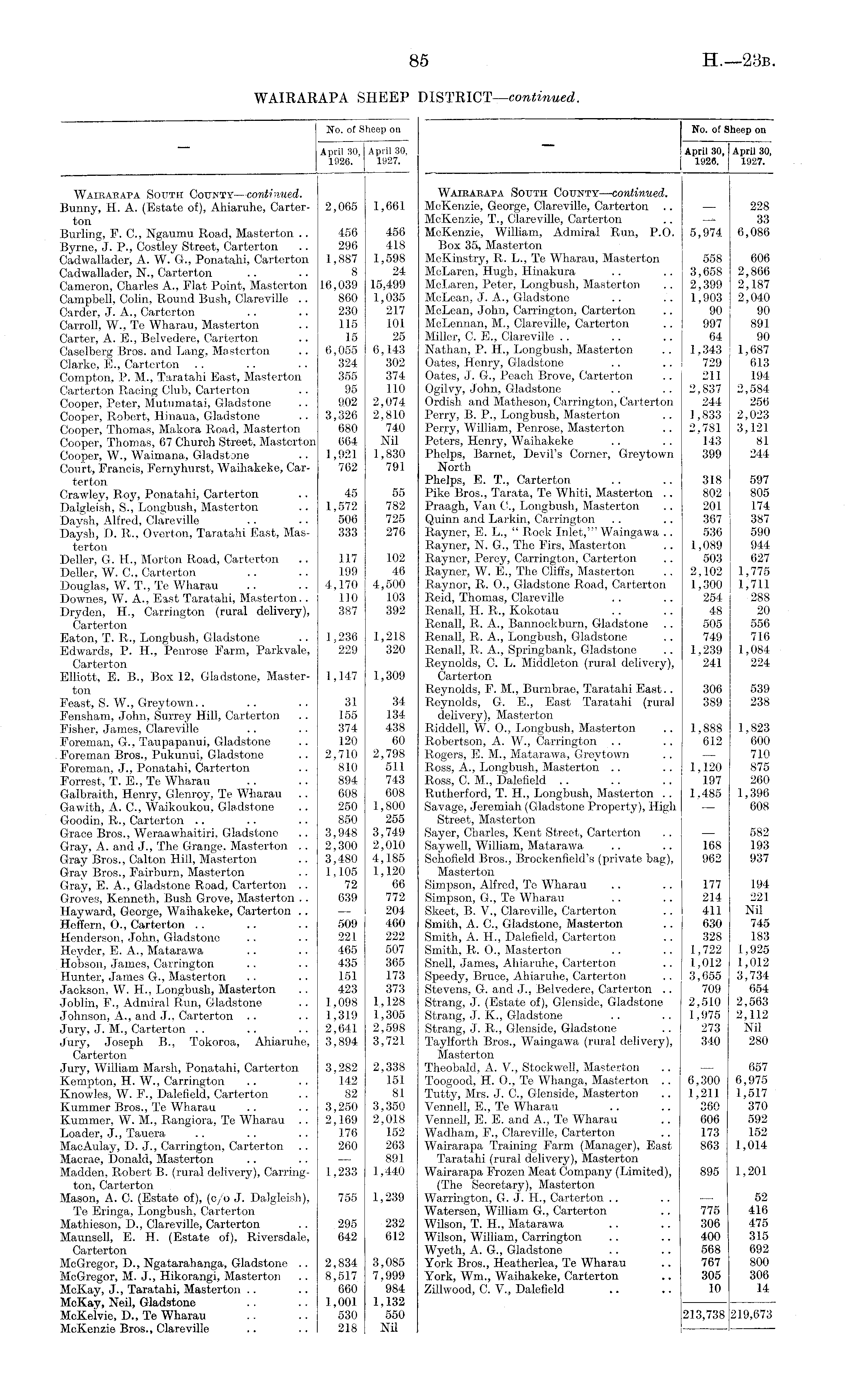 No. of Sheep on April 30, April 30, 1926. 1927. Wairabapa South County—continued. Bunny, H. A. (Estate of), Ahiaruhe, Carter- 2,065 1,661 ton Burling, F. C., Ngaumu Road, Masterton .. 456 456 Byrne, J. P., Costley Street, Carterton .. 296 418 Cadwallader, A. W. G., Ponatahi, Carterton 1,887 1,598 Cadwallader, N., Carterton .. .. 8 24 Cameron, Charles A., Flat Point, Masterton 16,039 15,499 Campbell, Colin, Round Bush, Clareville .. 860 1,035 Carder, J. A., Carterton .. .. 230 217 Carroll, W., Te Wharau, Masterton .. 115 101 Carter, A. E., Belvedere, Carterton .. 15 25 Caselberg Bros, and Lang, Masterton .. 6,055 6,143 Clarke, E., Carterton .. .. .. 324 302 Compton, P. M., Taratahi East, Masterton 355 374 Carterton Racing Club, Carterton .. 95 110 Cooper, Peter, Mutumatai, Gladstone .. 902 2,074 Cooper, Robert, Hinaua, Gladstone .. 3,326 2,810 Cooper, Thomas, Makora Road, Masterton 680 740 Cooper, Thomas, 67 Church Street, Masterton 664 Nil Cooper, W., Waimana, Gladstone .. 1,921 1,830 Court, Francis, Fernyhurst, Waihakeke, Car- 762 791 terton Crawley, Roy, Ponatahi, Carterton .. 45 55 Dalgleish, S., Longbush, Masterton .. 1,572 782 Daysh, Alfred, Clareville .. ■ ■ 506 725 Daysh, D. R., Overton, Taratahi East, Mas- 333 276 terton Deller, G. H., Morton Road, Carterton .. 117 102 Deller, W. C., Carterton .. .. 199 46 Douglas, W. T., Te Wharau .. .. 4,170 4,500 Downes, W. A., East Taratahi, Masterton.. 110 103 Dryden, H., Carrington (rural delivery), 387 392 Carterton Eaton, T. R., Longbush, Gladstone .. 1,236 1,218 Edwards, P. H., Penrose Farm, Parkvale, 229 320 Carterton Elliott, E. B., Box 12, Gladstone, Master- 1,147 1,309 ton Feast, S. W., Grey town.. .. .. 31 34 Fensham, John, Surrey Hill, Carterton .. 155 134 Fisher, JameB, Clareville .. .. 374 438 Foreman, G., Taupapanui, Gladstone .. 120 60 Foreman Bros., Pukunui, Gladstone .. 2,710 2,798 Foreman, J., Ponatahi, Carterton .. 810 511 Forrest, T. E., Te Wharau . . .. 894 743 Galbraith, Henry, Glenroy, Te Wharau .. 608 608 Gawith, A. C., Waikoukou, Gladstone .. 250 1,800 Goodin, R., Carterton .. .. .. 850 255 Grace Bros., Weraawhaitiri, Gladstone .. 3,948 3,749 Gray, A. and J., The Grange, Masterton .. 2,300 2,010 Gray Bros., Calton Hill, Masterton .. 3,480 4,185 Gray Bros., Fairburn, Masterton .. 1,105 1,120 Gray, E. A., Gladstone Road, Carterton .. 72 66 Groves, Kenneth, Bush Grove, Masterton .. 639 772 Hayward, George, Waihakeke, Carterton .. — 204 Heffern, O., Carterton .. .. .. 509 460 Henderson, John, Gladstone .. .. 221 222 Heyder, E. A., Matarawa .. .. 465 507 Hobson, James, Carrington .. .. 435 365 Hunter, James G., Masterton .. .. 151 173 Jackson, W. H., Longbush, Masterton .. 423 373 Joblin, F., Admiral Run, Gladstone .. 1,098 1,128 Johnson, A., and J., Carterton .. .. 1,319 1,305 Jury, J. M., Carterton .. .. .. 2,641 2,598 Jury, Joseph B., Tokoroa, Ahiaruhe, 3,894 3,721 Carterton Jury, William Marsh, Ponatahi, Carterton 3,282 2,338 Kempton, H. W., Carrington .. .. 142 151 Knowles, W. F., Dalefield, Carterton .. 82 81 Kummer Bros., Te Wharau .. .. 3,250 3,350 Kummer, W. M., Rangiora, Te Wharau .. 2,169 2,018 Loader, J., Tauera .. .. . . 176 152 MacAulay, D. J., Carrington, Carterton .. 260 263 Macrae, Donald, Masterton .. .. — 891 Madden, Robert B. (rural delivery), Carring- 1,233 1,440 ton, Carterton Mason, A. C. (Estate of), (c/o J. Dalgleish), 755 1,239 Te Eringa, Longbush, Carterton Mathieson, D., Clareville, Carterton . . 295 232 Maunsell, E. H. (Estate of), Riversdale, 642 612 Carterton McGregor, D., Ngatarahanga, Gladstone .. 2,834 3,085 McGregor, M. J., Hikorangi, Masterton .. 8,517 7,999 McKay, J., Taratahi, Masterton .. .. 660 984 McKay, Neil, Gladstone .. .. 1,001 1,132 McKelvie, D., Te Wharau .. .. 530 550 McKenzie Bros., Clareville .. .. 218 Nil