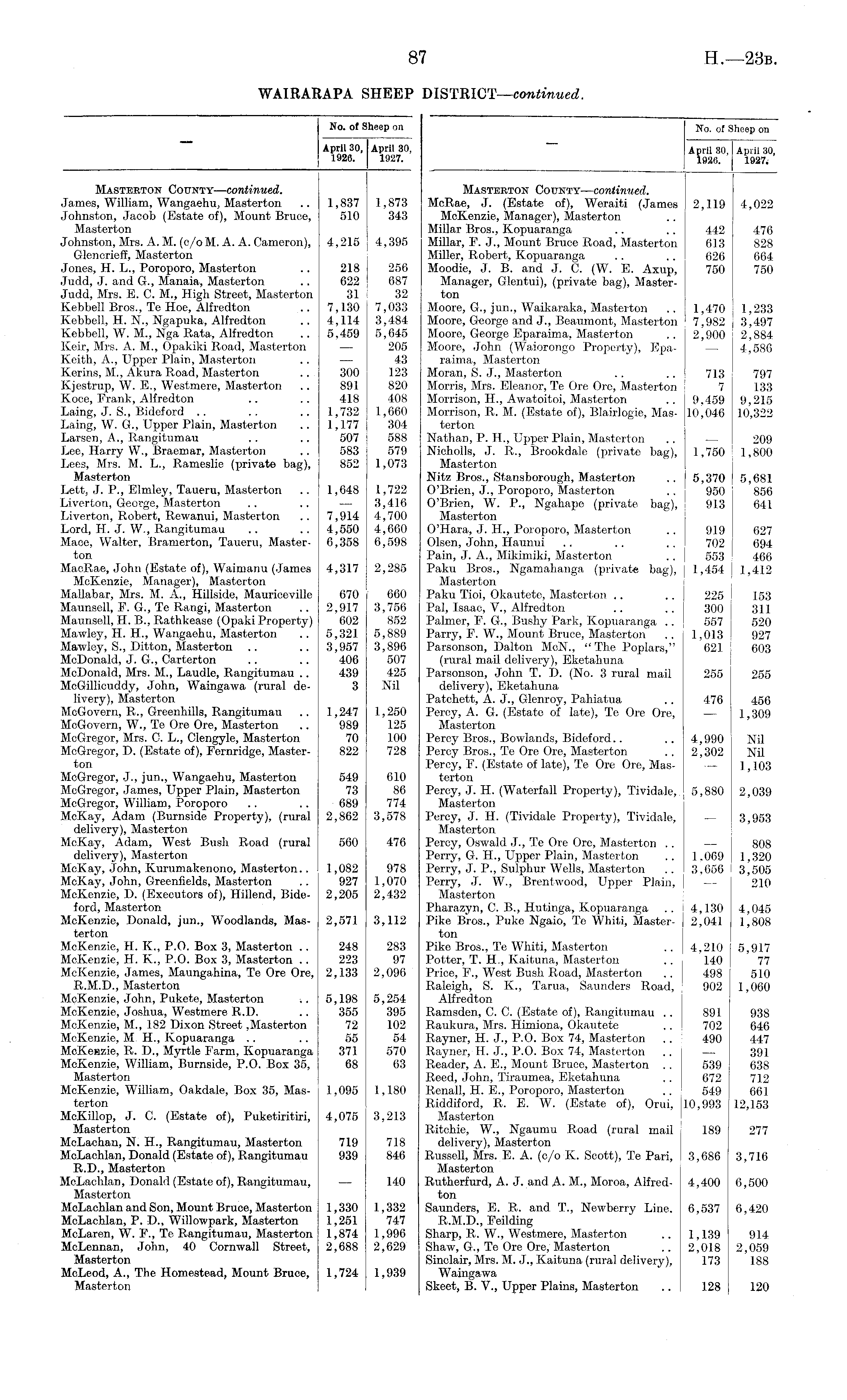 No. of Sheep on April 30, April 30, 1926. 1927; Mastekton County—continued. McRae, J. (Estate of), Weraiti (James 2,119 4,022 McKenzie, Manager), Masterton Millar Bros., Kopuaranga .. .. 442 476 Millar, P. J., Mount Brace Road, Masterton 613 828 Miller, Robert, Kopuaranga .. .. 626 664 Moodie, J. B. and J. C. (W. E. Axup, 750 750 Manager, Glentui), (private bag), Masterton Moore, G., jun., Waikaraka, Masterton .. 1,470 1,233 Moore, George and J., Beaumont, Masterton 7,982 3,497 Moore, George Eparaima, Masterton .. 2,900 2,884 Moore, John (Waiorongo Property), Epa- — 4,586 raima, Masterton Moran, S. J., Masterton .. .. 713 797 Morris, Mrs. Eleanor, Te Ore Ore, Masterton 7 133 Morrison, H., Awatoitoi, Masterton .. 9,459 9,215 Morrison, R. M. (Estate of), Blairlogie, Mas- 10,046 10,322 terton Nathan, P. H., Upper Plain, Masterton .. — 209 Nicholls, J. R., Brookdale (private bag), 1,750 1,800 Masterton Nitz Bros., Stansborough, Masterton .. 5,370 5,681 O'Brien, J., Poroporo, Masterton .. 950 856 O'Brien, W. P., Ngahape (private bag), 913 641 Masterton O'Hara, J. H., Poroporo, Masterton .. 919 627 Olsen, John, Haunui .. .. .. 702 694 Pain, J. A., Mikimiki, Masterton .. 553 466 Paku Bros., Ngamahanga (private bag), 1,454 1,412 Masterton Paku Tioi, Okautete, Masterton .. .. 225 153 Pal, Isaac, V., Alfredton .. .. 300 311 Palmer, P. G., Bushy Park, Kopuaranga .. 557 520 Parry, P. W., Mount Brace, Masterton .. 1,013 927 Parsonson, Dalton McN., " The Poplars," 621 603 (rural mail delivery), Eketahuna Parsonson, John T. D. (No. 3 rural mail 255 255 delivery), Eketahuna Patchett, A. J., Glenroy, Pahiatua .. 476 456 Percy, A. G. (Estate of late), Te Ore Ore, — 1,309 Masterton Percy Bros., Bowlands, Bideford.. .. 4,990 Nil Percy Bros., Te Ore Ore, Masterton .. 2,302 Nil Percy, P. (Estate of late), Te Ore Ore, Mas- — 1,103 terton Percy, J. H. (Waterfall Property), Tividale, 5,880 2,039 Masterton Percy, J. H. (Tividale Property), Tividale, — 3,953 Masterton Percy, Oswald J., Te Ore Ore, Masterton .. — 808 Perry, G. H., Upper Plain, Masterton .. 1,069 1,320 Perry, J. P., Sulphur Wells, Masterton .. 3,656 3,505 Perry, J. W., Brentwood, Upper Plain, : — 210 Masterton Pharazyn, C. B., Hutinga, Kopuaranga .. 4,130 4,045 Pike Bros., Puke Ngaio, Te Whiti, Master- 2,041 1,808 ton Pike Bros., Te Whiti, Masterton .. 4,210 5,917 Potter, T. H., Kaituna, Masterton .. 140 77 Price, F., West Bush Road, Masterton .. 498 510 Raleigh, S. K., Tarua, Saunders Road, 902 1,060 Alfredton Ramsden, C. C. (Estate of), Rangitumau .. 891 938 Raukura, Mrs. Himiona, Okautete .. 702 646 Rayner, H. J., P.O. Box 74, Masterton .. 490 447 Rayner, H. J., P.O. Box 74, Masterton .. —■ 391 Reader, A. E., Mount Bruce, Masterton .. 539 638 Reed, John, Tiraumea, Eketahuna .. 672 712 Renall, H. E., Poroporo, Masterton .. 1 549 661 Riddiford, R. E. W. (Estate of), Orui, 110,993 12,153 Masterton Ritchie, W., Ngaumu Road (rural mail 189 277 delivery), Masterton Russell, Mrs. E. A. (c/o K. Scott), Te Pari, 3,686 3,716 Masterton Rutherfurd, A. J. and A- M., Moroa, Alfred- 4,400 6,500 ton Saunders, E. R. and T., Newberry Line, 6,537 6,420 R.M.D., Feilding Sharp, R. W., Westmere, Masterton .. 1,139 914 Shaw, G., Te Ore Ore, Masterton .. 2,018 2,059 Sinclair, Mrs. M. J., Kaituna (rural delivery), 173 188 Waingawa Skeet, B. V., Upper Plains, Masterton .. 128 120