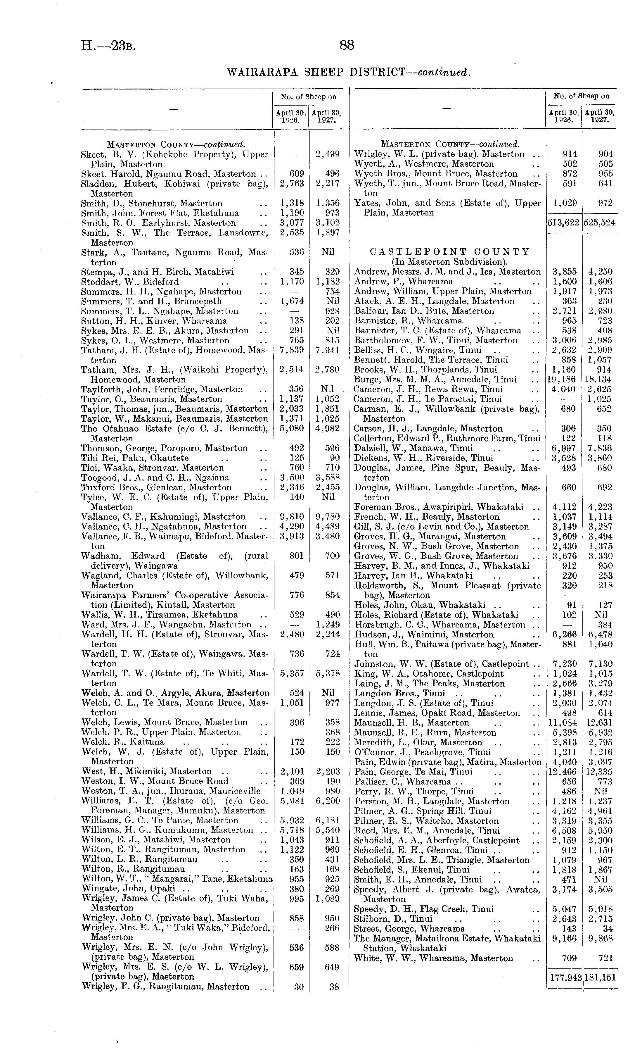No. of Sheep on April 80, April 30, 1926. 1927. Mastertoh County—continued. Wrigley, W. L. (private bag), Masterton .. 914 904 Wyeth, A., Westmere, Masterton .. 502 505 Wyeth Bros., Mount Bruce, Masterton .. 872 955 Wyeth, T., jun., Mount Bruce Road, Master- 591 641 ton Yates, John, and Sons (Estate of), Upper 1,029 972 Plain, Masterton 513,622 525,524 CASTLEPOINT COUNTY (In Masterton Subdivision). Andrew, Messrs. J. M. and J., Ica, Masterton 3,855 4,250 Andrew, P., Whareama .. .. 1,600 1,606 Andrew, William, Upper Plain, Masterton 1,917 1,973 Ataek, A. E. H., Langdale, Masterton .. 363 230 Balfour, Ian I)., Bute, Masterton .. 2,721 2,980 | Bannister, R., Whareama .. .. 965 723 j Bannister, T. C. (Estate of), Whareama .. 538 408 J Bartholomew, F. W., Tinui, Masterton .. 3,006 2,985 [ Belliss, H. C., Wingaire, Tinui .. .. 2,632 2,909 j Bennett, Harold, The Terrace, Tinui .. 858 1,057 i Brooks, W. H., Thorplands, Tinui .. 1,160 914 Burge, Mrs. M. M. A., Annedale, Tinui .. 19,186 18,134 Cameron, J. H., Rewa Rewa, Tinui .. 4,040 2,625 Cameron, J. H., le Paraetai, Tinui .. — 1,025 Carman, E. J., Willowbank (private bag), 680 652 Masterton Carson, H. J., Langdale, Masterton .. I 306 350 Collerton, Edward P., Rathmore Farm, Tinui | 122 118 Dalziell, W., Manawa, Tinui .. .. 6,997 7,836 Dickens, W. H., Riverside, Tinui .. 3,528 3,860 Douglas, James, Pine Spur, Beauly, Mas- 493 680 terton Douglas, William, Langdale Junction, Mas- 660 692 terton Foreman Bros., Awapiripiri, Whakataki .. 4,112 4,223 French, W. H., Beauly, Masterton .. 1,037 1,114 Gill, S. J. (c/o Levin and Co.), Masterton 3,149 3,287 Groves, H. G., Marangai, Masterton .. 3,609 3,494 Groves, N. W., Bush Grove, Masterton .. 2,430 1,375 Groves, W. G., Bush Grove, Masterton .. 3,676 3,330 Harvey, B. M., and Innes, J., Whakataki 912 950 Harvey, Ian H., Whakataki .. .. 220 253 Holdsworth, S., Mount Pleasant (private 320 218 bag), Masterton Holes, John, Okau, Whakataki .. .. 91 127 Holes, Richard (Estate of), Whakataki .. 102 Nil Horsbrugh, C. C., Whareama, Masterton .. — 384 Hudson, J., Waimimi, Masterton .. 6,266 6,478 Hull, Wm. B., Paitawa (private bag), Master- 881 1,040 ton Johnston, W. W. (Estate of), Castlepoint .. 7,230 7,130 King, W. A., Otahome, Castlepoint .. ! 1,024 1,015 Laing, J. M., The Peaks, Masterton .. I 2,666 3,279 Langdon Bros., Tinui .. .. .. 1,381 1,432 Langdon, J. S. (Estate of), Tinui .. 2,030 2,074 Lennie, James, Opaki Road, Masterton .. 498 614 Maunsell, H. B., Masterton .. .. 11,084 12,631 Maunsell, R. E., Ruru, Masterton .. 5,398 5,932 Meredith, L., Okar, Masterton .. .. 2,813 2,795 O'Connor, J., Peachgrove, Tinui .. 1,211 1,216 Pain, Edwin (private bag), Matira, Masterton 4,040 3,097 Pain, George, Te Mai, Tinui .. .. 12,466 12,335 Palliser, C., Whareama .. .. .. 656 773 Perry, R. W., Thorpe, Tinui .. .. 486 Nil Perston, M. H., Langdale, Masterton .. 1,218 1,237 Pilmer, A. G„ Spring Hill, Tinui .. 4,162 4,961 Pilmer, R. S., Waiteko, Masterton .. 3,319 3,355 Reed, Mrs. E. M., Annedale, Tinui .. 6,508 5,950 Schofield, A. A., Aberfoyle, Castlepoint .. 2,159 2,300 Schofield, E. H., Glenroa, Tinui .. .. 912 1,150 Schofield, Mrs. L. E., Triangle, Masterton 1,079 967 Schofield, S., Ekenui, Tinui .. .. 1,818 1,867 Smith, E. H., Annedale, Tinui .. .. 471 Nil Speedy, Albert J. (private bag), Awatea, 3,174 3,505 lilcistcrton Speedy, D. H., Flag Creek, Tinui .. 5,047 5,918 Stilborn, D., Tinui .. .. .. 2,643 2,715 Street, George, Whareama .. .. 143 34 The Manager, MataikonaEstate, Whakataki 9,166 9,868 Station, Whakataki White, W. W., Whareama, Masterton .. 709 721 177,943181,151