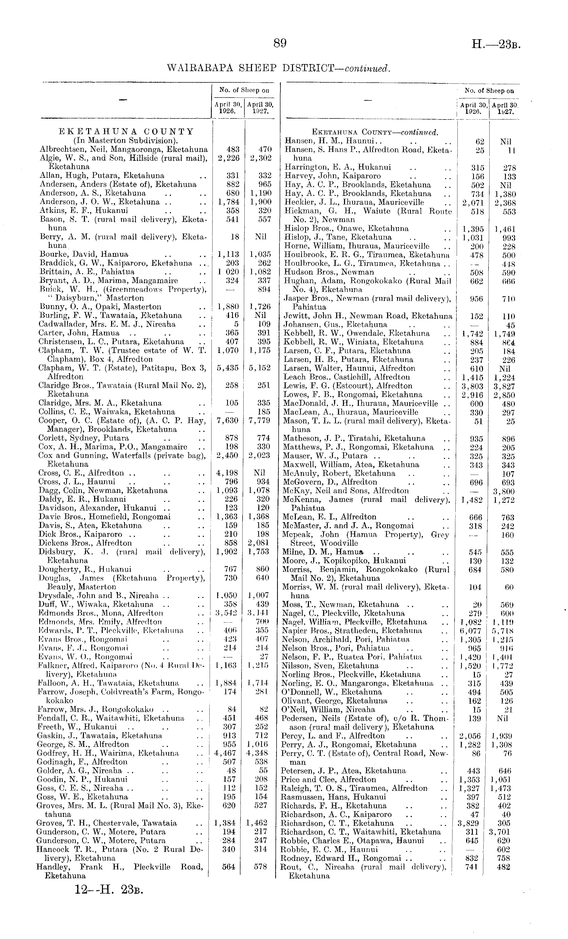 No. of Sheep on April 30, April 30. 1926. 1927. Eketahtofa County—continued. Hansen, H. M., Haunui.. .. .. 62 Nil Hansen, S. Hans P., Alfredton Road, Eketa- 25 1 I huna Harrington, E. A., Hukanui . . . . I 315 278 Harvey, John, Kaiparoro .. . . 156 133 Hay, A. C. P., Brooklands, Eketahuna .. 502 Nil Hay, A. C. P., Brooklands, Eketahuna .. 734 1,380 Heckler, J. L., Ihuraua, Mauriceville .. 2,071 2,368 Hickman, G. H., Waiute (Rural Route 518 553 No. 2), Newman Hislop Bros., Onawe, Eketahuna .. 1,395 1,461 Hislop, J., Tane, Eketahuna .. .. 1,031 993 Home, William, Ihuraua, Mauriceville .. 200 228 Houlbrook, E. R. G., Tiraumea, Eketahuna 478 500 Houlbrooke, L. G., Tiraumea, Eketahuna .. j — 448 Hudson Bros., Newman .. .. 508 590 Hughan, Adam, Rongokokako (Rural Mail 662 666 No. 4), Eketahuna Jasper Bros., Newman (rural mail delivery), 956 710 Pahiatua Jewitt, John H., Newman Road, Eketahuna 152 110 Johansen, Gus., Eketahuna . . .. — 45 Kebbell, R. W., Owendale, Eketahuna .. 1,742 1,749 Kebbell, R. W., Winiata, Eketahuna .. 884 864 Larsen, C. F., Putara, Eketahuna .. 205 184 Larsen, H. B., Putara, Eketahuna .. 237 226 Larsen, Walter, Haunui, Alfredton .. 610 Nil Leach Bros., Castlehill, Alfredton .. 1,415 1,224 Lewis, F. G. (Estcourt), Alfredton .. 3,803 3,827 Lowes, F. B., Rongomai, Eketahuna .. 2,916 2,850 MacDonald, J. H., Ihuraua, Mauriceville .. 600 480 MacLean, A., Ihuraua, Mauriceville . . 330 297 Mason, T. L. L. (rural mail delivery), Eketa- 51 25 huna Matheson, J. P., Tiratahi, Eketahuna .. 935 896 Matthews, P. J., Rongomai, Eketahuna .. 224 205 Mauser, W. J., Putara .. .. .. 325 325 Maxwell, William, Atea, Eketahuna .. 343 343 McAnuly, Robert, Eketahuna .. .. — 107 McGovern, D., Alfredton .. .. 696 693 McKay, Neil and Sons, Alfredton .. — 3,800 McKenna, James (rural mail delivery), 1,482 1,272 Pahiatua McLean, E. I., Alfredton .. .. 666 763 McMaster, J. and J. A., Rongomai .. 318 242 Mcpeak, John (Hamua Property), Grey — 160 Street, Woodville Milne, D. M., Hamua .. .. .. 545 555 Moore, J., Kopikopiko, Hukanui .. 130 132 Morriss, Benjamin, Rongokokako (Rural 684 580 Mail No. 2), Eketahuna Morris?, W. M. (rural mail delivery), Eketa- 104 60 huna Moss, T., Newman, Eketahuna .. .. 20 569 Nagel, C., Pleckville, Eketahuna .. 279 600 Nagel, William, Pleckville, Eketahuna .. 1,082 1,119 Napier Bros., Stratheden, Eketahuna .. 6,077 5,718 Nelson, Archibald. Pori, Pahiatua .. 1 1,305 : 1,215 Nelson Bros., Pori, Pahiatua .. .. j 965 I 916 Nelson, F. P., Ruatea Pori, Pahiatua .. 1,420 1,401 Nilsson, Sven, Eketahuna .. .. 1,520 1,772 Norling Bros., Pleckville, Eketahuna .. 15 27 Norling, E. O., Mangaronga, Eketahuna .. 315 439 O'Donnell, W., Eketahuna .. .. 494 505 Olivant, George, Eketahuna .. .. 162 126 O'Neil, William, Nireaha .. .. 15 21 Pedersen, Neils (Estate of), e/o R. Thom- 139 Nil ason (rural mail delivery), Eketahuna Percy, L. and F., Alfredton .. .. 2,056 1,939 Perry, A. J., Rongomai, Eketahuna .. 1,282 1,308 Perry, C. T. (Estate of), Central Road, New- 86 76 man Petersen, J. P., Atea, Eketahuna .. 443 646 Price and Clee, Alfredton .. .. 1,353 1,051 Raleigh, T. O. S., Tiraumea, Alfredton .. 1,327 1,473 Rasmussen, Hans, Hukanui .. 397 512 Richards, F. H., Eketahuna .. .. 382 402 Richardson, A. C., Kaiparoro .. .. 47 40 Richardson, C. T., Eketahuna .. .. 3,829 305 Richardson, C. T., Waitawhiti, Eketahuna 311 3,701 Robbie, Charles E., Otapawa, Haunui .. 645 620 Robbie, E. C. M., Haunui .. .. — | 602 Rodney, Edward H., Rongomai .. .. 832 J 758 Rout, C., Nireaha (rural mail delivery), ' 741 j 482 Eketahuna