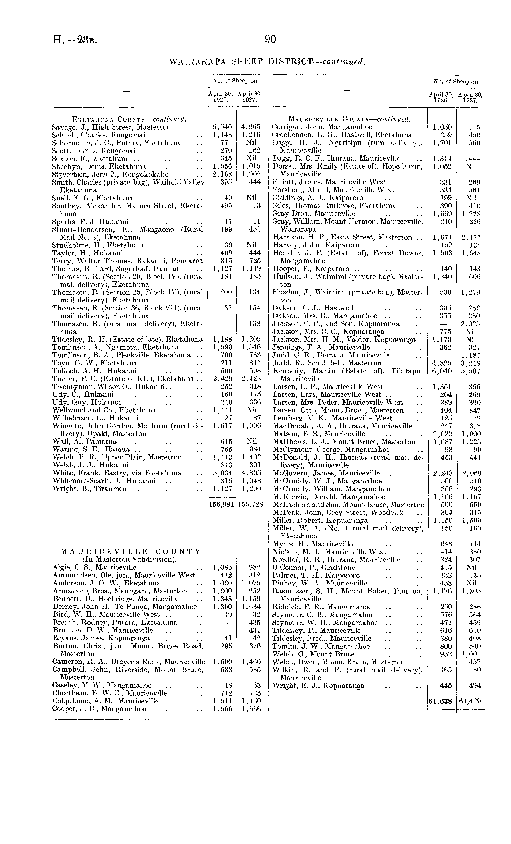 No. of Sheep on April 30,1 April 30, ; 1926. 1927. Maubioeyili b County—continued. Corrigan, John, Mangamahoe .. .. 1,050 1,145 Crookenden, E. H., Hastwell, Eketahuna .. 259 450 Dagg, H. J., Ngatitipu (rural delivery), 1,701 1,560 Mauriceville I Dagg, R. C. E., Ihuraua, Mauriceville .. 1,314 1,444 | Dorset, Mrs. Emily (Estate of), Hope Farm, 1,052 Nil ■ Mauriceville I Elliott, James, Mauriceville West .. 331 269 Forsberg, Alfred, Mauriceville West .. 534 561 Giddings, A. J., Kaiparoro .. .. 199 Nil Giles, Thomas Ruthrose, Eketahuna .. 390 410 Gray Bros., Mauriceville .. .. 1,669 1,728 Gray, William, Mount Hermon, Mauriceville, 210 226 Wairarapa Harrison, H. P., Essex Street-, Masterton .. 1,671 2,177 Harvey, John, Kaiparoro .. .. 152 132 Heckler, J. P. (Estate of), Eorest Downs, 1,593 1,648 Mangamahoe Hooper, F., Kaiparoro .. .. .. 140 143 Hudson, J., Waimimi (private bag), Master- 1,340 606 ton Husdon, J., Waimimi (private bag), Master- 539 1,279 ton Isakson, C. J., Hastwell .. .. 305 282 Isakson, Mrs. B., Mangamahoe .. .. 355 280 Jackson, C. C., and Son, Kopuaranga .. — 2,025 Jackson, Mrs. C. C., Kopuaranga .. 775 Nil Jackson, Mrs. H. M., Valdor, Kopuaranga 1,170 Nil Jennings, T. A., Mauriceville . . .. 362 327 Judd, C. R., Ihuraua, Mauriceville .. — 1,187 Judd, R., South belt, Masterton .. .. 4,825 3,248 Kennedy, Martin (Estate of), Tikitapu, 6,040 5,507 Mauriceville Larsen, L. P., Mauriceville West .. 1,351 1,356 Larsen, Lars, Mauriceville West .. .. 264 269 Larsen, Mrs. Peder, Mauriceville West .. 389 390 Larsen, Otto, Mount Bruce, Masterton .. 404 847 Lemberg, V. K, Mauriceville West . . 125 179 MacDonald, A. A., Ihuraua, Mauriceville .. 247 312 Matson, E. S., Mauriceville .. .. 2,022 1,900 Matthews, L. J., Mount Bruce, Masterton 1,087 1,225 McClymont, George, Mangamahoe .. 98 90 McDonald, J. H., Ihuraua (rural mail de- 453 441 livery), Mauriceville McGovern, James, Mauriceville .. .. 2,243 2,069 McGruddy, W. J., Mangamahoe .. 500 510 McGruddy, William, Mangamahoe .. 306 293 McKenzie, Donald, Mangamahoe .. 1,106 1,167 MeLachlan and Son, Mount Bruce, Masterton 500 550 McPeak, John, Grey Street, Woodville .. 304 315 Miller, Robert, Kopuaranga .. .. 1,156 1,500 Miller, W. A. (No. 4 rural mail delivery), ! 150 160 Eketahuna Myers, H., Mauriceville .. .. 648 714 Nielsen, M. J., Mauriceville West .. 414 380 Nordlof, R. R., Ihuraua, Mauriceville .. 324 307 O'Connor, P., Gladstone .. .. 415 Nil Palmer, T. H., Kaiparoro .. .. 132 135 Pinhey, W. A., Mauriceville .. .. 458 Nil Rasmussen, S. H., Mount Baker, Ihuraua, 1,176 1,305 Mauriceville Riddick, F. R., Mangamahoe .. .. 250 286 Seymour, C. B., Mangamahoe .. .. 576 564 Seymour, W. H., Mangamahoe .. .. 471 459 Tiidesley, F., Mauriceville .. .. 616 610 Tildesley, Fred., Mauriceville .. .. 380 408 Tomlin, J. W., Mangamahoe .. .. 800 540 Welch, C., Mount Bruce .. .. 952 1,001 Welch, Owen, Mount Bruce, Masterton .. — 457 Wilkin, R. and P. (rural mail delivery), 165 180 Mauriceville Wright, E. J., Kopuaranga .. .. 445 494 61,638 61,429