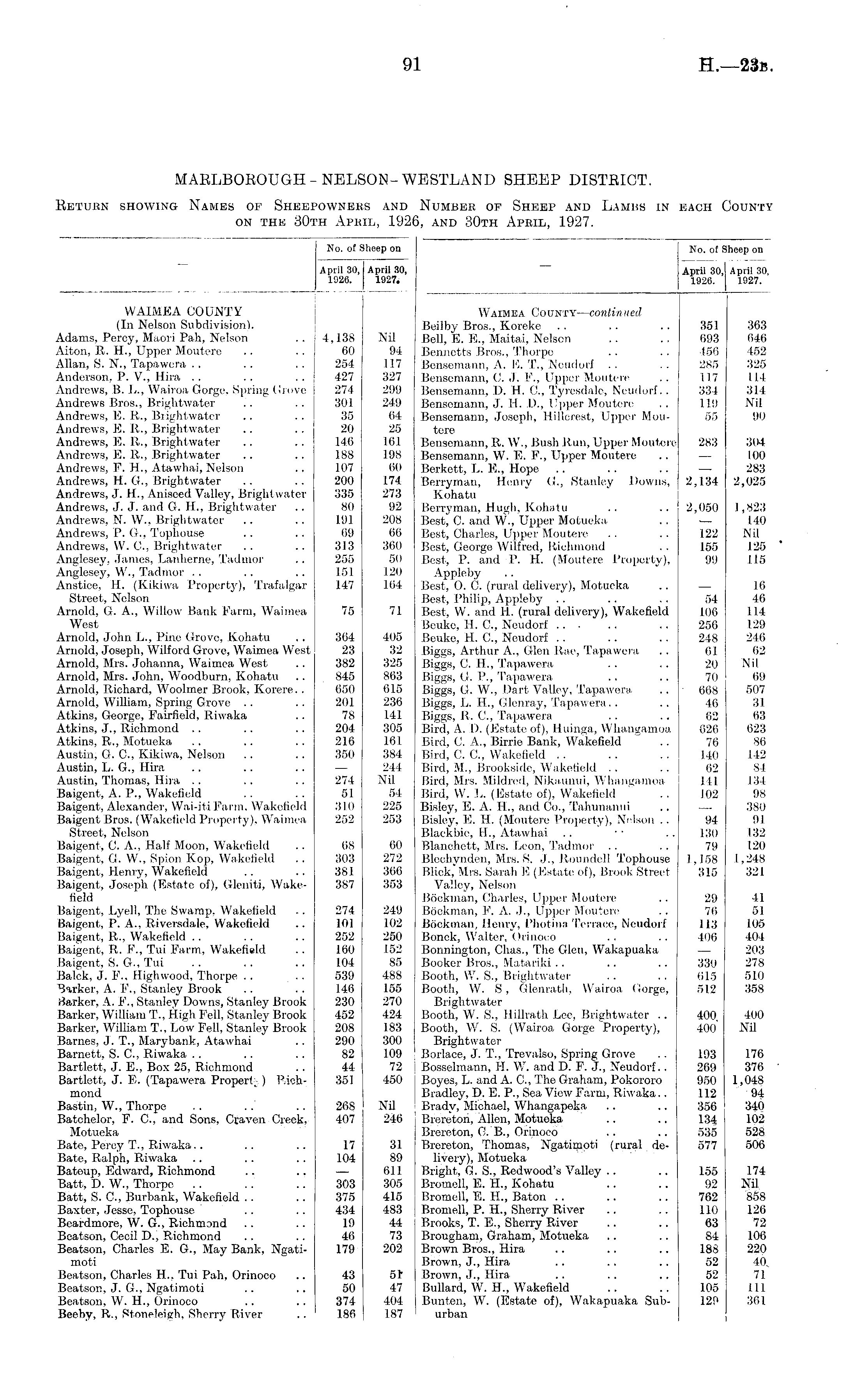 MARLBOROUGH-NELSON-WESTLAND SHEEP DISTRICT. Return showing Names of Sheepowners and Number of Sheep and Lambs in each County on the 30th April, 1926, and 30th April, 1927.
