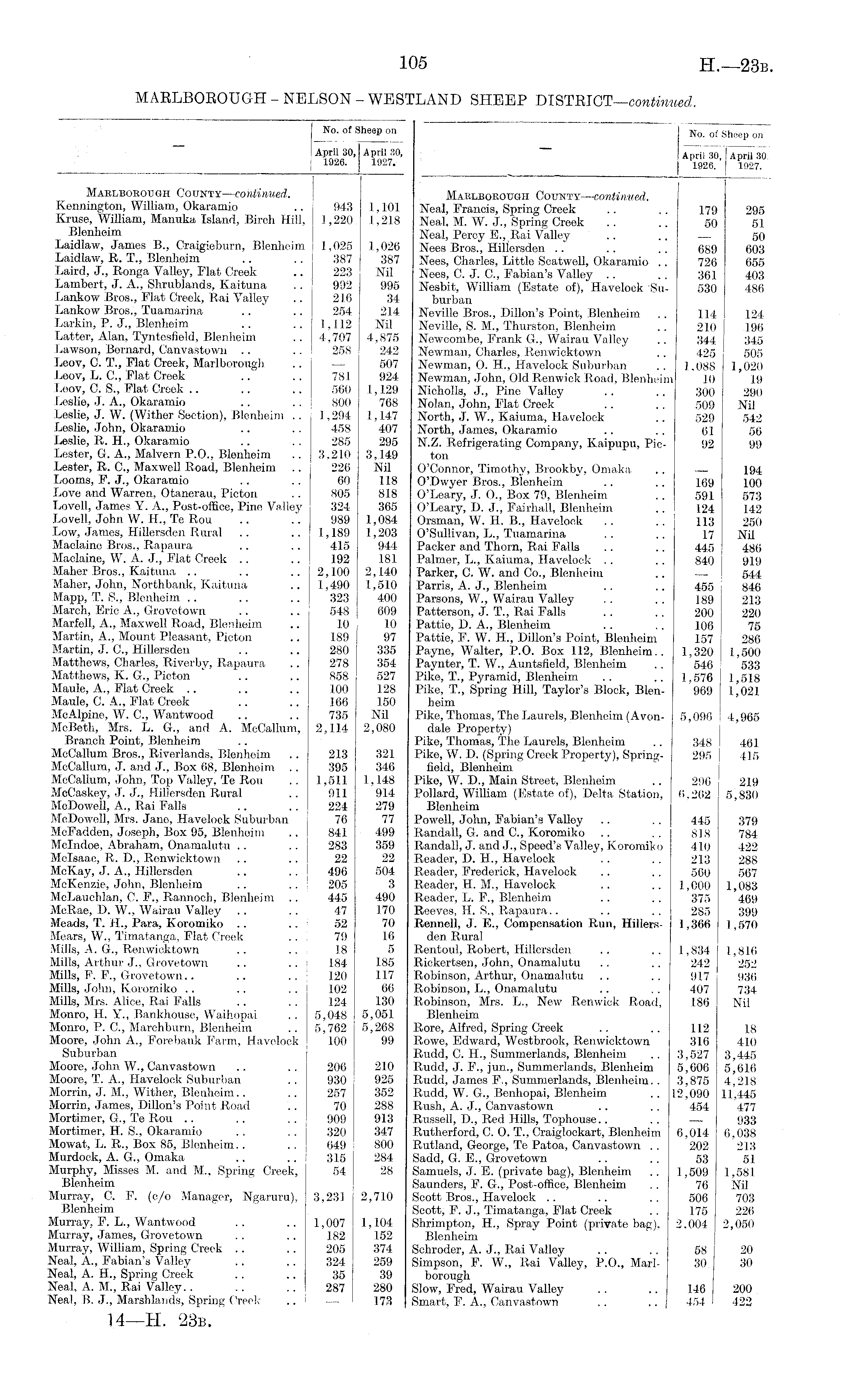 No. of Sheep on April 30, April 30. | 1926. 1027. Marlboeough County—continued. Neal, Francis, Spring Creek .. .. 179 295 Neal, M. W. J., Spring Creek . . .. 50 51 Neal, Percy E., Rai Valley .. .. — 50 Nees Bros., Hillersden .. .. . . 689 603 Nees, Charles, Little Scatwell, Okararaio .. 726 655 Nees, C. J. C., Fabian's Valley .. . . 361 403 Nesbit, William (Estate of), Havelock Su- 530 486 burban Neville Bros., Dillon's Point, Blenheim .. 114 124 Neville, S. M., Thurston, Blenheim .. 210 196 Neweombe, Frank G., Wairau Valley .. 344 345 Newman, Charles, Renwicktown .. 425 505 Newman, 0. EL, Havelock Suburban .. 1,088 1,020 Newman, John, Old Renwick Road, Blenheim 10 19 Nicholls, J., Pine Valley .. .. 300 290 Nolan, John, Flat Creek .. .. 509 Nil North, J. W., Kaiuma, Havelock .. 529 542 North, James, Okaramio .. .. 61 56 N.Z. Refrigerating Company, Kaipupu, Pic- 92 99 ton O'Connor, Timothy, Brookby, Omaka .. — 194 O'Dwyer Bros., Blenheim .. . . 169 100 O'Leary, J. 0., Box 79, Blenheim .. 591 573 O'Leary, D. J., Fairhall, Blenheim .. 124 142 Orsman, W. H. B., Havelock .. . . 113 250 O'Sullivan, L., Tuamarina . . . . 17 Nil Packer and Thorn, Rai Falls . . .. 445 486 Palmer, L., Kaiuma, Havelock .. .. 840 919 Parker, C. W. and Co., Blenheim .. — 544 Parris, A. J., Blenheim .. .. 455 846 Parsons, W., Wairau Valley . . . . 189 213 Patterson, J. T., Rai Falls .. .. 200 220 Pattie, D. A., Blenheim .. .. 106 75 Pattie, F. W. H., Dillon's Point, Blenheim 157 286 Payne, Walter, P.O. Box 112, Blenheim.. 1,320 1,500 Paynter, T. W., Auntsfield, Blenheim .. 546 533 Pike, T., Pyramid, Blenheim .. .. 1,576 1,518 Pike, T., Spring Hill, Taylor's Block, Blen- 969 1,021 heim Pike, Thomas, The Laurels, Blenheim (Avon- 5,096 4,965 dale Property) Pike, Thomas, The Laurels, Blenheim .. 348 461 Pike, W. D. (Spring Creek Property), Spring- 295 415 field, Blenheim Pike, W. D., Main Street, Blenheim .. 296 219 Pollard, William (Estate of), Delta Station, 6,262 5,830 Blenheim Powell, John, Fabian's Valley .. . . 445 379 Randall, G. and C., Koromiko .. .. 818 784 Randall, J. and J., Speed's Valley, Koromiko 410 422 Reader, D. H., Havelock . . .. 213 288 Reader, Frederick, Havelock .. .. 560 567 Reader, H. M., Havelock .. .. 1,000 1,083 Reader, L. F., Blenheim .. .. 375 469 Reeves, H. S., Rapaura.. .. .. 285 399 Rennell, J. E., Compensation Run, Hillers- 1,366 1,570 den Rural Rentoul, Robert, Hillersden .. .. 1,834 1,816 Rickertsen, John, Onamalutu .. .. 242 252 Robinson, Arthur, Onamalutu .. .. 917 936 Robinson, L., Onamalutu .. .. 407 734 Robinson, Mrs. L., New Renwick Road, 186 Nil Blenheim Rore, Alfred, Spring Creek .. .. 112 18 Rowe, Edward, Westbrook, Renwicktown 316 410 Rudd, C. H., Summerlands, Blenheim .. 3,527 3,445 Rudd, J. F., juii., Summerlands, Blenheim 5,606 5,616 Rudd, James F,, Summerlands, Blenheim. . 3,875 4,218 Rudd, W. G., Benhopai, Blenheim .. 12,090 11,445 Rush, A. J., Canvastown .. .. 454 477 Russell, D., Red Hills, Tophouse.. .. — 933 Rutherford, C. O. T., Craiglockart, Blenheim 6,014 6,038 Rutland, George, Te Patoa, Canvastown . . 202 213 Sadd, G. E., Grovetown .. . . 53 51. Samuels, J. E. (private bag), Blenheim .. 1,509 1,581 Saunders, F. G., Post-office, Blenheim . . 76 Nil Scott Bros., Havelock .. .. .. 506 703 Scott, F. J., Timatanga, Flat Creek . . 175 226 Shrimpton, H., Spray Point (private bag), 2,004 2,050 Blenheim Schroder, A. J., Rai Valley .. .. 58 20 Simpson, F. W., Rai Valley, P.O., Marl- 30 I 30 borough Slow, Fred, Wairau Valley .. .. 146 200 Smart, F. A., Canvastown .. .. 454 I 423