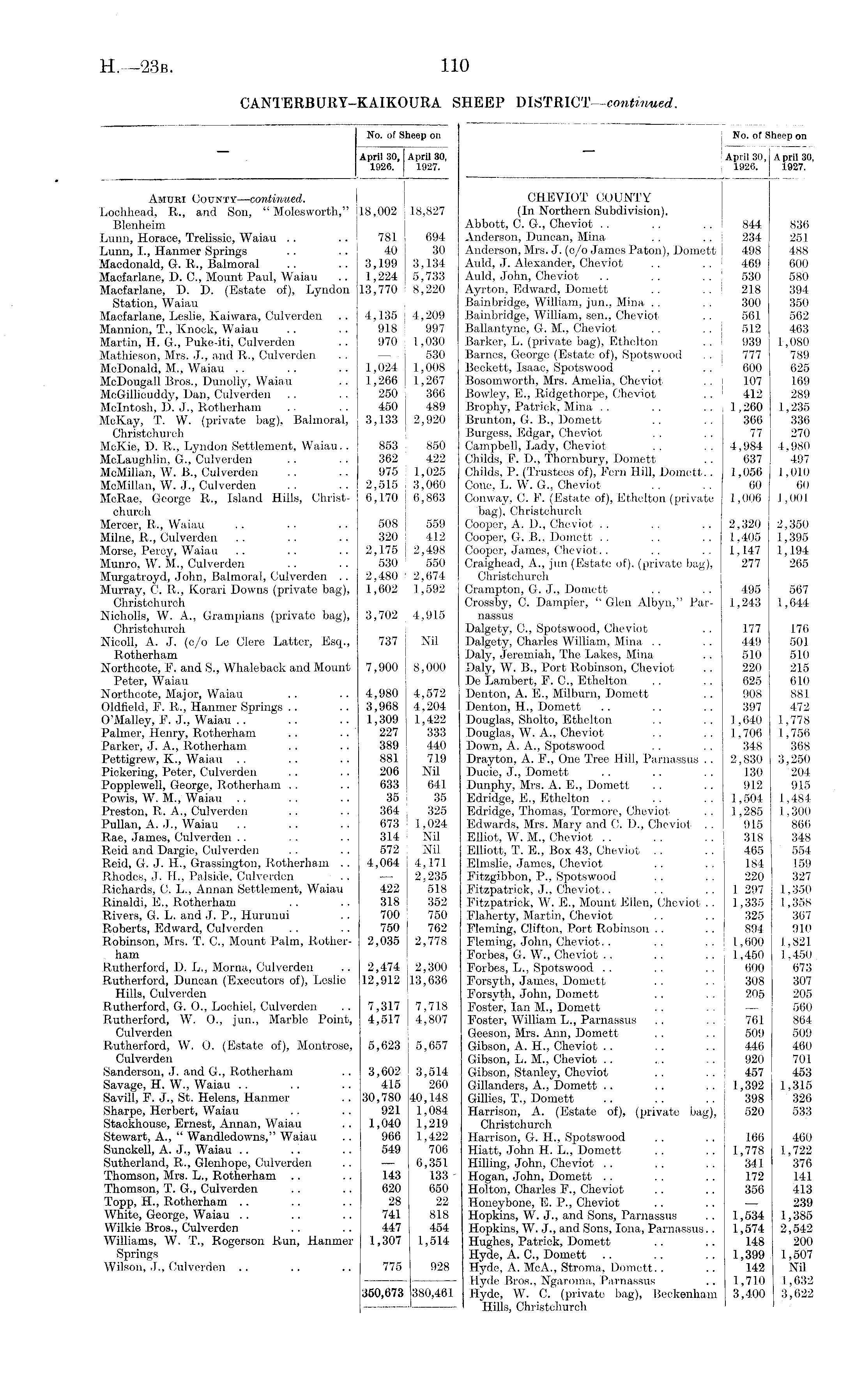 No. of Sheep on April 30, April 30, j 1826. 1927. CHEVIOT COUNTY (In Northern Subdivision). Abbott, C. G., Cheviot . . . . . . 844 836 Anderson, Duncan, Mina .. .. 234 281 Anderson, Mrs. J. (c/o James Paton), Domett 498 488 Auld, J. Alexander, Cheviot . . .. 469 600 Auld, John, Cheviot .. . . . . ! 530 580 Ayrton, Edward, Domett .. .. I 218 394 Bainbridge, William, jun., Mina .. .. 300 350 Bainbridge, William, sen., Cheviot . . 561 562 Ballantyne, G. M., Cheviot . . . . 512 463 Barker, L. (private bag), Ethelton .. 939 1,080 Barnes, George (Estate of), Spotswood . . 777 789 Beckett, Isaac, Spotswood . . .. j 600 625 Bosomworth, Mrs. Amelia, Cheviot . . j 107 169 Bowley, E., Ridgethorpe, Cheviot . . 1 412 289 Brophy, Patrick, Mina .. .. .. | 1,260 1,235 Brunton, G. B., Domett . . . . 366 336 Burgess, Edgar, Cheviot . . . . 77 270 Campbell, Lady, Cheviot .. .. 4,984 4,980 Childs, F. D., Thornbury, Domett . . 637 497 Childs, P. (Trustees of), Fern Hill, Domett.. 1,056 1,010 Cone, L. W. G., Cheviot .. .. 60 60 Conway, C. F. (Estate of), Ethelton (private 1,006 1,001 bag), Christchurch Cooper, A. D., Cheviot .. .. .. 2,320 2,350 Cooper, G. B., Domett . . . . . . 1,405 1,395 Cooper, James, Cheviot.. .. .. 1,147 1,194 Craighead, A., jun (Estate of), (private bag), 277 265 Christchurch Crampton, G. J., Domett .. .. 495 567 Crossby, C. Dampier, "Glen Albyn," Par- 1,243 1,644 nassus Dalgety, C., Spotswood, Cheviot . . 177 176 Dalgety, Charles William, Mina . . .. 449 501 Daly, Jeremiah, The Lakes, Mina .. 510 510 Daly, W. B., Port Robinson, Cheviot .. 220 215 De Lambert, F. C., Ethelton . . .. 625 610 Denton, A. E., Milburn, Domett . . 908 881 Denton, H., Domett .. . . .. 397 472 Douglas, Sholto, Ethelton .. .. 1,640 3,778 Douglas, W. A., Cheviot .. .. 1,706 1,756 Down, A. A., Spotswood .. . . 348 368 Drayton, A. F., One Tree Hill, Parnassus . . 2,830 3,250 Ducie, J., Domett . . .. . . 130 204 Dunphy, Mrs. A. E., Domett .. .. 912 915 Edridge, E., Ethelton .. .. .. 1,504 1,484 Edridge, Thomas, Tormore, Cheviot ., 1,285 1,300 Edwards, Mrs. Mary and C. D., Cheviot .. 915 866 Elliot, W. M., Cheviot .. .. .. 318 348 Elliott, T. E., Box 43, Cheviot .. .. 465 554 Elmslie, James, Cheviot .. .. 184 159 Fitzgibbon, P., Spotswood . . . . 220 327 Fitzpa trick, J., Cheviot.. .. .,1 297 1,350 Fitzpatrick, W. E., Mount Ellen, Cheviot . . 1,335 1,358 Flaherty, Martin, Cheviot .. . . 325 367 Fleming, Clifton, Port Robinson . . . . 894 910 Fleming, John, Cheviot.. .. .. I 1,600 1,821 Forbes, G. W., Cheviot .. .. .. j 1,450 1,450 Forbes, L., Spotswood .. .. .. j 600 673 Forsyth, James, Domett • • • • I 308 307 Forsyth, John, Domett . . .. j 205 205 Foster, Ian M., Domett . . . . j — 560 Foster, William L., Parnassus . . . . 761 864 Geeson, Mrs. Ann, Domett .. .. 509 509 Gibson, A. H., Cheviot . . . . .. 446 460 Gibson, L. M., Cheviot .. ... .. 920 701 Gibson, Stanley, Cheviot . . . . 457 453 Gillanders, A., Domett .. .. .. 1,392 1,315 Gillies, T., Domett .. . . . . 398 326 Harrison, A. (Estate of), (private bag), 520 533 Christchurch Harrison, G. H., Spotswood . . .. 166 460 Hiatt, John H. L., Domett .. .. 1,778 1,722 Hilling, John, Cheviot .. . . . . 341 376 Hogan, John, Domett . . .. .. 172 141 Holton, Charles F., Cheviot .. .. 356 413 Honeybone, E. P., Cheviot .. .. — 239 Hopkins, W. J., and Sons, Parnassus .. 1,534 1,385 Hopkins, W. J., and Sons, Iona, Parnassus.. 1,574 2,542 Hughes, Patrick, Domett .. . . 148 200 Hyde, A. C„ Domett .. .. .. 1,399 1,507 Hyde, A. McA., Stroma, Domett.. .. 142 Nil - Hyde Bros., Ngaroma, Parnassus .. 1,710 1,632 Hyde, W. C. (private bag), Beckenham 3,400 3,622 Hills, Christchurch