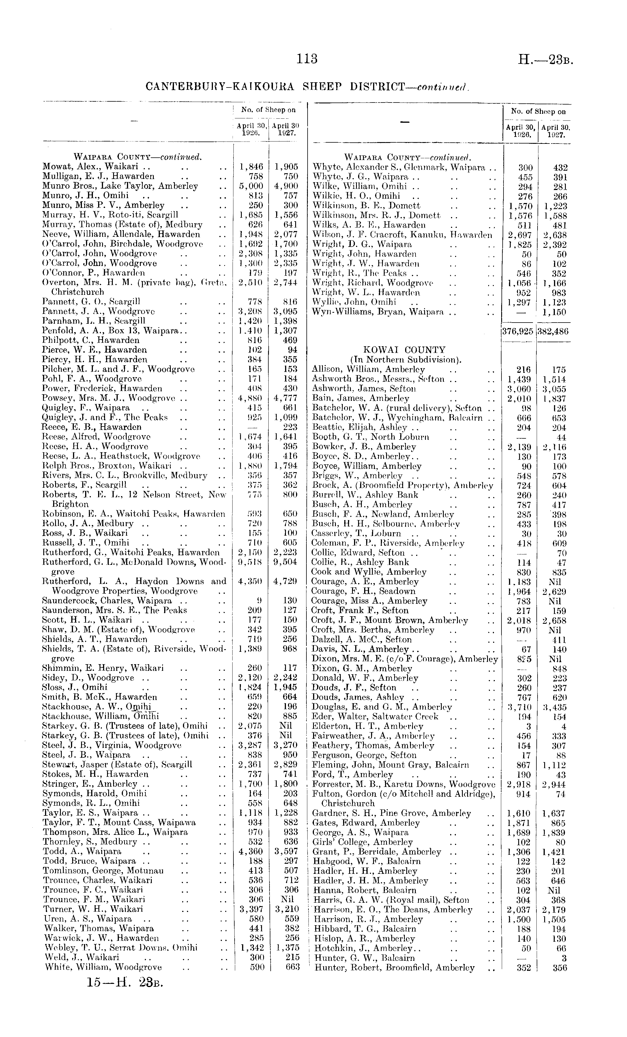 No. of Sheep on April 30, April 30, 1926. 1927. Waipara County—continued. Whyte, Alexander S., Glcnmark, Waipara .. 300 432 Whyte, J. G., Waipara . . . . . . 455 391 Wilke, William, Omihi .. .. .. 294 281 Wilkie, H. 0., Omihi .. .. .. 276 266 Wilkinson, B. E., Domett .. .. 1,570 1,223 Wilkinson, Mrs. R. J., Domett .. .. 1,576 1,588 Wilks, A. B. E., Hawarden .. .. 51] 481 Wilson, J. F. Craeroft, Kanuku, Hawarden 2,697 2,638 Wright, D. G., Waipara .. .. 1,825 2,392 Wright, John, Hawarden .. .. 50 50 Wright, J. W., Hawarden . . . . 86 102 Wright, R., The Peaks .. .. .. 546 352 Wright, Richard, Woodgrove .. .. 1,056- 1,166 Wright, W. L., Hawarden .. .. 952 983 Wyllie, John, Omihi .. .. .. 1,297 1,123 Wyn-Williams, Bryan, Waipara .. .. — 1,150 376,925 382,486 KOWAI COUNTY (In Northern Subdivision). Allison, William, Amberley .. .. 216 175 Ashworth Bros., Messrs., Sefton .. .. 1,439 1,514 Ashworth, James, Sefton .. .. 3,060 3,055 Bain, James, Amberley .. .. 2,010 1,837 Batehelor, W. A. (rural delivery), Sefton .. 98 126 Batehelor, W. J., Wychingham, Balcairn .. 666 653 Beattio, Elijah, Ashley .. .. .. 204 204 Booth, G. T., North Loburn .. .. — 44 Bowker, J. B., Amberley .. .. 2,139 2,116 Boyce, S. D., Amberley.. .. .. 130 173 Boyce, William, Amberley .. .. 90 100 Briggs, W., Amberley .. .. .. 548 578 Brock, A. (Broomfield Property), Amberley 724 604 Burrell, W., Ashley Bank .. .. 260 240 Buseh, A. H., Amberley .. .. 787 417 Busch, P. A., Newland, Amberley .. 285 398 Buseh, H. H., Selbourne, Amberley .. 433 198 Casserley, T., Loburn .. .. .. 30 30 Coleman, P. P., Riverside, Amberley .. 418 (509 Collie, Edward, Sefton .. * .. .. — 70 Collie, R., Ashley Bank .. .. 114 47 Cook and Wyllie, Amberley .. .. 830 835 Courage, A. E., Amberley .. .. 1,183 Nil Courage, F. H., Seadown .. .. 1,964 2,629 Courage, Miss A., Amberley .. .. 783 Nil Croft, Frank F., Sefton .. .. 217 159 Croft, J. F., Mount Brown, Amberley .. 2,018 2,658 Croft, Mrs. Bertha, Amberley .. .. 970 Nil Dalzell, A. McC., Sefton .. .. — 411 Davis, N. L., Amberley .. .. .. 67 140 Dixon, Mrs. M. E. (c/o F. Courage), Amberley 855 Nil Dixon, G. M., Amberley .. .. — 848 Donald, W. F., Amberley .. .. 302 223 Douds, J. F., Sefton .. .. .. 260 237 Douds, James, Ashley .. .. .. 767 620 Douglas, E. and G. M., Amberley .. 3,710 3,435 Eder, Walter, Saltwater Creek .. . . 194 154 Elderton, H. T., Amberley .. .. 3 4 | Fairweather, J. A., Amberley .. .. 456 333 j Feathery, Thomas, Amberley .. .. 154 307 Ferguson, George, Sefton .. .. 17 88 Fleming, John, Mount Gray, Balcairn .. 867 1,112 Ford, T., Amberley .. .. .. 190 43 i Forrester, M. B., Karetu Downs, Woodgrove 2,918 2,944 Fulton, Gordon (c/o Mitchell and Aldridge), 914 74 Christchurch Gardner, S. H., Pine Grove, Amberley .. 1,610 1,637 Gates, Edward, Amberley .. .. 1,871 865 George, A. S., Waipara .. .. 1,689 1,839 Girls' College, Amberley .. .. 102 80 Grant, P., Berridale, Amberley .. .. 1,306 1,421 Habgood, W. F., Balcairn .. .. 122 142 Hadler, H. H., Amberley .. .. 230 201 Hadler, J. H. M., Amberley .. .. 563 646 Hanna, Robert, Balcairn . . .. 102 Nil : Harris, G. A. W. (Royal mail), Sefton .. 304 368 | Harrison, E. 0., The Deans, Amberley .. 2,037 2,179 Harrison, R. J., Amberley .. .. 1,500 1,505 Hibbard, T. G., Balcairn .. .. 188 194 Hislop, A. R., Amberley .. .. 140 130 Hotchkin, J., Amberley.. .. .. 50 66 Hunter, G. W., Balcairn .. .. — 3 Hunter, Robert, Broomfield, Amberley .. 352 356