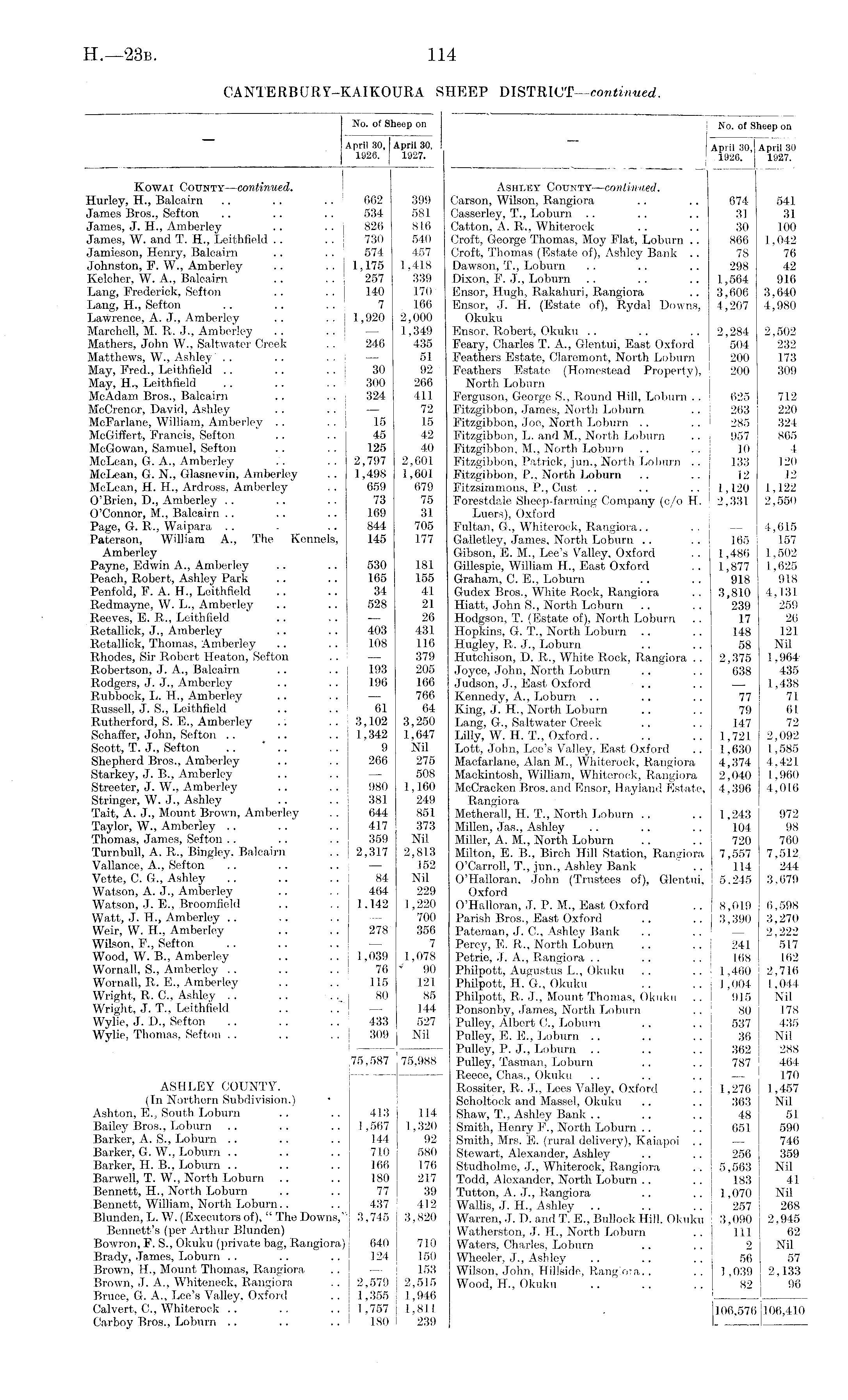 No. of Sheep on April 30,1 April 30, 1926. 1927. Kowai County—continued. Hurley, H., Balcairn .. .. .. 662 399 James Bros., Sefton .. .. .. 534 581 James, J. H., Amberley .. .. 826 816 James, W. and T. H., Leithfield .. . . 730 540 Jamieson, Henry, Balcairn .. . . 574 457 Johnston, P. W., Amberley .. .. 1.175 1,418 Kelcher, W. A., Balcairn .. . . 257 339 Lang, Frederick, Sefton . . .. 140 170 Lang, H., Sefton .. .. .. 7 166 Lawrence, A. J., Amberley .. .. 1,920 2,000 Marchell, M. R. J., Amberley .. .. — 1,349 Mathers, John W., Saltwater Creek . . 246 435 Matthews, W., Ashley .. .. . . — 51 May, Fred., Leithfield .. .. .. 30 92 May, H., Leithfield .. .. .. 300 266 McAdam Bros., Balcairn .. .. 324 411 McCrenor, David, Ashley .. .. — 72 McFarlane, William, Amberley .. . . | 15 15 McGiffert, Francis, Sefton .. .. 45 42 McGowan, Samuel, Sefton .. .. 125 40 McLean, G. A., Amberley . . .. 2,797 2,601 McLean, G. N., Glasnevin, Amberley .. 1,498 1,601 McLean, H. H., Ardross, Amberley .. 659 679 O'Brien, D., Amberley .. .. .. 73 75 O'Connor, M., Balcairn .. .. .. 169 31 Page, G. R., Waipara .. . .. 844 705 Paterson, William A., The Kennels, 145 177 Amberley Payne, Edwin A., Amberley .. .. 530 181 Peach, Robert, Ashley Park .. .. 165 155 Penfold, F. A. H., Leithfield .. .. 34 41 Redmayne, W. L., Amberley .. .. 528 21 Reeves, E. R., Leithfield .. .. — 26 Retallick, J., Amberley .. .. 403 431 Retallick, Thomas, Amberley .. .. 108 116 Rhodes, Sir Robert Heaton, Sefton .. — 379 Robertson, J. A., Balcairn .. .. 193 205 Rodgers, J. J., Amberley .. . . 196 166 Rubboek, L. H., Amberley .. .. — 766 Russell, J. S., Leithfield ' .. .. 61 64 Rutherford, S. E., Amberley .; .. 3,102 3,250 Schaffer, John, Sefton .. .. .. 1,342 1,647 Scott, T. J., Sefton .. " .. . . 9 Nil Shepherd Bros., Amberley .. . . 266 275 Starkey, J. B., Amberley .. .. — 508 Streeter, J. W., Amberley .. . . 980 1,160 Stringer, W. J., Ashley .. .. 381 249 Tait, A. J., Mount Brown, Amberley .. 644 851 Taylor, W., Amberley .. .. .. 417 373 Thomas, James, Sefton .. .. .. 359 Nil Turnbull, A. R., Bingley, Balcairn .. 2,317 2,813 Vallance, A., Sefton .. .. .. — 152 Vette, C. G., Ashley .. .. .. 84 Nil Watson, A. J., Amberley .. . . 464 229 Watson, J. E., Broomfield .. .. j 1,142 1,220 Watt, J. H., Amberley .. .. .. J — 700 Weir, W. H., Amberley .. ... 278 356 Wilson, F., Sefton .. .. .. — 7 Wood, W. B„ Amberley .. .. 1,039 1,078 Wornall, S., Amberley .. .. .. 76 90 Wornall, R. E., Amberley .. .. 115 121 Wright, R. C., Ashley . . .. .._ 80 85 Wright, J. T., Leithfield .. .'. \ — 144 Wylie, J. !)., Sefton .. .. .. 433 527 Wylie, Thomas, Sefton .. .. . . 309 Nil ,75,587 75,988 ASHLEY COUNTY. (In Northern Subdivision.) Ashton, E., South Loburn .. .. 413 114 Bailey Bros., Loburn .. .. .. 1,567 1,320 Barker, A. S., Loburn .. .. .. 144 92 Barker, G. W., Loburn .. .. .. 710 580 Barker, H. B., Loburn .. .. . . 166 176 Barwell, T. W., North Loburn .. .. 180 217 Bennett, H., North Loburn .. .. 77 39 Bennett, William, North Loburn.. .. 437 412 Blunden, L. W. (Executors of), " The Downs,' 3,745 3,820 Bennett's (per Arthur Blunden) Bowron, F. S., Okuku (private bag, Rangiora) 640 710 Brady, James, Loburn .. .. .. 124 150 Brown, H., Mount Thomas, Rangiora .. — 153 Brown, J. A., Whiteneck, Rangiora .. j 2,579 2,515 Bruce, G. A., Lee's Valley, Oxford .. 1,355 1,946 Calvert, C., Whiterock .. .. .. I 1,757 ; 1,811 Carboy Bros., Loburn .. .. .. I 180 i 239