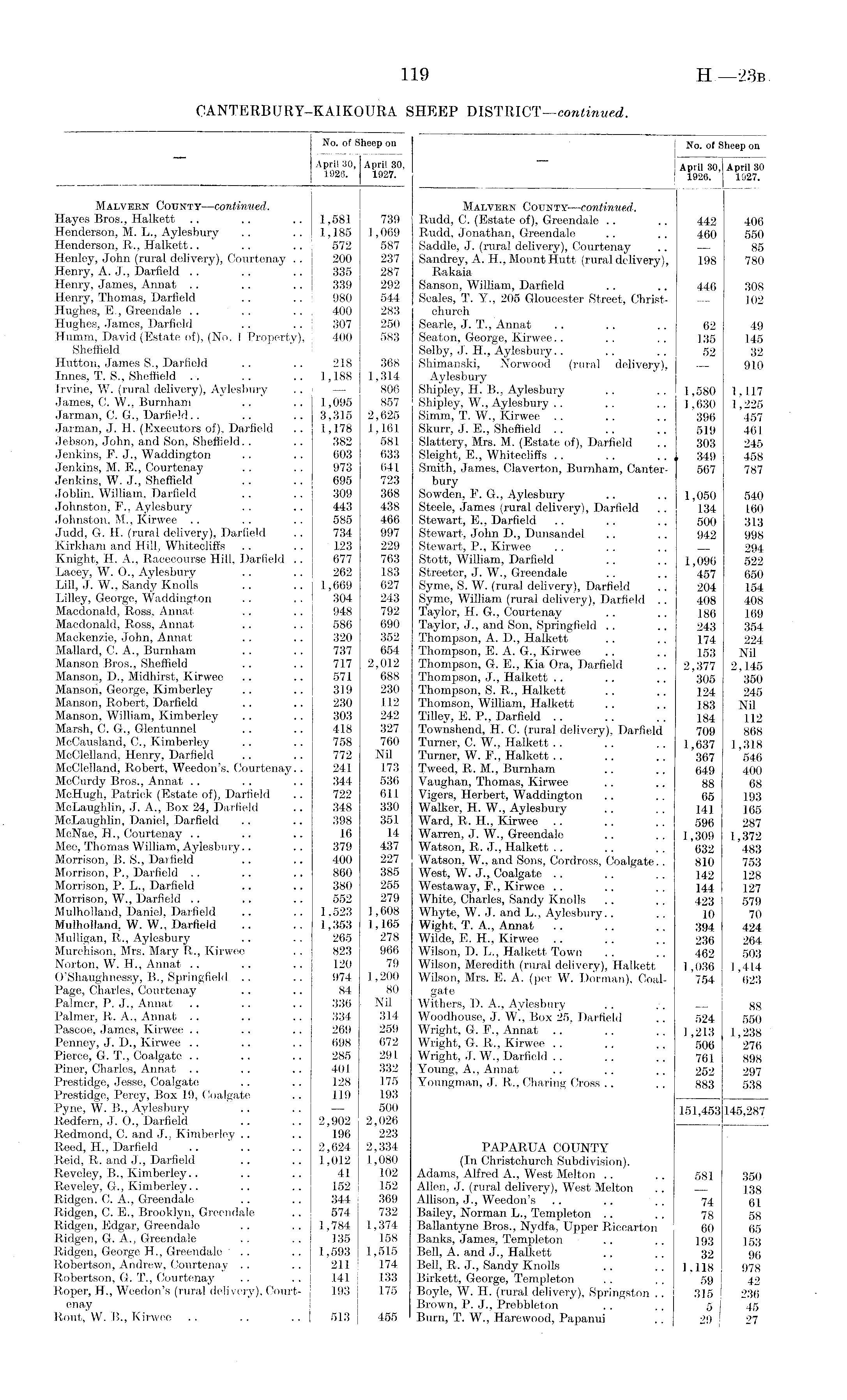 No. of Sheep on April 30, April 30 1926. 1927. Malvern County—continued. Rudd, C. (Estate of), Greendale .. .. 442 406 Rudd, Jonathan, Greendale .. .. 460 550 Saddle, J. (rural delivery), Courtenay .. — 85 Sandrey, A. H., Mount Hutt (rural delivery), 198 780 Rakaia Sanson, William, Darfield .. .. 446 308 Scales, T. Y., 205 Gloucester Street, Christ- 102 church Searle, J. T., Annat .. .. .. 62 49 Seaton, George, Kirwee.. .. .. 135 145 Selby, J. H., Aylesbury.. .. .. 52 32 Shimanski, Norwood (rural delivery), — 910 Aylesbury Shipley, H. B., Aylesbury .. .. 1,580 1,117 Shipley, W., Aylesbury .. .. .. 1,630 1,225 Simm, T. W., Kirwee .. .. .. 396 457 Skurr, J. E., Sheffield .. .. .. 519 461 Slattery, Mrs. M. (Estate of), Darfield .. 303 245 Sleight, E., Whitecliffs .. .. .. ,, 349 458 Smith, James, Claverton, Burnham, Canter- 567 787 bury Sowden, P. G., Aylesbury .. .. 1,050 540 Steele, James (rural delivery), Darfield .. 134 1.60 Stewart, E., Darfield .. .. .. 500 313 Stewart, John D., Dunsandel .. .. 942 998 Stewart, P., Kirwee .. .. .. — 294 Stott, William, Darfield .. .. 1,096 522 Streeter, J. W., Greendale .. .. 457 650 Syme, S. W. (rural delivery), Darfield .. 204 154 Syme, William (rural delivery), Darfield .. 408 408 Taylor, H. G., Courtenay ' .. .. 186 169 Taylor, J., and Son, Springfield .. .. 243 354 Thompson, A. D., Halkett .. .. 174 224 Thompson, E. A. G., Kirwee .. .. 153 Nil Thompson, G. E., Kia Ora, Darfield .. 2,377 2,145 Thompson, J., Halkett .. .. .. 305 350 Thompson, S. R., Halkett .. .. 124 245 Thomson, William, Halkett .. .. 183 Nil Tillev, E. P., Darfield .. . . . . 184 112 Townshend, H. C. (rural delivery), Darfield 709 868 Turner, C. W., Halkett . . .. 1,637 1,318 Turner, W. P., Halkett .. .. .. 367 546 Tweed, R. M., Burnham .. .. 649 400 Vaughan, Thomas, Kirwee .. .. 88 68 Vigers, Herbert, Waddington .. .. 65 193 Walker, H. W., Aylesbury .. .. 141 ]©5 Ward, R. H., Kirwee .. .. .. 596 287 Warren, J. W., Greendale .. .. 1,309 1,372 Watson, R. J., Halkett .. .. .. 632 483 Watson, W., and Sons, Cordross, Coalgate.. 810 753 West, W. J., Coalgate .. .. .. 142 128 Westaway, F., Kirwee .. .. .. 144 127 White, Charles, Sandy Knolls .. .. 423 579 Why te, W.J. and L., Aylesbury.. .. JO 70 Wight, T. A., Annat .. .. .. 394 424 Wilde, E. H., Kirwee .. .. .. 236 264 Wilson, D. L., Halkett Town .. .. 462 503 Wilson, Meredith (rural delivery), Halkett ] ,036 1,414 Wilson, Mrs. E. A. (per W. Dorman), Coal- 754 623 gate Withers, D. A., Aylesbury .. . . 88 Woodhouse, J. W., Box 25, Darfield .. 524 550 Wright, G. P., Annat .. .. .. 1,213 1,238 Wright, G. R., Kirwee .. .. .. 506 276 Wright, J. W., Darfield .. .. .. 761 898 Young, A., Annat .. .. .. 252 297 Youngman, J. R., Charing Cross .. .. 883 538 151,453 145,287 PAPARUA COUNTY (In Christchuroh Subdivision). Adams, Alfred A., West Melton .. .. 581 350 Allen, J. (rural delivery), West Melton .. — 138 Allison, J., Weedon's .. .. .. 74 61 Bailey, Norman L., Templeton .. .. 78 58 Ballantyne Bros., Nydfa, Upper Riccarton 60 65 Banks, James, Templeton .. .. 193 153 Bell, A. and J., Halkett .. .. 32 96 Bell, R. J., Sandy Knolls .. .. 1,118 978 Birkett, George, Templeton , . .. 59 42 Boyle, W. H. (rural delivery), Springston .. 315 236 Brown, P. J., Prebbleton .. .. 5 45 Burn, T. W., Harewood, Papanui .. 29 27