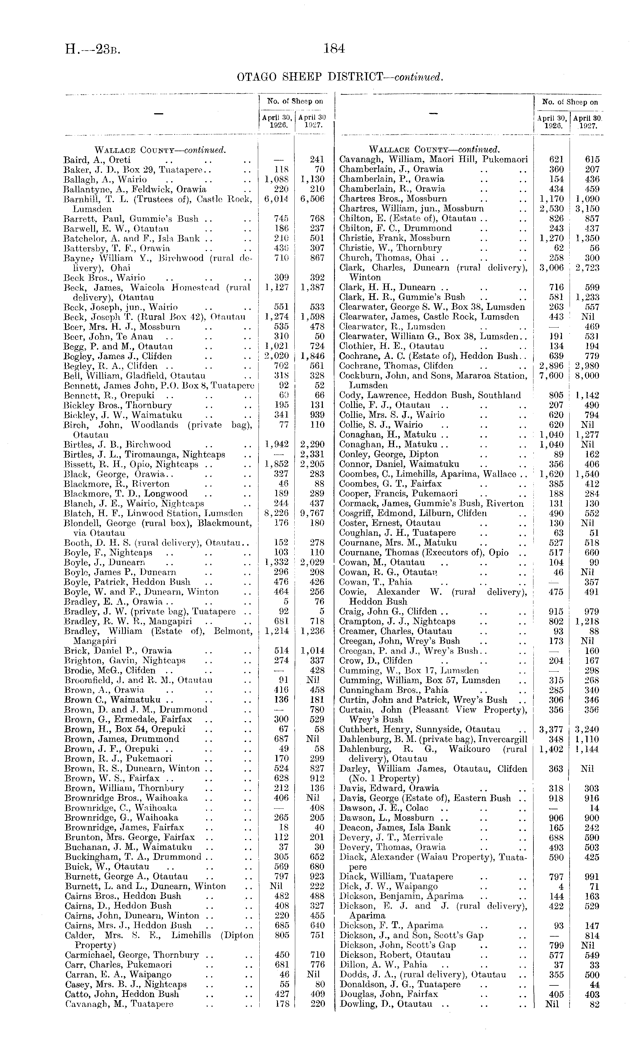 No. of Sheep on April 30, April 30 1926. 1927. Wallacb County—continued. Baird, A., Oreti .. .. .. — 241 Baker, J. X)., Box 29, Tuatapere.. .. 118 70 Ballagh, A., Wairio .. .. .. 1,088 1,130 Ballantyne, A., Feldwick, Orawia .. 220 210 Barnhill, T. L. (Trustees of), Castle Rock, 6,014 6,506 Lumsden Barrett, Paul, Gummie's Bush .. .. 745 768 Barwell, E. W., Otautau .. .. 186 237 Batehelor, A. and F., Isla Bank .. .. 210 501 Battersby, T. F., Orawia .. .. 436 307 Bayne,- William 'ST., Birchwood (rural de- 710 867 livery), Ohai Beck Bros., Wairio .. . . .. 309 392 Beck, James, Waicola Homestead (rural 1,127 1,387 delivery), Otautau Beck, Joseph, jun., Wairio .. .. 551 533 Beck, Joseph T. (Rural Box 42), Otautau 1,274 ],598 Beer, Mrs. H. J., Mossburn .. .. 535 478 Beer, John, Te Anau .. .. .. 310 50 Begg, P. and M., Otautau .. .. 1,021 724 Begley, James J., Clifden .. .. 2,020 1,846 Begley, R. A., Clifden .. .. .. 702 561 Bell, William, Gladfield, Otautau .. 318 328 Bennett, James John, P.O. Box 8, Tuatapere 92 52 Bennett, R., Orepuki .. .. .. 60 66 Bickley Bros., Thornbury .. .. 195 131 Biokley, J. W., Waimatuku .. .. 341 939 Birch, John, Woodlands (private bag), 77 110 Otautau Birtles, J. B., Birchwood .. .. 1,942 2,290 Birtles, J. L., Tiromaunga, Nightcaps .. — 2,331 Bissett, R. H., Opio, Nightcaps .. .. 1,852 2,205 Black, George, Orawia.. .. .. 327 283 Blackmore, R., Riverton .. .. 46 88 Blackmore, T. IX, Longwood .. .. 189 289 Blanch, J. E., Wairio, Nightcaps .. 244 437 Blatch, H. F., Linwood Station, Lumsden 8,226 9,767 Blondell, George (rural box), Blackmount, 176 180 via Otautau Booth, i). H. S. (rural delivery), Otautau.. 152 278 Boyle, F„ Nightcaps .. " .. .. 103 110 Boyle, J., Dunearn .. .. .. 1,332 2,029 Boyle, James P., Dunearn .. .. 296 208 Boyle, Patrick, Heddon Bush .. .. 476 426 Boyle, W. and F., Dunearn, Winton .. 464 256 Bradley, E. A., Orawia .. .. .. 5 76 Bradley, J. W. (private bag), Tuatapere .. 92 5 Bradley, R. W. R., Mangapiri .. .. 681 718 Bradley, William (Estate of), Belmont, 1,214 1,236 Mangapiri Brick, Daniel P., Orawia .. .. 514 1,014 Brighton, Gavin, Nightcaps .. .. 274 337 Brodie, McG., Clifden .. .. .. — 428 Broomfield, J. and R>. M., Otautau .. 91 Nil Brown, A., Orawia .. .. .. 41.6 458 Brown C., Waimatuku .. .. .. 136 181 Brown, D. and J. M., Drummond .. — 780 Brown, G., Ermedale, Fairfax .. .. 300 529 Brown, H., Box 54, Orepuki .. .. 67 58 Brown, James, Drummond .. .. 687 Nil Brown, J. F., Orepuki .. .. .. 49 58 Brown, R. J., Pukemaori .. .. 170 299 Brown, R. S., Dunearn, Winton .. .. 524 827 Brown, W. S., Fairfax .. .. .. 628 912 Brown, William, Thornbury .. .. 212 136 Brownridge Bros., Waihoaka .. .. 406 Nil Brownridge, C., Waihoaka .. .. — 408 Brownridge, G., Waihoaka .. .. 265 205 Brownridge, James, Fairfax .. .. 18 40 Brunton, Mrs. George, Fairfax .. .. 112 201 Buchanan, J. M., Waimatuku .. .. 37 30 Buckingham, T. A., Drummond .. .. 305 652 Buick, W., Otautau .. .. .. 569 680 Burnett, George A., Otautau .. .. 797 923 Burnett, L. and L., Dunearn,. Winton .. Nil 222 Cairns Bros., Heddon Bush .. .. 482 488 Cairns, D., Heddon Bush .. .. 408 327 Cairns, John, Dunearn, Winton .. .. 220 455 Cairns, Mrs. J., Heddon Bush .. .. 685 640 Calder, Mrs. S. E., Limehills (Dipton 805 751 Property) Carmichael, George, Thornbury .. .. 450 710 Carr, Charles, Pukemaori .. .. 681 776 Carran, E. A., Waipango .. .. 46 Nil Casey, Mrs. B. J., Nightcaps .. .. 55 80 Catto, John, Heddon Bush .. .. 427 409 Cavanagh, M., Tuatapere .. .. 178 220
