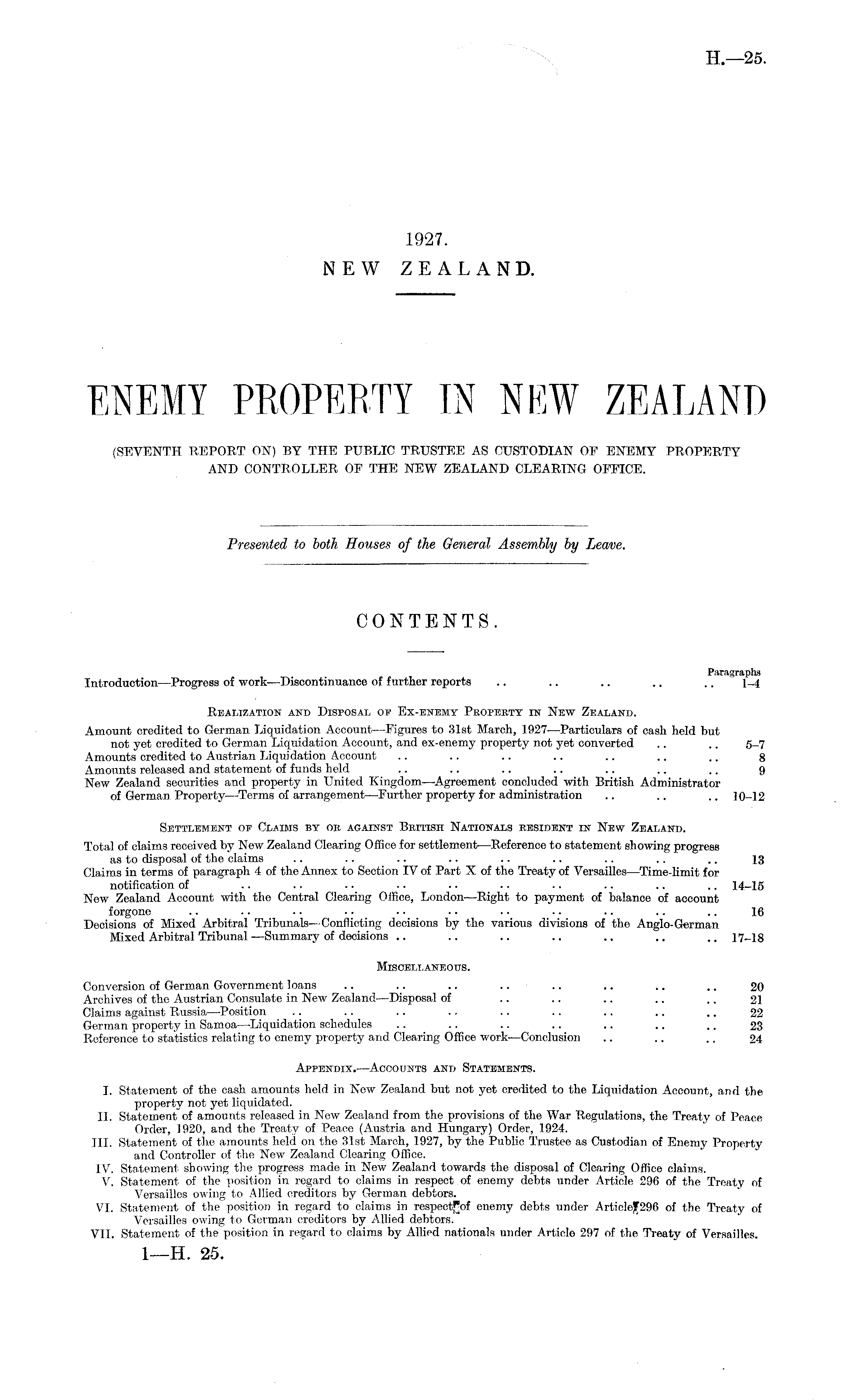 CONTENTS. Paragraphs Introduction —Progress of work—Discontinuance of further reports .. .. .. .. .. i_4 4 Realization and Disposal of Ex-enemy Property in New Zealand. Amount credited to German Liquidation Account—Figures to 31st March, 1927—Particulars of cash held but not yet credited to German Liquidation Account, and ex-enemy property not yet converted .. .. 5-7 Amounts credited to Austrian Liquidation Account .. .. .. .. .. .. .. 8 Amounts released and statement of funds held .. .. .. .. .. .. ~ 9 New Zealand securities and property in United Kingdom—Agreement concluded with British Administrator of German Property—Terms of arrangement—Further property for administration .. .. .. 10-12 Settlement of Claims by oh against British Nationals resident in New Zealand. Total of claims received by New Zealand Clearing Office for settlement—Reference to statement showing progress as to disposal of the claims .. .. .. .. .. .. .. . . .. 13 Claims in terms of paragraph 4 of the Annex to Section IV of Part X of the Treaty of Versailles—Time-limit for notification of .. .. .. .. .. .. .. .. .. .. 14-15 New Zealand Account with the Central Clearing Office, London —Right to payment of balance of account forgone .. .. .. .. .. .. .. .. .. .. .. 16 Decisions of Mixed Arbitral Tribunals—Conflicting decisions by the various divisions of the Anglo-German Mixed Arbitral Tribunal —Summary of decisions .. .. .. .. .. .. .. 17-18 Miscellaneous. Conversion of German Government loans .. .. .. .. .. .. .. .. 20 Archives of the Austrian Consulate in New Zealand —Disposal of .. .. .. .. .. 21 Claims against Russia—Position .. .. .. .. .. .. .. .. .. 22 German property in Samoa —Liquidation schedules .. .. .. .. .. .. .. 23 Reference to statistics relating to enemy property and Clearing Office work.—Conclusion .. .. .. 24 Appendix.—Accounts and Statements. I. Statement of the cash amounts held in New Zealand but not yet credited to the Liquidation Account, and the property not yet liquidated. 11. Statement of amounts released in New Zealand from the provisions of the War Regulations, the Treaty of Peace Order, 1920, and the Treaty of Peace (Austria and Hungary) Order, 1924. 111. Statement of the amounts held on the 31st March, 1927, by the Public Trustee as Custodian of Enemy Property and Controller of the New Zealand Clearing Office. IV. Statement showing the progress made in New Zealand towards the disposal of Clearing Office claims. V. Statement of the position in regard to claims in respect of enemy debts under Article 296 of the Treaty of Versailles owing to Allied creditors by German debtors. VI. Statement of the position in regard to claims in enemy debts under ArtieleJT296 of the Treaty of Versailles owing to German creditors by Allied debtors. VII. Statement of the position in regard to claims by Allied nationals under Article 297 of the Treaty of Versailles.