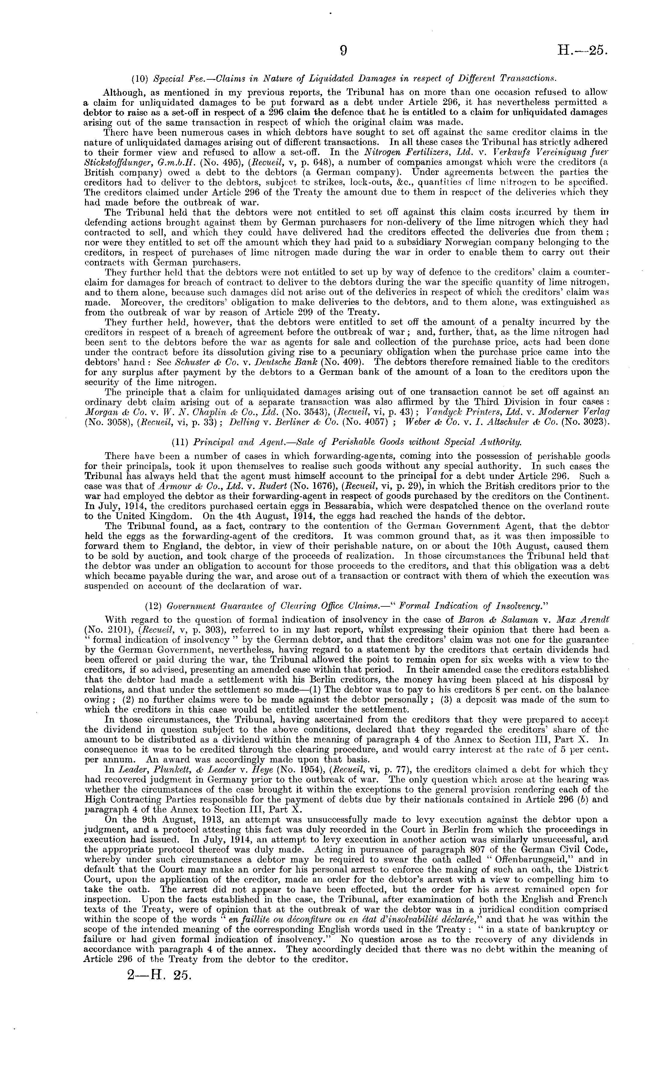 (10) Special Fee. —Claims in Nature of Liquidated Damages in respect of Different Transactions. Although, as mentioned in my previous reports, the Tribunal has on more than one occasion refused to allow a claim for unliquidated damages to be put forward as a debt under Article 296, it has nevertheless permitted a debtor to raise as a set-off in respect of a 296 claim the defence that he is entitled to a claim for unliquidated damages arising out of the same transaction in respect of which the original claim was made. There have been numerous cases in which debtors have sought to set off against the same creditor claims in the nature of unliquidated damages arising out of different transactions. In all these cases the Tribunal has strictly adhered to their former view and refused to allow a set-off. In the Nitrogen Fertilizers, Ltd. v. Verkaufs Vereinigung fuer Stickstoffdunger, G.m.b.H. (No. 495), (Recueil, v, p. 648), a number of companies amongst which were the creditors (a British company) owed a debt to the debtors (a German company). Under agreements between the parties the creditors had to deliver to the debtors, subject to strikes, lock-outs, &c., quantities of lime nitrogen to be specified. The creditors claimed under Article 296 of the Treaty the amount due to them in respect of the deliveries which they had made before the outbreak of war. The Tribunal held that the debtors were not entitled to set off against this claim costs incurred by them in defending actions brought against them by German purchasers for non-delivery of the lime nitrogen which they had contracted to sell, and which they could have delivered had the creditors effected the deliveries due from them ; nor were they entitled to set off the amount which they had paid to a subsidiary Norwegian company belonging to the creditors, in respect of purchases of lime nitrogen made during the war in order to enable them to carry out their contracts with German purchasers. They further held that the debtors were not entitled to set up by way of defence to the creditors' claim a counterclaim for damages for breach of contract to deliver to the debtors during the war the specific quantity of lime nitrogen, and to them alone, because such damages did not arise out of the deliveries in respect of which the creditors' claim was made. Moreover, the creditors' obligation to make deliveries to the debtors, and to them alone, was extinguished as from the outbreak of war by reason of Article 299 of the Treaty. They further held, however, that the debtors were entitled to set off the amount of a penalty incurred by the creditors in respect of a breach of agreement before the outbreak of war; and, further, that, as the lime nitrogen had been sent to the debtors before the war as agents for sale and collection of the purchase price, acts had been done under the contract before its dissolution giving rise to a pecuniary obligation when the purchase price came into the debtors' hand : See Schuster & Co. v. Deutsche Bank (No. 409). The debtors therefore remained liable to the creditors for any surplus after payment by the debtors to a German bank of the amount of a loan to the creditors upon the security of the lime nitrogen. The principle that a claim for unliquidated damages arising out of one transaction cannot be set off against an ordinary debt claim arising out of a separate transaction was also affirmed by the Third Division in four cases : Morgan 6s Co. v. W. N. Chajplin & Co., Ltd. (No. 3543), (Recueil, vi, p. 43) ; Vandyck Printers, Ltd. v. Moderner Verlag (No. 3058), (Recueil, vi, p. 33); Delling v. Berliner & Co. (No. 4057) ; Weber & Co. v. I. Altschuler & Co. (No. 3023). (11) Principal and Agent.—Sale of Perishable Goods without Special Authority. There have been a number of cases in which forwarding-agents, coming into the possession of perishable goods for their principals, took it upon themselves to realise such goods without any special authority. In such cases the Tribunal has always held that the agent must himself account to the principal for a debt under Article 296. Such a case was that of Armour & Co., Ltd. v. Rudert (No. 1676), (Recueil, vi, p. 29), in which the British creditors prior to the war had employed the debtor as their forwarding-agent in respect of goods purchased by the creditors on the Continent. In July, 1914, the creditors purchased certain eggs in Bessarabia, which were despatched thence on the overland route to the United Kingdom. On the 4th August, 1914, the eggs had reached the hands of the debtor. The Tribunal found, as a fact, contrary to the contention of the German Government Agent, that the debtor held the eggs as the forwarding-agent of the creditors. It was common ground that, as it was then impossible to forward them to England, the debtor, in view of their perishable nature, on or about the 10th August, caused them to be sold by auction, and took charge of the proceeds of realization. In those circumstances the Tribunal held that the debtor was under an obligation to account for those proceeds to the creditors, and that this obligation was a debt which became payable during the war, and arose out of a transaction or contract with them of which the execution wassuspended on account of the declaration of war. (12) Government Guarantee of Clearing Office Claims. —" Formal Indication of Insolvency.'''' With regard to the question of formal indication of insolvency in the case of Baron & Salaman v. Max Arendt (No. 2101), (Recueil, v, p. 303), referred to in my last report, whilst expressing their opinion that there had been a. " formal indication of insolvency " by the German debtor, and that the creditors' claim was not one for the guarantee by the German Government, nevertheless, having regard to a statement by the creditors that certain dividends had been offered or paid during the war, the Tribunal allowed the point to remain open for six weeks with a view to the creditors, if so a