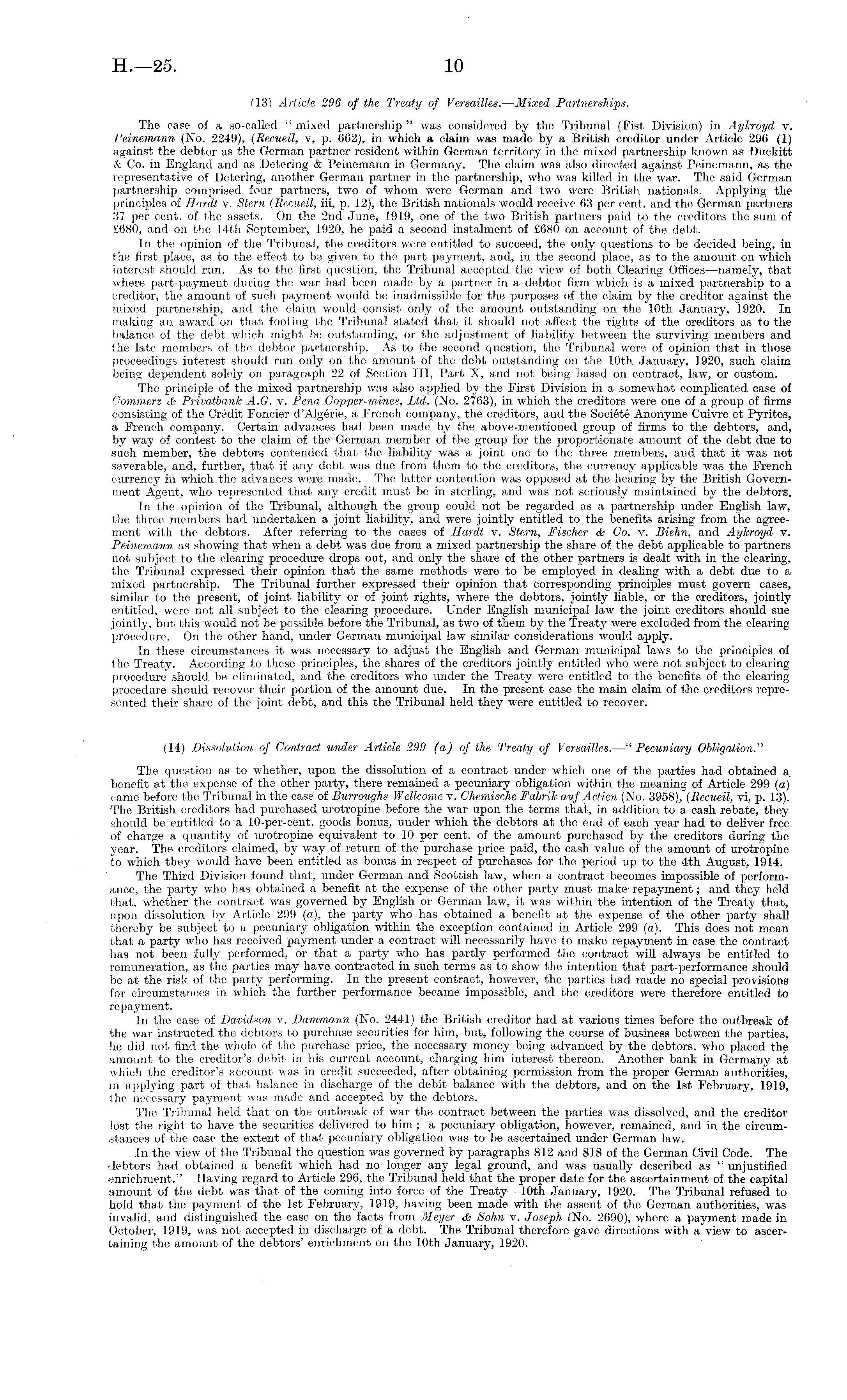 (13) Article 296 of the Treaty of Versailles. —Mixed' Partnerships. The case of a so-called " mixed partnership " was considered by the Tribunal (Fist Division) in Ayhroyd v. Peinemann (No. 2249), (Recueil, v, p. 662), in which a claim was made by a British creditor under Article 296 (1) against the debtor as the German partner resident within German territory in the mixed partnership known as Duckitt & Co. in England and as Detering & Peinemann in Germany. The claim was also directed against Peinemann, as the representative of Detering, another German partner in the partnership, who was killed in the war. The said German partnership comprised four partners, two of whom were German and two were British nationals. Applying the principles of Hardt v. Stern (Recueil, iii, p. 12), the British nationals would receive 63 per cent, and the German partners 37 per cent, of the assets. On the 2nd June, 1919, one of the two British partners paid to the creditors the sum of £680, and on the 14th September, 1920, he paid a second instalment of £680 on account of the debt. In the opinion of the Tribunal, the creditors were entitled to succeed, the only questions to be decided being, in the first place, as to the effect to be given to the part payment, and, in the second place, as to the amount on which interest should run. As to the first question, the Tribunal accepted the view of both Clearing Offices —namely, that where part-payment during the war had been made by a partner in a debtor firm which is a mixed partnership to a creditor, the amount of such payment would be inadmissible for the purposes of the claim by the creditor against the mixed partnership, and the claim would consist only of the amount outstanding on the 10th January, 1920. In making an award on that footing the Tribunal stated that it should not affect the rights of the creditors as to the balance of the debt which might be outstanding, or the adjustment of liability between the surviving members and the late members of the debtor partnership. As to the second question, the Tribunal were of opinion that in those proceedings interest should run only on the amount of the debt outstanding on the 10th January, 1920, such claim being dependent solely on paragraph 22 of Section 111, Part X, and not being based on contract, law, or custom. The principle of the mixed partnership was also applied by the First Division in a somewhat complicated case of Commerz & Privatbank A.G. v. Pena Copper-mines, Ltd. (No. 2763), in which the creditors were one of a group of firms consisting of the Credit Foncier d'Algerie, a French company, the creditors, and the Societe Anonyme Cuivre et Pyrites, a French company. Certain advances had been made by the above-mentioned group of firms to the debtors, and, by way of contest to the claim of the German member of the group for the proportionate amount of the debt due to such member, the debtors contended that the liability was a joint one to the three members, and that it was not severable, and, further, that if any debt was due from them to the creditors, the currency applicable was the French currency in which the advances were made. The latter contention was opposed at the hearing by the British Government Agent, who represented that any credit must be in sterling, and was not seriously maintained by the debtors. In the opinion of the Tribunal, although the group could not be regarded as a partnership under English law, the three members had undertaken a joint liability, and were jointly entitled to the benefits arising from the agreement with the debtors. After referring to the cases of Hardt v. Stern, Fischer & Go. v. Biehn, and Ayhroyd v. Peinemann as showing that when a debt was due from a mixed partnership the share of the debt applicable to partners not subject to the clearing procedure drops out, and only the share of the other partners is dealt with in the clearing, the Tribunal expressed their opinion that the same methods were to be employed in dealing with a debt due to a mixed partnership. The Tribunal further expressed their opinion that corresponding principles must govern cases, similar to the present, of joint liability or of joint rights, where the debtors, jointly liable, or the creditors, jointly entitled, were not all subject to the clearing procedure. Under English municipal law the joint creditors should sue jointly, but this would not be possible before the Tribunal, as two of them by the Treaty were excluded from the clearing procedure. On the other hand, under German municipal law similar considerations would apply. In these circumstances it was necessary to adjust the English and German municipal laws to the principles of the Treaty. According to these principles, the shares of the creditors jointly entitled who were not subject to clearing procedure should be eliminated, and the creditors who under the Treaty were entitled to the benefits of the clearing procedure should recover their portion of the amount due. In the present case the main claim of the creditors represented their share of the joint debt, and this the Tribunal held they were entitled to recover. (14) Dissolution of Contract under Article 299 (a) of the Treaty of Versailles.—" Pecuniary Obligation."''' The question as to whether, upon the dissolution of a contract under which one of the parties had obtained a benefit at the expense of the other party, there remained a pecuniary obligation within the meaning of Article 299 (a) came before the Tribunal in the case of Burroughs Wellcome v. Chemische Fabrik auf Actien (No. 3958), (Recueil, vi, p. 13). The British creditors had purchased urotropine before the war upon the terms that, in addition to a cash rebate, they should be entitled to a 10-per-cent. goods bonus, under which the debtors at the end of each year had to deliver free of charge a quantity of urotropine equivalent to 10 per cent, of the amount purchased by the creditors during the year. The credi
