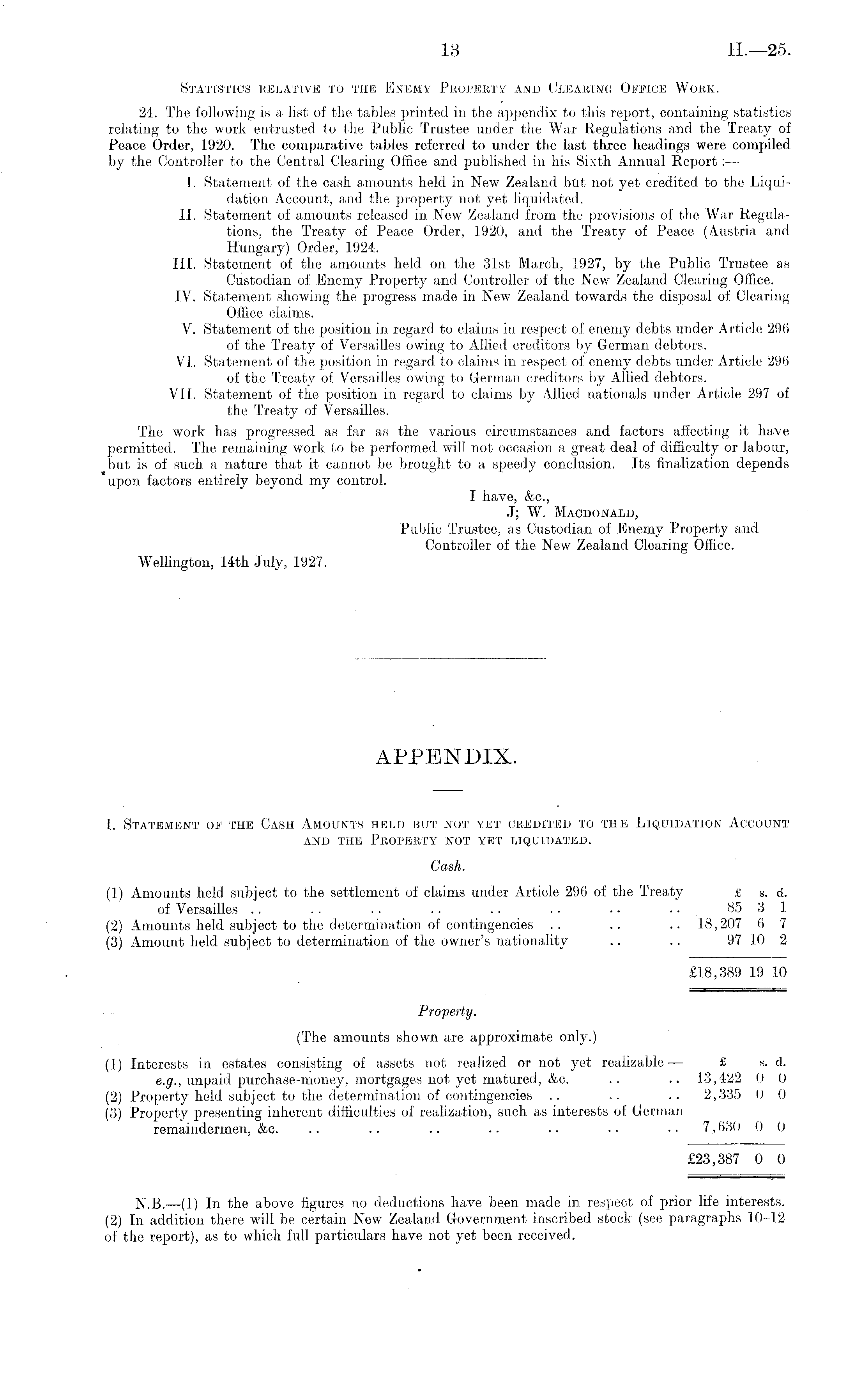 APPENDIX. I. Statement of the Cash Amounts held but not yet credited to the Liquidation Account and the Property not yet liquidated. Gash. (1) Amounts held subject to the settlement of claims under Article 296 of the Treaty £ s. d. of Versailles .. . . . . .. .. .. .. .. 85 3 1 (2) Amounts held subject to the determination of contingencies .. .. .. 18,207 6 7 (3) Amount held subject to determination of the owner's nationality .. .. 97 10 2 £18,389 19 10 Property. (The amounts shown are approximate only.) (1) Interests in estates consisting of assets not realized or not yet realizable— £ s. d. e.g., unpaid purchase-money, mortgages not yet matured, &c. .. .. 13,422 0 0 (2) Property held subject to the determination of contingencies .. .. .. 2,335 0 0 (3) Property presenting inherent difficulties of realization, such as interests of German remaindermen, &c. .. .. .. .. .. ■ • 7,630 0 0 £23,387 0 0 N. 8.—(1) In the above figures no deductions have been made in respect of prior life interests. (2) In addition there will be certain New Zealand Government inscribed stock (see paragraphs 10-12 of the report), as to which full particulars have not yet been received.