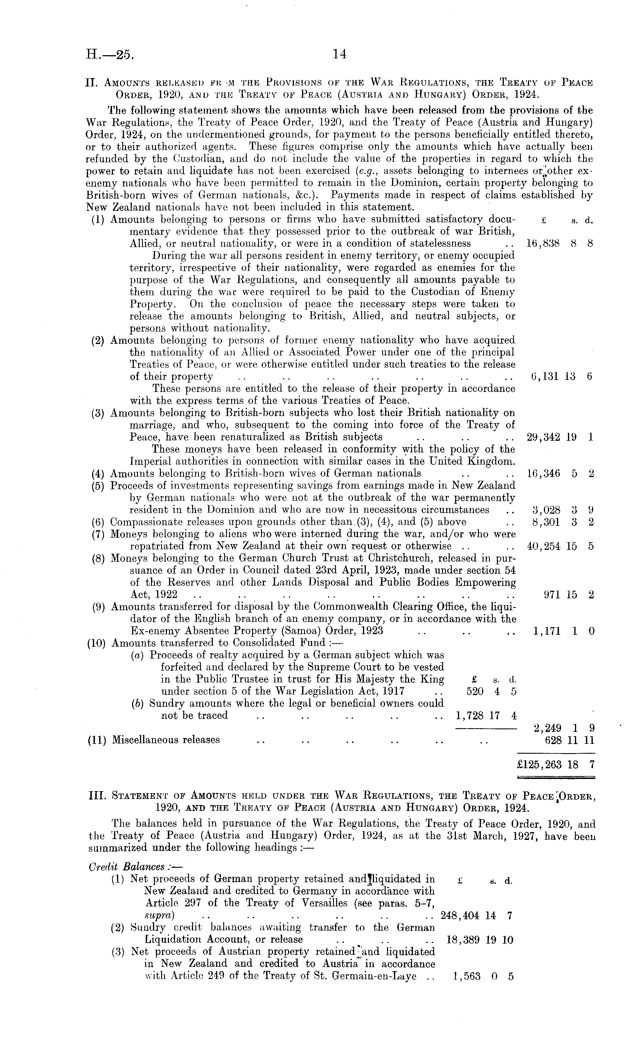 11. Amounts released fr >m the Provisions of the War Regulations, the Treaty of Peace Order, 1920, and the Treaty of Peace (Austria and Hungary) Order, 1924. The following statement shows the amounts which have been released from the provisions of the War Regulations, the Treaty of Peace Order, 1920, and the Treaty of Peace (Austria and Hungary) Order, 1924, on the undermentioned grounds, for payment to the persons beneficially entitled thereto, or to their authorized agents. These figures comprise only the amounts which have actually been refunded by the Custodian, and do not include the value of the properties in regard to which the power to retain and liquidate has not been exercised {e.g., assets belonging to internees exenemy nationals who have been permitted to remain in the Dominion, certain property belonging to British-born wives of German nationals, &c.). Payments made in respect of claims established by New Zealand nationals have not been included in this statement. (1) Amounts belonging to persons or firms who have submitted satisfactory docu- £ s. d. mentary evidence that they possessed prior to the outbreak of war British, Allied, or neutral nationality, or were in a condition of statelessness .. 16,838 8 8 During the war all persons resident in enemy territory, or enemy occupied territory, irrespective of their nationality, were regarded as enemies for the purpose of the War Regulations, and consequently all amounts payable to them during the war were required to be paid to the Custodian of Enemy Property. On the conclusion of peace the necessary steps were taken to release the amounts belonging to British, Allied, and neutral subjects, or persons without nationality. (2) Amounts belonging to persons of former enemy nationality who have acquired the nationality of an Allied or Associated Power under one of the principal Treaties of Peace, or were otherwise entitled under such treaties to the release of their property .. .. .. .. .. .. .. 6,131 13 6 These persons are entitled to the release of their property in accordance with the express terms of the various Treaties of Peace. (3) Amounts belonging to British-born subjects who lost their British nationality on marriage, and who, subsequent to the coming into force of the Treaty of Peace, have been renaturalized as British subjects .. .. .. 29,342 19 1 These moneys have been released in conformity with the policy of the Imperial authorities in connection with similar cases in the United Kingdom. (4) Amounts belonging to British-born wives of German nationals .. .. 16,346 5 2 (5) Proceeds of investments representing savings from earnings made in New Zealand by German nationals who were not at the outbreak of the war permanently resident in the Dominion and who are now in necessitous circumstances .. 3,028 3 9 (6) Compassionate releases upon grounds other than.(3), (4), and (5) above .. 8,301 3 2 (7) Moneys belonging to aliens who were interned during the war, and/or who were repatriated from New Zealand at their own request or otherwise .. .. 40,254- 15 5 (8) Moneys belonging to the German Church Trust at Christchurch, released in pursuance of an Order in Council dated 23rd April, 1923, made under section 54 of the Reserves and other Lands Disposal and Public Bodies Empowering Act, 1922 .. .. .. .. .. .. .. .. 971 15 2 (9) Amounts transferred for disposal by the Commonwealth Clearing Office, the liquidator of the English branch of an enemy company, or in accordance with the Ex-enemy Absentee Property (Samoa) Order, 1923 .. .. .. 1,171 1 0 (10) Amounts transferred to Consolidated Fund : — (a) Proceeds of realty acquired by a German subject which was forfeited and declared by the Supreme Court to be vested in the Public Trustee in trust for His Majesty the King £ s. d. under section sof the War Legislation Act, 1917 .. 520 4 5 (b) Sundry amounts where the legal or beneficial owners could not be traced .. .. .. .. .. 1,728 17 4 2,249 1 9 (11) Miscellaneous releases .. .. .. .. .. .. 628 11 11 £125,263 18 7 111. Statement of Amounts held under the War Regulations, the Treaty of Peace >Order, 1920, and the Treaty of Peace (Austria and Hungary) Order, 1924. The balances held in pursuance of the War Regulations, the Treaty of Peace Order, 1920, and the Treaty of Peace (Austria and Hungary) Order, 1924, as at the 31st March, 1927, have been summarized under the following headings : — Credit Balances: — (1) Net proceeds of German property retained and|liquidated in £ s . d. New Zealand and credited to Germany in accordance with Article 297 of the Treaty of Versailles (see paras. 5-7, supra) .. .. .. .. .. .. 248,404 14 7 (2) Sundry credit balances awaiting transfer to the German Liquidation Account, or release .. .. .. 18,389 19 10 (3) Net proceeds of Austrian property retained and liquidated in New Zealand and credited to Austria in accordance with Article 249 of the Treaty of St. Germain-en-Laye .. 1,563 0 5