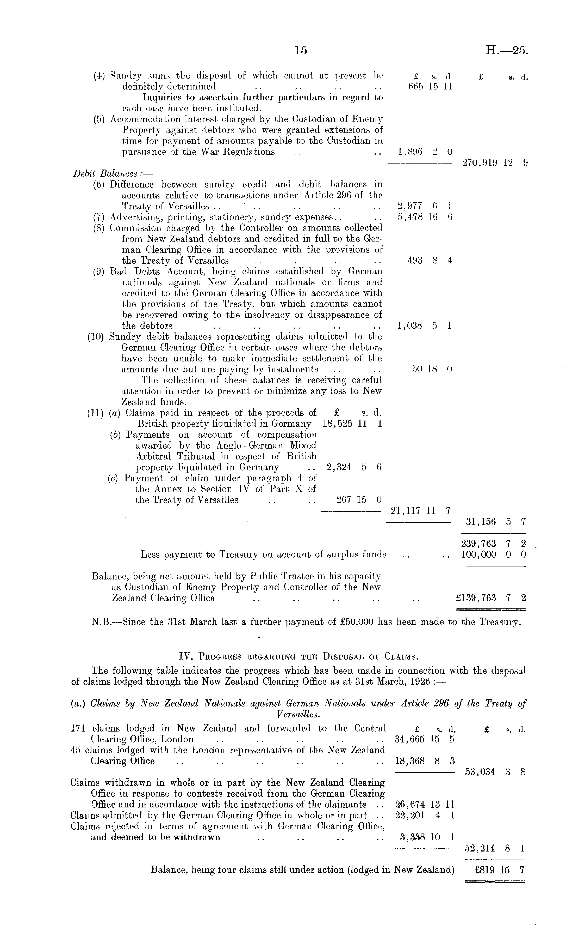 (4) Sundry sums the disposal of which cannot at present be £ s. d £ s. d. definitely determined .. .. .. .. 665 15 11 Inquiries to ascertain further particulars in regard to each case have been instituted. (5) Accommodation interest charged by the Custodian of Enemy Property against debtors who were granted extensions of time for payment of amounts payable to the Custodian in pursuance of the War Regulations .. .. .. 1,896 2 0 270,919 12 9 Debit Balances :— (6) Difference between sundry credit and debit balances in accounts relative to transactions under Article 296 of the Treaty of Versailles .. .. .. .. .. 2,977 6 1 (7) Advertising, printing, stationery, sundry expenses.. .. 5,478 16 6 (8) Commission charged by the Controller on amounts collected from New Zealand debtors and credited in full to the German Clearing Office in accordance with the provisions of the Treaty of Versailles .. .. . . .. 493 8 4 (9) Bad Debts Account, being claims established by German nationals against New Zealand nationals or firms - and credited to the German Clearing Office in accordance with the provisions of the Treaty, but which amounts cannot be recovered owing to the insolvency or disappearance of the debtors . . .. .. . . .. 1,038 5 1 (10) Sundry debit balances representing claims admitted to the German Clearing Office in certain cases where the debtors have been unable to make immediate settlement of the amounts due but are paying by instalments . . . . 50 18 0 The collection of these balances is receiving careful attention in order to prevent or minimize any loss to New Zealand funds. (11) (a) Claims paid in respect of the proceeds of £ s. d. British property liquidated in Germany 18,525 11 1 (b) Payments on account of compensation awarded by the Anglo - Germain Mixed Arbitral Tribunal in respect of British property liquidated in Germany .. 2,324 5 6 (c) Payment of claim under paragraph 4 of the Annex to Section IV of Part X of the Treaty of Versailles .. . . 267 15 0 21,117 11 7 31,156 5 7 239,763 7 2 Less payment to Treasury on account of surplus funds . . .. 100,000 0 0 Balance, being net amount held by Public Trustee in his capacity as Custodian of Enemy Property and Controller of the New Zealand Clearing Office .. .. .. .. .. £139,763 7 2 N.B.—Since the 31st March last a further payment of £50,000 has been made to the Treasury. IV. Progress regarding the Disposal of Claims. The following table indicates the progress which has been made in connection with the disposal of claims lodged through the New Zealand Clearing Office as at 31st March, 1926 : — (a.) Claims by New Zealand Nationals against German Nationals under Article 296 of the Treaty of Versailles. 171 claims lodged in New Zealand and forwarded to the Central £ s. d. £ s. d. Clearing Office, London .. .. .. .. .. 34,665 15 5 45 claims lodged with the London representative of the New Zealand Clearing Office .. .. .. .. .. .. 18,368 8 3 53,034 3 8 Claims withdrawn in whole or in part by the New Zealand Clearing Office in response to contests received from the German Clearing Office and in accordance with the instructions of the claimants .. 26,674 13 11 Claims admitted by the German Clearing Office in whole or in part .. 22,201 4 1 Claims rejected in terms of agreement with German Clearing Office, and deemed to be withdrawn .. .. .. .. 3,338 10 1 52,214 8 1 Balance, being four claims still under action (lodged in New Zealand) £819 15 7