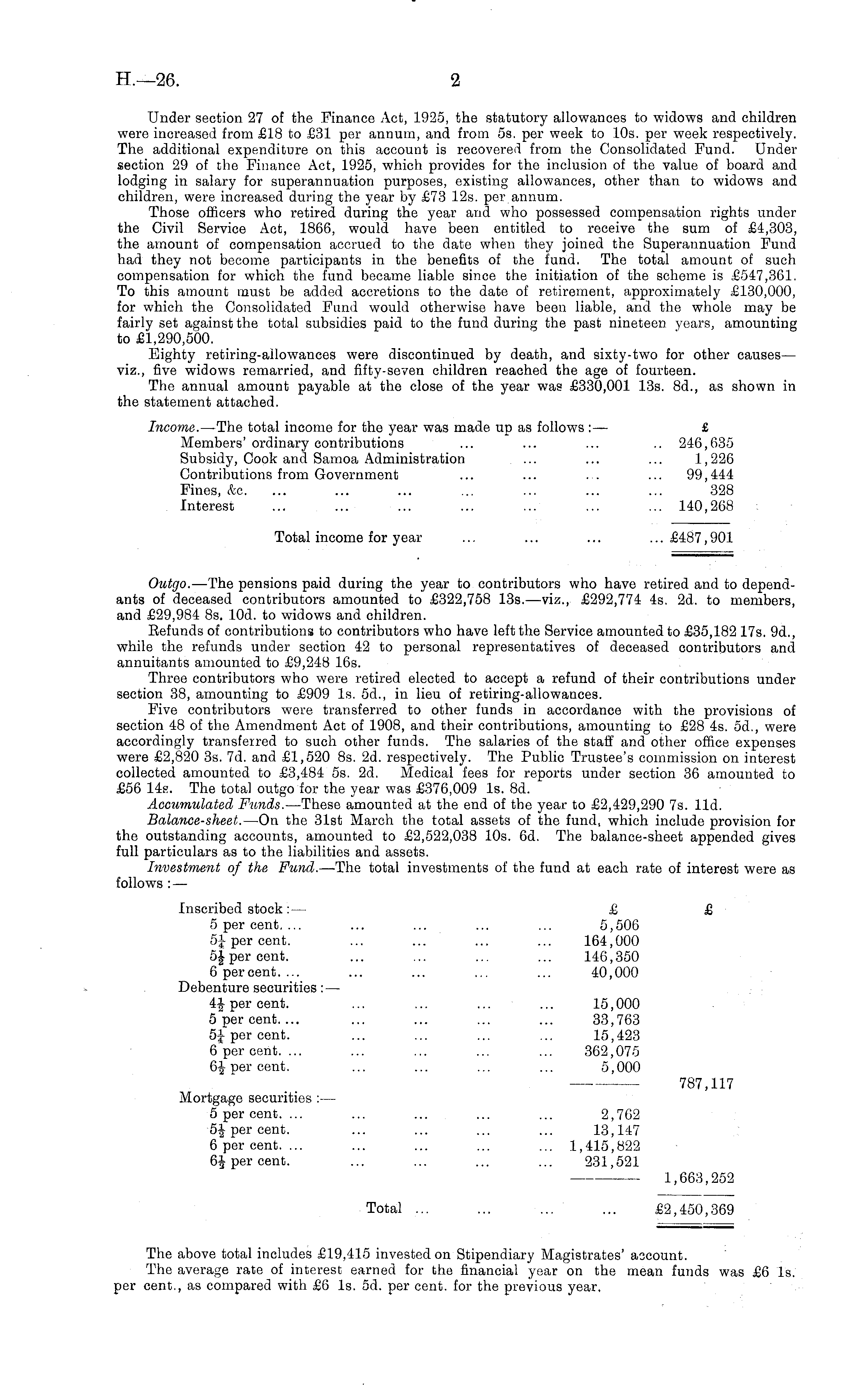 Under section 27 of the Finance Act, 1925, the statutory allowances to widows and children were increased from £18 to £31 per annum, and from ss. per week to 10s. per week respectively. The additional expenditure on this account is recovered from the Consolidated Fund. Under section 29 of the Finance Act, 1925, which provides for the inclusion of the value of board and lodging in salary for superannuation purposes, existing allowances, other than to widows and children, were increased during the year by £73 12s. per annum. Those officers who retired during the year and who possessed compensation rights under the Civil Service Act, 1866, would have been entitled to receive the sum of £1,303, the amount of compensation accrued to the date when they joined the Superannuation Fund had they not become participants in the benefits of the fund. The total amount of such compensation for which the fund became liable since the initiation of the scheme is £547,361. To this amount must be added accretions to the date of retirement, approximately £130,000, for which the Consolidated Fund would otherwise have been liable, and the whole may be fairly set against the total subsidies paid to the fund during the past nineteen years, amounting to £1,290,500. Eighty retiring-allowances were discontinued by death, and sixty-two for other causes— viz., five widows remarried, and fifty-seven children reached the age of fourteen. The annual amount payable at the close of the year was £330,001 13s. Bd., as shown in the statement attached. Income.—The total income for the year was made up as follows : — £ Members'ordinary contributions ... ... ... .. 246,635 Subsidy, Cook and Samoa Administration ... ... ... 1,226 Contributions from Government ... ... ... ... 99,444 Fines, &c. ... ... ... ... ... ... ... 328 Interest ... ... ... ... ... ... ... 140,268 Total income for year ... ... ... ...£487,901 Outgo. —The pensions paid during the year to contributors who have retired and to dependants of deceased contributors amounted to £322,758 13s.—viz., £292,774 4s. 2d, to members, and £29,984 Bs. lOd. to widows and children. Refunds of contributions to contributors who have left the Service amounted to £35,182 17s. 9d., while the refunds under section 42 to personal representatives of deceased contributors and annuitants amounted to £9,248 16s. Three contributors who were retired elected to accept a refund of their contributions under section 38, amounting to £909 Is. 5d., in lieu of retiring-allowances. Five contributors were transferred to other funds in accordance with the provisions of section 48 of the Amendment Act of 1908, and their contributions, amounting to £28 4s. 5d., were accordingly transferred to such other funds. The salaries of the staff and other office expenses were £2,820 3s. 7d. and £1,520 Bs. 2d. respectively. The Public Trustee's commission on interest collected amounted to £3,484 ss. 2d. Medical fees for reports under section 36 amounted to £56 14r. The total outgo for the year was £376,009 Is. Bd. Accumulated Funds. —These amounted at the end of the year to £2,429,290 7s. lid. Balance-sheet.—On the 31st March the total assets of the fund, which include provision for the outstanding accounts, amounted to £2,522,038 10s. 6d. The balance-sheet appended gives full particulars as to the liabilities and assets. Investment of the Fund.—The total investments of the fund at each rate of interest were as follows : — Inscribed stock:— £ £ 5 percent.... ... ... ... ... 5,506 5J per cent. ... ... ... ... 164,000 5| per cent. ... ... ... ... 146,350 6 percent. ... ... ... ... ... 40,000 Debenture securities: — 4-J- per cent. ... ... ... ... 15,000 5 per cent.... ... ... ... ... 33,763 5J per cent. ... ... ... ... 15,423 6 percent.... ... ... ... ... 362,075 per cent. ... ... ... ... 5,000 787,117 Mortgage securities : — 5 per cent. ... ... ... ... ... 2,762 5| per cent. ... ... ... ... 13,147 6 per cent. ... ... ... ... ... 1,415,822 per cent. ... ... ... ... 231,521 1,663,252 Total ... ... ... ... £2,450,369 The above total includes £19,415 invested on Stipendiary Magistrates' account. The average rate of interest earned for the financial year on the mean funds was £6 Is. per cent., as compared with £6 Is. sd. per cent, for the previous year.