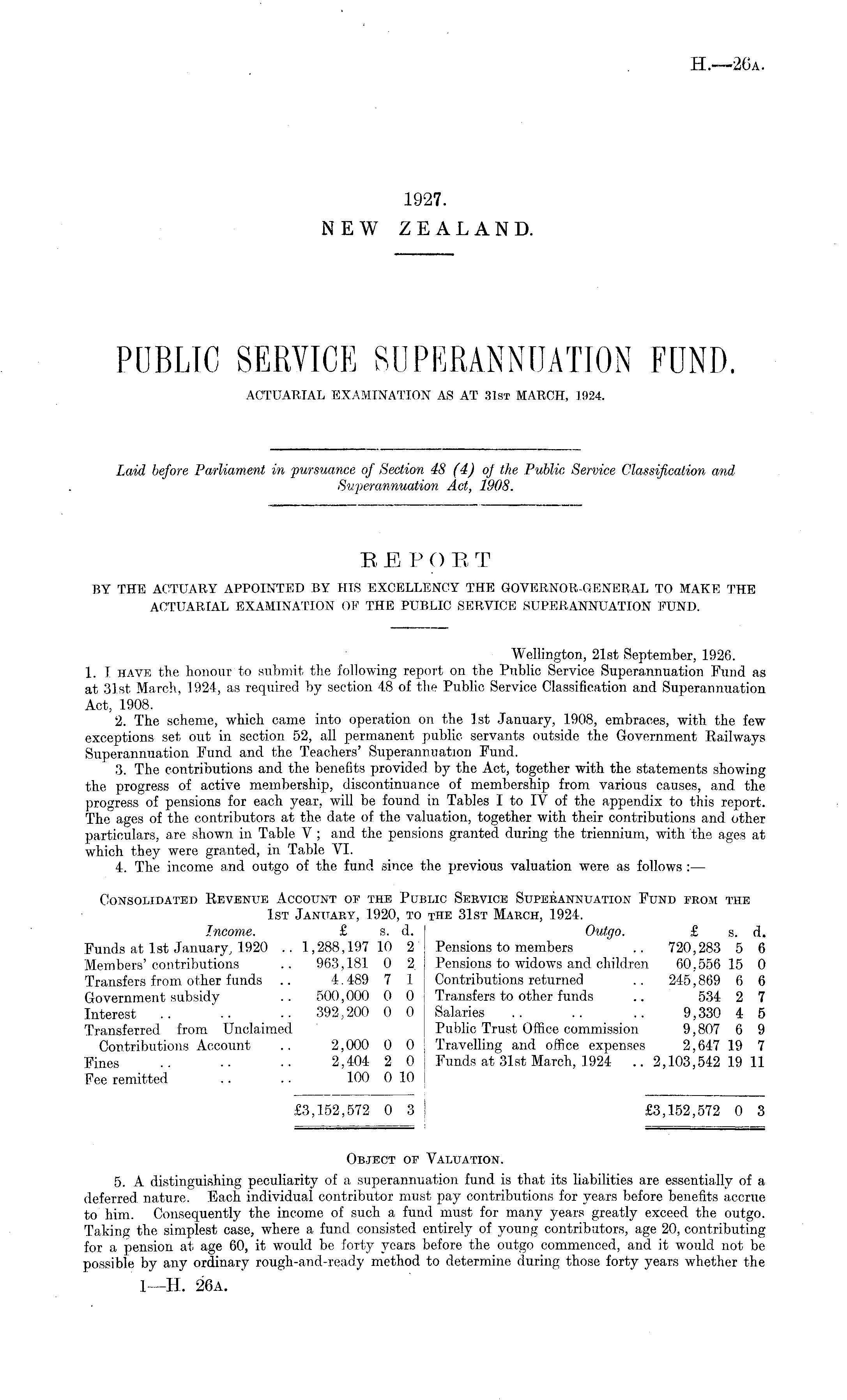 REP O E T BY THE ACTUARY APPOINTED BY HIS EXCELLENCY THE GOVERNOR-GENERAL TO MAKE THE ACTUARIAL EXAMINATION OF THE PUBLIC SERVICE SUPERANNUATION FUND. Wellington, 21st September, 1926. 1. I have the honour to submit the following report on the Public Service Superannuation Fund as at 31st March, 1924, as required by section 48 of the Public Service Classification and Superannuation Act, 1908. 2. The scheme, which came into operation on the Ist .January, 1908, embraces, with the few exceptions set out in section 52, all permanent public servants outside the Government Railways Superannuation Fund and the Teachers' Superannuation Fund. 3. The contributions and the benefits provided by the Act, together with the statements showing the progress of active membership, discontinuance of membership from various causes, and the progress of pensions for each year, will be found in Tables I to IV of the appendix to this report. The ages of the contributors at the date of the valuation, together with their contributions and other particulars, are shown in Table V ; and the pensions granted during the triennium, with the ages at which they were granted, in Table VI. 4. The income and outgo of the fund since the previous valuation were as follows :—- Consolidated Revenue Account of the Public Service Superannuation Fund from the Ist January, 1920, to the 31st March, 1924. Income. £ s. d. Outgo. £ s. d. Funds at Ist January, 1920 .. 1,288,197 10 2 Pensions to members .. 720,283 5 6 Members'contributions .. 963,181 0 2 Pensions to widows and children 60,556 15 0 Transfers from other funds .. 4.489 7 1 Contributions returned .. 245,869 6 6 Government subsidy .. 500,000 0 0 Transfers to other funds .. 534 2 7 Interest .. • • • ■ 392,200 0 0 Salaries .. .. .. 9,330 4 5 Transferred from Unclaimed Public Trust Office commission 9,807 6 9 Contributions Account .. 2,000 0 0 Travelling and office expenses 2,647 19 7 Fines .. -. •• 2,404 2 0 Funds at 31st March, 1924 .. 2,103,542 19 11 Fee remitted .. .. 100 0 10 £3,152,572 0 3 £3,152,572 0 3 Object op Valuation. 5. A distinguishing peculiarity of a superannuation fund is that its liabilities are essentially of a deferred, nature. Each individual contributor must pay contributions for years before benefits accrue to him. Consequently the income of such a fund must for many years greatly exceed the outgo. Taking the simplest case, where a fund consisted entirely of young contributors, age 20, contributing for a pension at age 60, it would be forty years before the outgo commenced, and it would not be possible by any ordinary rough-and-ready method to determine during those forty years whether the