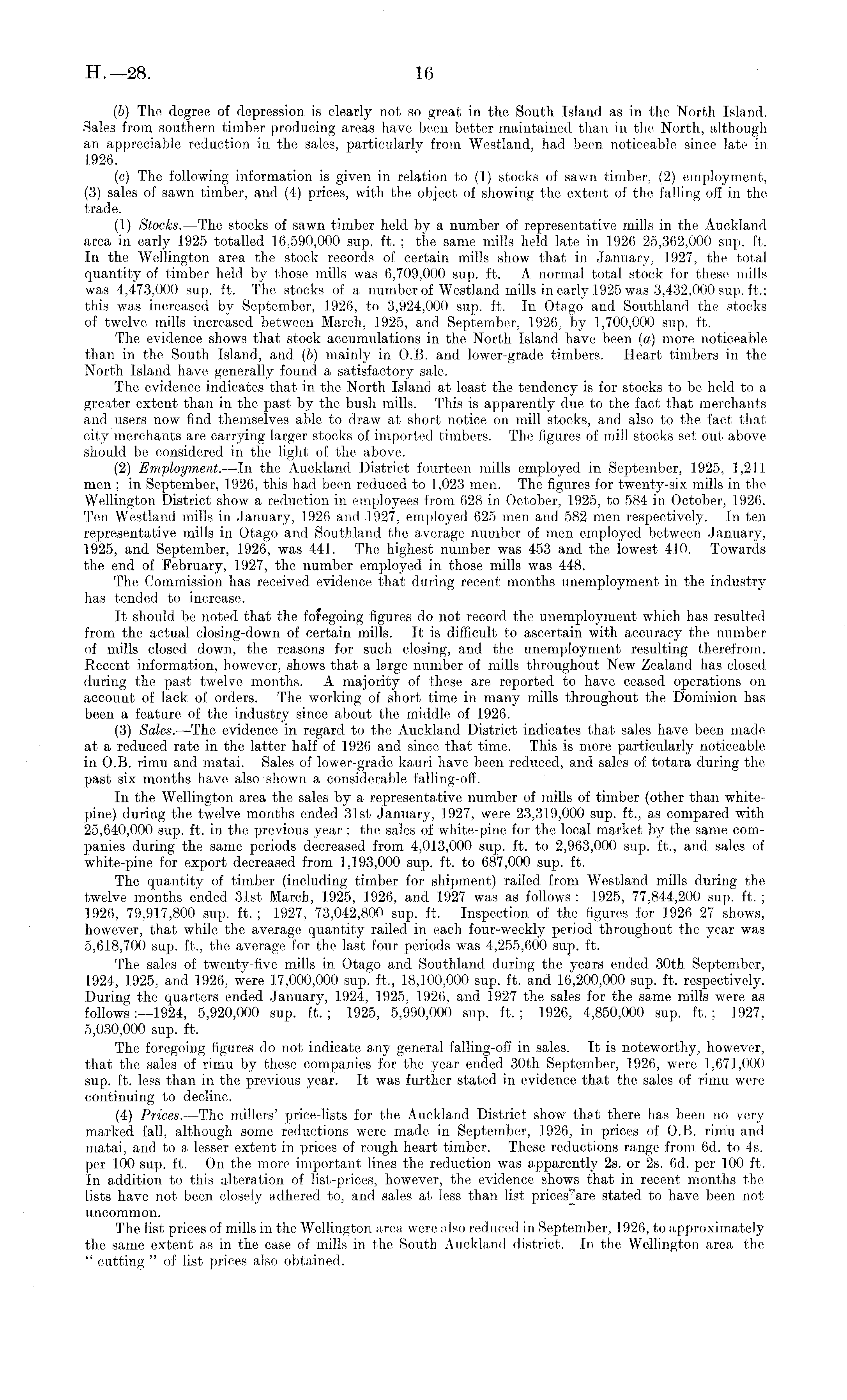 (b) The degree of depression is clearly not so great in the South Island as in the North Island. Sales from southern timber producing areas have been better maintained than in the North, although an appreciable reduction in the sales, particularly from Westland, had been noticeable since late in 1926. (c) The following information is given in relation to (1) stocks of sawn timber, (2) employment, (3) sales of sawn timber, and (4) prices, with the object of showing the extent of the falling off in the trade. (1) Stocks.—The stocks of sawn timber held by a number of representative mills in the Auckland area in early 1925 totalled 16,590,000 sup. ft. ; the same mills held late in 1926 25,362,000 sup. ft. In the Wellington area the stock records of certain mills show that in January, 1927, the total quantity of timber held by those mills was 6,709,000 sup. ft. A normal total stock for these mills was 4,473,000 sup. ft. The stocks of a number of Westland mills in early 1925 was 3,432,000 sup. ft.; this was increased by September, 1926, to 3,924,000 sup. ft. In Otago and Southland the stocks of twelve mills increased between March, 1925, and September, 1926. by 1,700,000 sup. ft. The evidence shows that stock accumulations in the North Island have been (a) more noticeable than in the South Island, and (b) mainly in 0.8. and lower-grade timbers. Heart timbers in the North Island have generally found a satisfactory sale. The evidence indicates that in the North Island at least the tendency is for stocks to be held to a greater extent than in the past by the bush mills. This is apparently due to the fact that merchants and users now find themselves able to draw at short notice on mill stocks, and also to the fact that city merchants are carrying larger stocks of imported timbers. The figures of mill stocks set out above should be considered in the light of the above. (2) Employment.—ln the Auckland District fourteen mills employed in September, 1925, 1,211 men ; in September, 1926, this had been reduced to 1,023 men. The figures for twenty-six mills in the Wellington District show a reduction in employees from 628 in October, 1925, to 584 in October, 1926. Ten Westland mills in January, 1926 and 1927, employed 625 men and 582 men respectively. In ten representative mills in Otago and Southland the average number of men employed between January, 1925, and September, 1926, was 441. The highest number was 453 and the lowest 410. Towards the end of February, 1927, the number employed in those mills was 448. The Commission has received evidence that during recent months unemployment in the industry has tended to increase. It should be noted that the foregoing figures do not record the unemployment which has resulted from the actual closing-down of certain mills. It is difficult to ascertain with accuracy the number of mills closed down, the reasons for such closing, and the unemployment resulting therefrom. Recent information, however, shows that a large number of mills throughout New Zealand has closed during the past twelve months. A majority of these are reported to have ceased operations on account of lack of orders. The working of short time in many mills throughout the Dominion has been a feature of the industry since about the middle of 1926. (3) Sales. —The evidence in regard to the Auckland District indicates that sales have been made at a reduced rate in the latter half of 1926 and since that time. This is more particularly noticeable in 0.8. rimu and matai. Sales of lower-grade kauri have been reduced, and sales of totara during the past six months have also shown a considerable falling-off. In the Wellington area the sales by a representative number of mills of timber (other than whitepine) during the twelve months ended 31st January, 1927, were 23,319,000 sup. ft., as compared with 25,640,000 sup. ft. in the previous year ; the sales of white-pine for the local market by the same companies during the same periods decreased from 4,013,000 sup. ft. to 2,963,000 sup. ft., and sales of white-pine for export decreased from 1,193,000 sup. ft. to 687,000 sup. ft. The quantity of timber (including timber for shipment) railed from Westland mills during the twelve months ended 31st March, 1925, 1926, and 1927 was as follows : 1925, 77,844,200 sup. ft. ; 1926, 79,917,800 sup. ft. ; 1927, 73,042,800 sup. ft. Inspection of the figures for 1926-27 shows, however, that while the average quantity railed in each four-weekly period throughout the year was 5,618,700 sup. ft., the average for the last four periods was 4,255,600 sup. ft. The sales of twenty-five mills in Otago and Southland during the years ended 30th September, 1924, 1925, and 1926, were 17,000,000 sup. ft., 18,100,000 sup. ft. and 16,200,000 sup. ft. respectively. During the quarters ended January, 1924, 1925, 1926, and 1927 the sales for the same mills were as follows 1924, 5,920,000 sup. ft. ; 1925, 5,990,000 sup. ft. ; 1926, 4,850,000 sup. ft.; 1927, 5,030,000 sup. ft. The foregoing figures do not indicate a.ny general falling-off in sales. It is noteworthy, however, that the sales of rimu by these companies for the year ended 30th September, 1926, were 1,671,000 sup. ft. less than in the previous year. It was further stated in evidence that the sales of rimu were continuing to decline. (4) Prices. —The millers' price-lists for the Auckland District show that there has been no very marked fall, although some reductions were made in September, 1926, in prices of 0.8. rimu and matai, and to a lesser extent in prices of rough heart timber. These reductions range from 6d. to 4s. per 100 sup. ft. On the more important lines the reduction was apparently 2s. or 2s. 6d. per 100 ft. In addition to this alteration of list-prices, however, the evidence shows that in recent months the lists have not been closely adhered to, and sales at less than list stated to have been not uncommon. The list prices of mills in the Wellington area were also