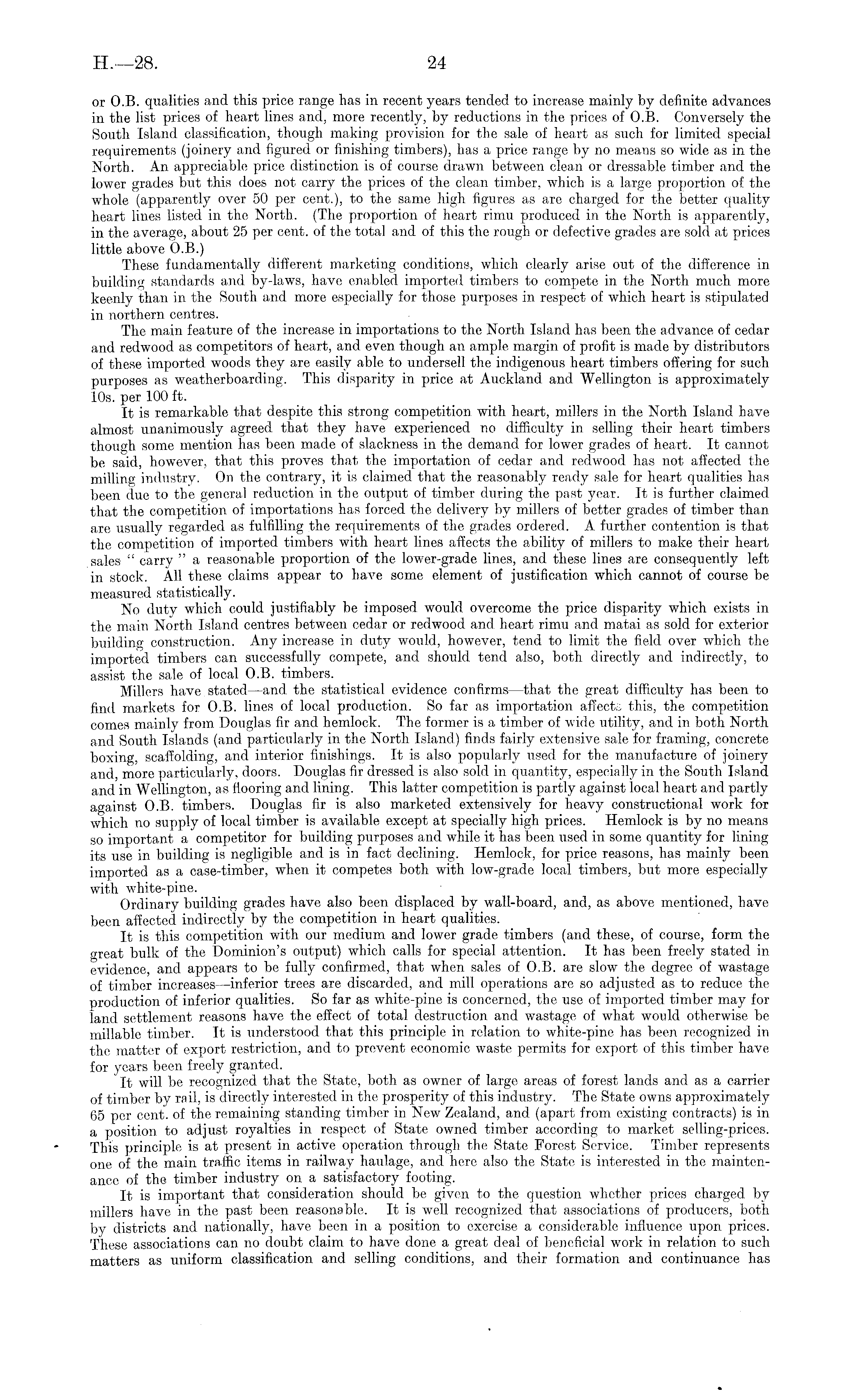 or 0.8. qualities and this price range has in recent years tended to increase mainly by definite advances in the list prices of heart lines and, more recently, by reductions in the prices of 0.8. Conversely the South Island classification, though making provision for the sale of heart as such for limited special requirements (joinery and figured or finishing timbers), has a price range by no means so wide as in the North. An appreciable price distinction is of course drawn between clean or dressable timber and the lower grades but this does not carry the prices of the clean timber, which is a large proportion of the whole (apparently over 50 per cent.), to the same high figures as are charged for the better quality heart lines listed in the North. (The proportion of heart rimu produced in the North is apparently, in the average, about 25 per cent, of the total and of this the rough or defective grades are sold at prices little above O.B.) These fundamentally different marketing conditions, which clearly arise out of the difference in building standards and by-laws, have enabled imported timbers to compete in the North much more keenly than in the South and more especially for those purposes in respect of which heart is stipulated in northern centres. The main feature of the increase in importations to the North Island has been the advance of cedar and redwood as competitors of heart, and even though an ample margin of profit is made by distributors of these imported woods they are easily able to undersell the indigenous heart timbers offering for such purposes as weatherboarding. This disparity in price at Auckland and Wellington is approximately 10s. per 100 ft. It is remarkable that despite this strong competition with heart, millers in the North Island have almost unanimously agreed that they have experienced no difficulty in selling their heart timbers though some mention has been made of slackness in the demand for lower grades of heart. It cannot be said, however, that this proves that the importation of cedar and redwood has not affected the milling industry. On the contrary, it is claimed that the reasonably ready sale for heart qualities has been due to the general reduction in the output of timber during the past year. It is further claimed that the competition of importations has forced the delivery by millers of better grades of timber than are usually regarded as fulfilling the requirements of the grades ordered. A further contention is that the competition of imported timbers with heart lines affects the ability of millers to make their heart sales " carry " a reasonable proportion of the lower-grade lines, and these lines are consequently left in stock. All these claims appear to have some element of justification which cannot of course be measured statistically. No duty which could justifiably be imposed would overcome the price disparity which exists in the main North Island centres between cedar or redwood and heart rimu and matai as sold for exterior building construction. Any increase in duty would, however, tend to limit the field over which the imported timbers can successfully compete, and should tend also, both directly and indirectly, to assist the sale of local 0.8. timbers. Millers have stated —and the statistical evidence confirms—that the great difficulty has been to find markets for 0.8. lines of local production. So far as importation affects this, the competition comes mainly from Douglas fir and hemlock. The former is a timber of wide utility, and in both North and South Islands (and particularly in the North Island) finds fairly extensive sale for framing, concrete boxing, scaffolding, and interior finishings. It is also popularly used for the manufacture of joinery and, more particularly, doors. Douglas fir dressed is also sold in quantity, especially in the South Island and in Wellington, as flooring and lining. This latter competition is partly against local heart and partly against 0.8. timbers. Douglas fir is also marketed extensively for heavy constructional work for which no supply of local timber is available except at specially high prices. Hemlock is by no means so important a competitor for building purposes and while it has been used in some quantity for lining its use in building is negligible and is in fact declining. Hemlock, for price reasons, has mainly been imported as a case-timber, when it competes both with low-grade local timbers, but more especially with white-pine. Ordinary building grades have also been displaced by wall-board, and, as above mentioned, have been affected indirectly by the competition in heart qualities. It is this competition with our medium and lower grade timbers (and these, of course, form the great bulk of the Dominion's output) which calls for special attention. It has been freely stated in evidence, and appears to be fully confirmed, that when sales of 0.8. are slow the degree of wastage of timber increases—inferior trees are discarded, and mill operations are so adjusted as to reduce the production of inferior qualities. So far as white-pine is concerned, the use of imported timber may for land settlement reasons have the effect of total destruction and wastage of what would otherwise be millable timber. It is understood that this principle in relation to white-pine has been recognized in the matter of export restriction, and to prevent economic waste permits for export of this timber have for years been freely granted. It will be recognized that the State, both as owner of large areas of forest lands and as a carrier of timber by rail, is directly interested in the prosperity of this industry. The State owns approximately 65 per cent, of the remaining standing timber in New Zealand, and (apart from existing contracts) is in a position to adjust royalties in respect of State owned timber according to market selling-prices. This principle is at present in active operation through the State Forest Serv